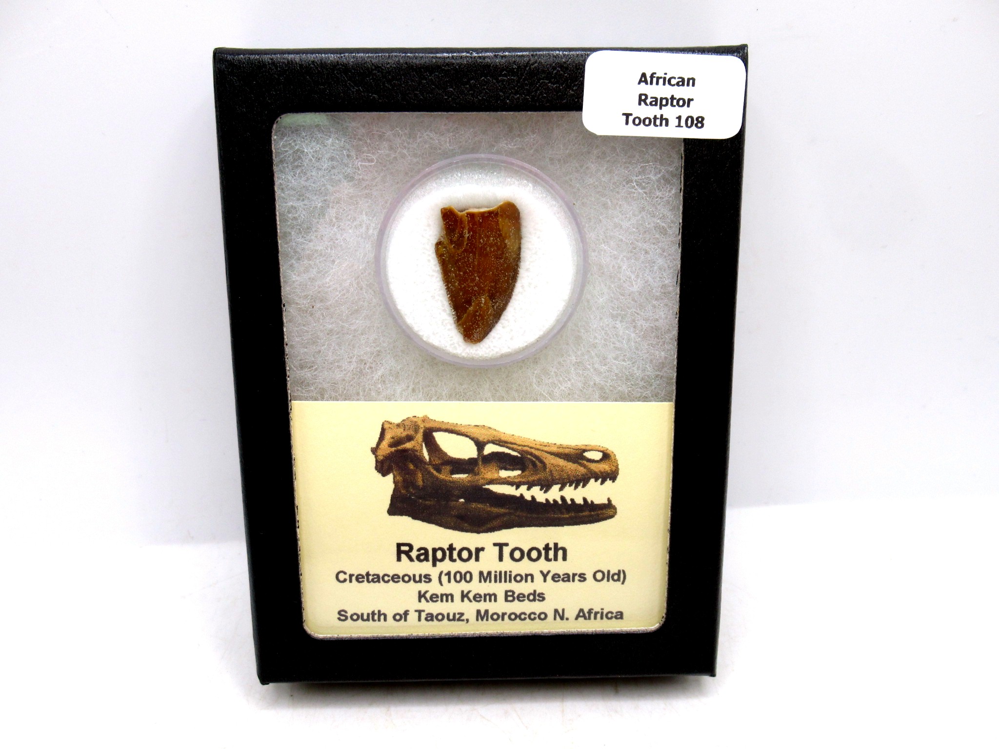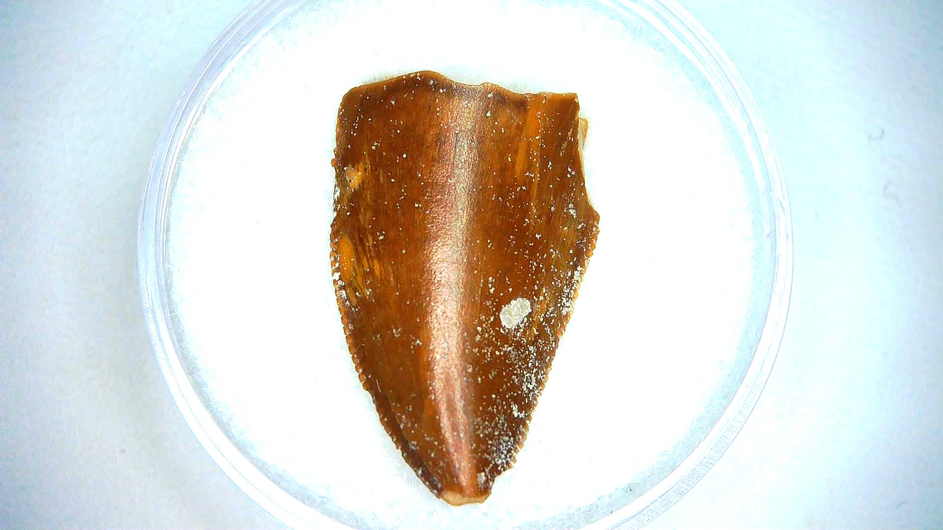 - This top quality .96″ long dinosaur tooth has nice enamel & sharp serrations. It will come in the 3.25″ x 4.25″ Riker Mount with Label as shown.