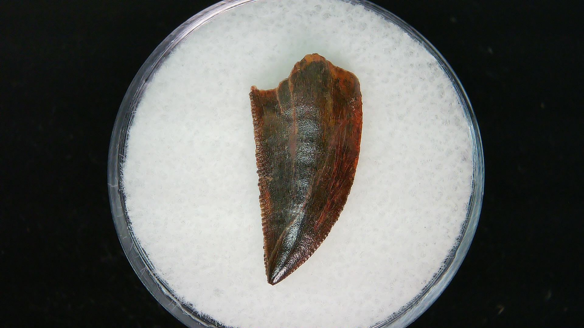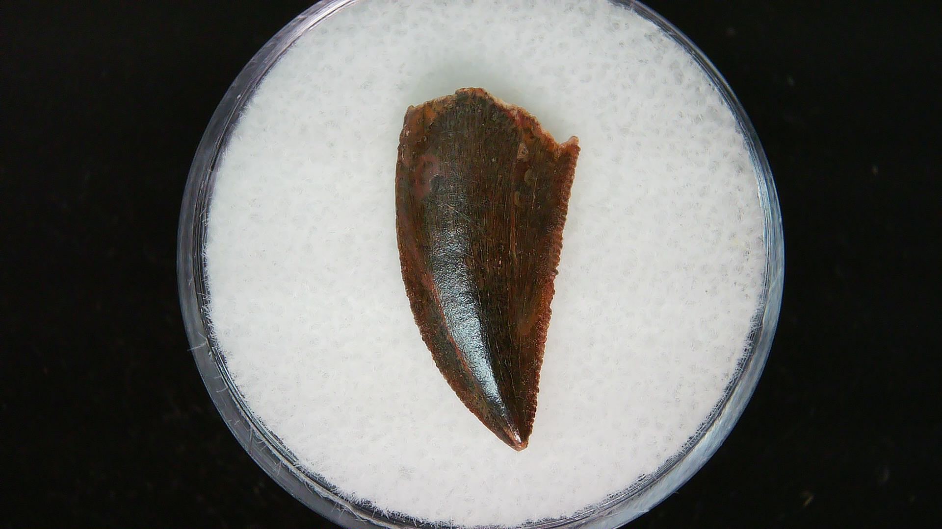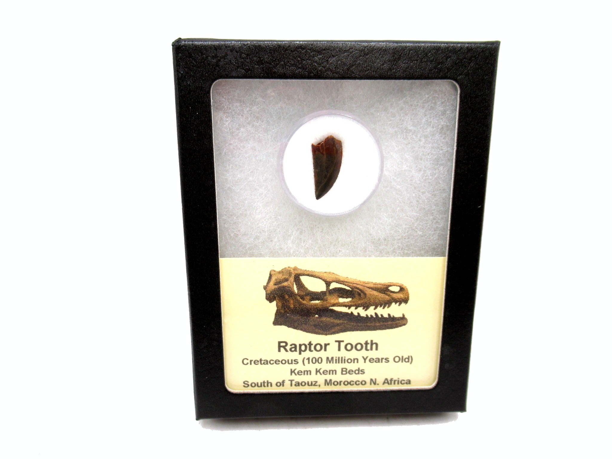 - This top quality .67″ dinosaur tooth has nice enamel & sharp serrations. It will come in the 3.25″ x 4.25″ Riker Mount with Label as shown.