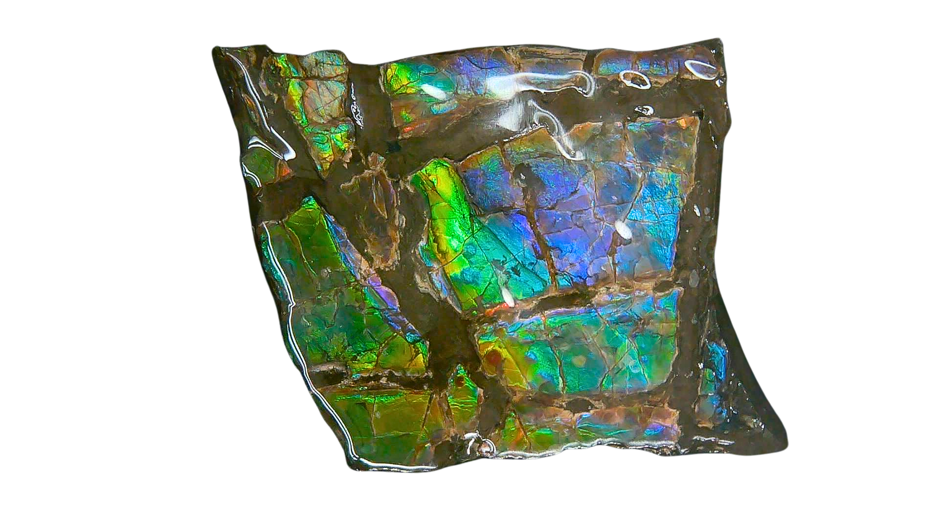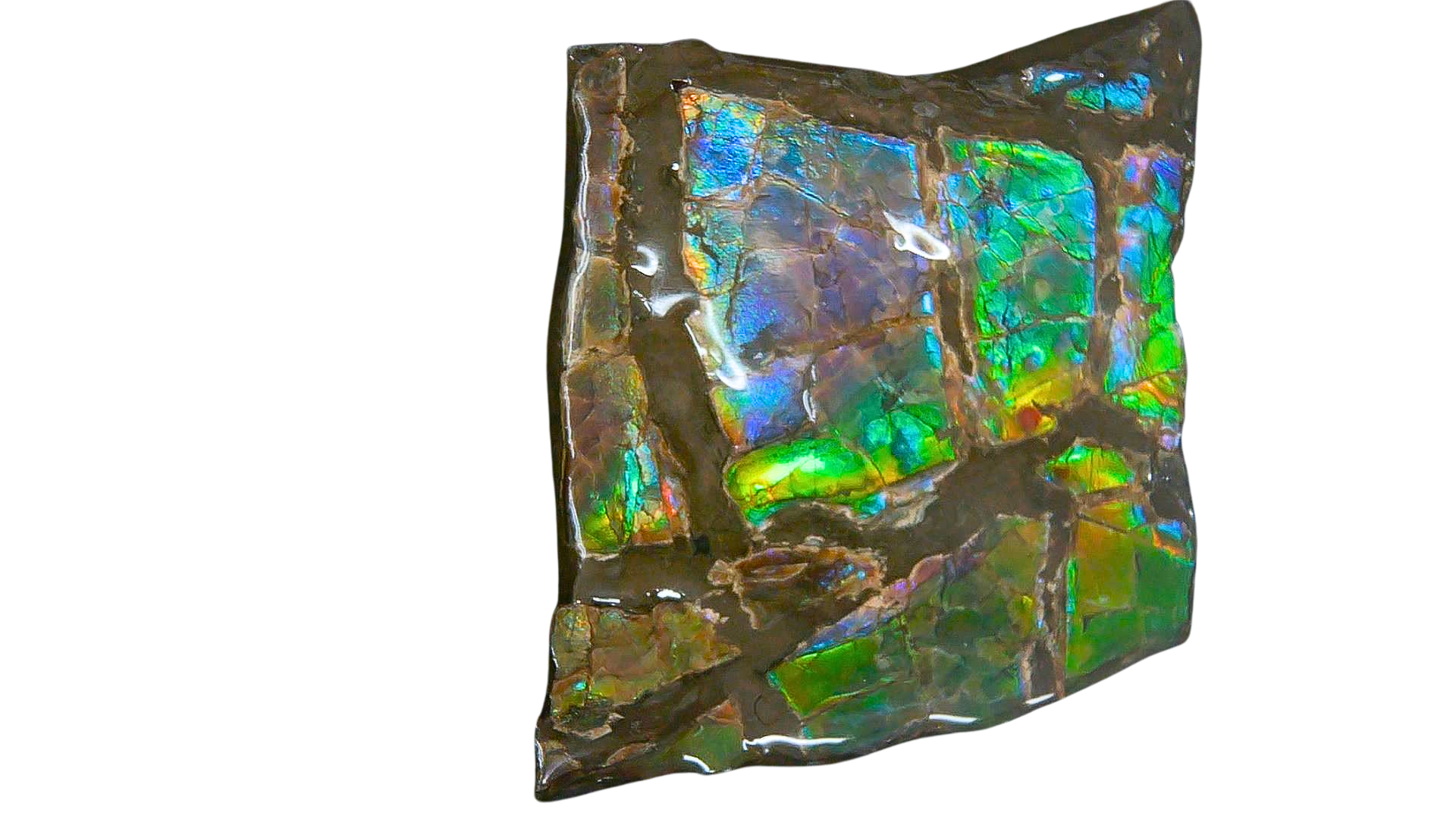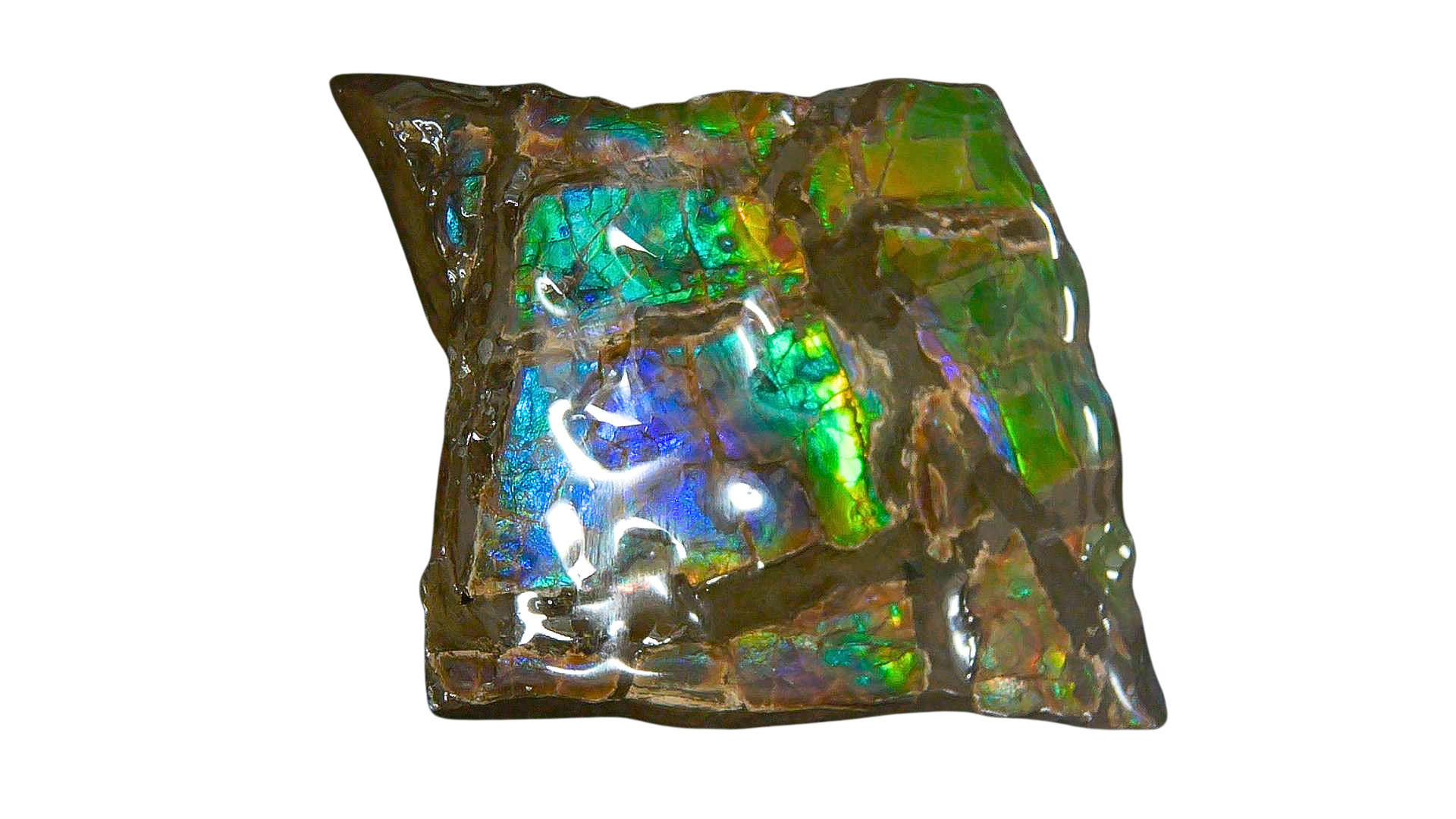Ammolite – A RARE gemstone material that forms on the outer shell of certain ammonites. This makes these specimens both Fossils as well as Gemstones! It displays brilliant iridescent colors, much like opal or mother-of-pearl. Colors – Red and green are most common, but rare blues and purples are highly prized.