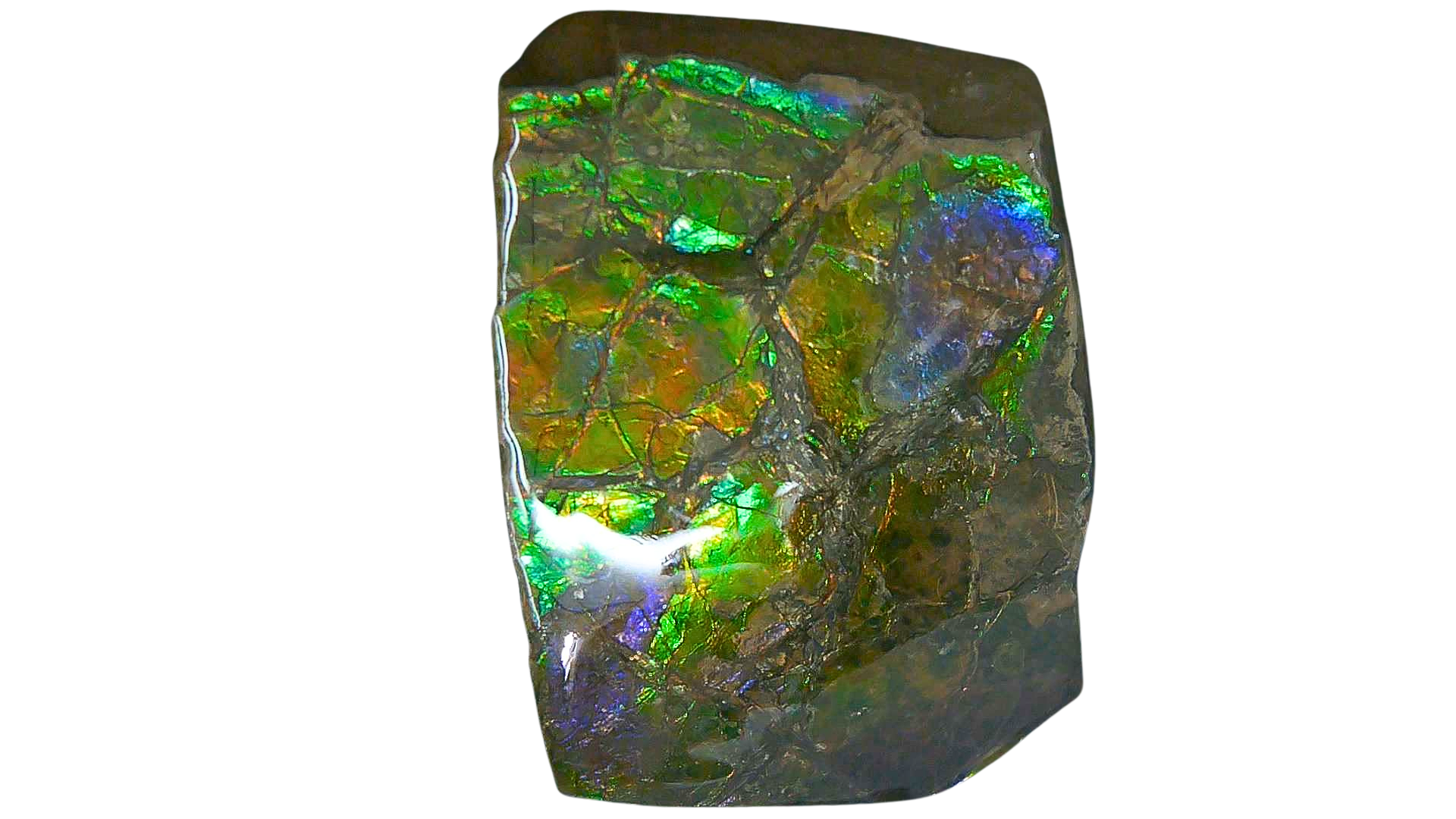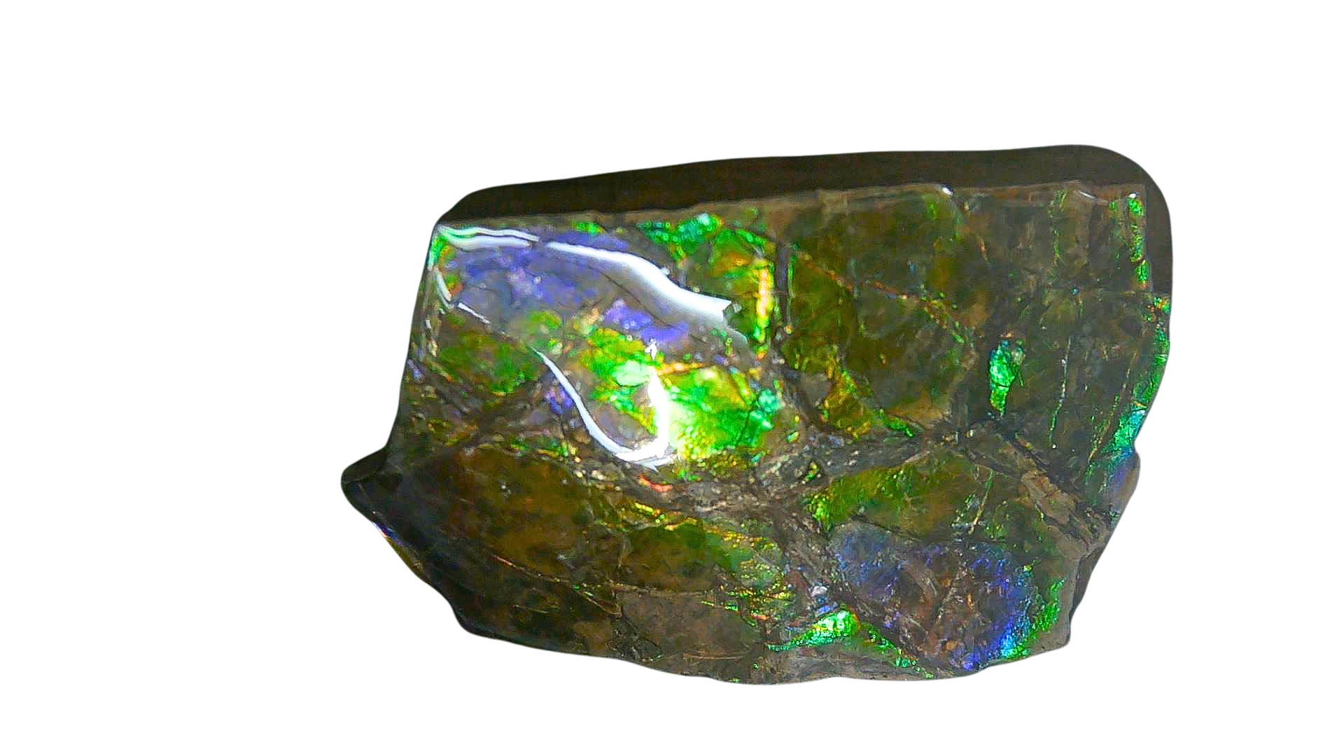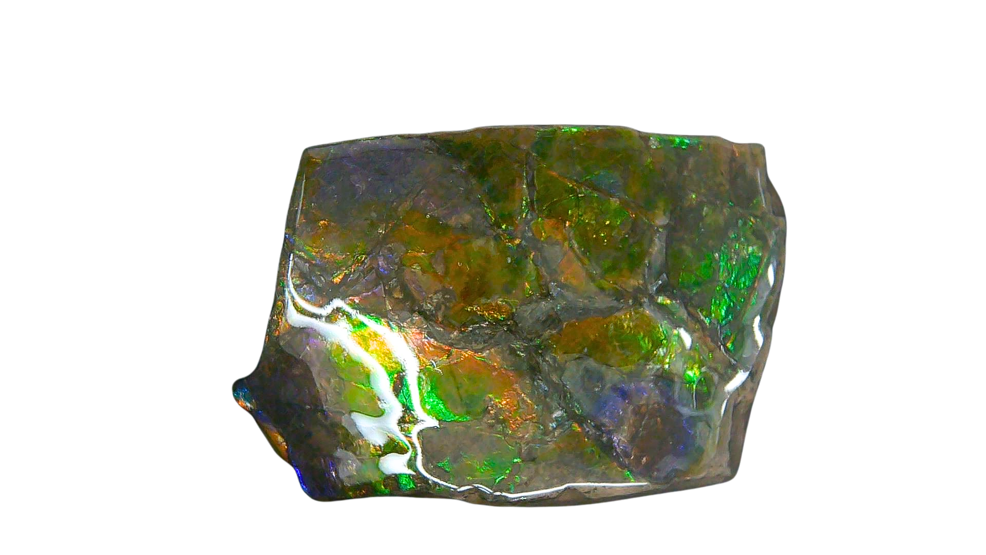 Ammolite – A RARE gemstone material that forms on the outer shell of certain ammonites. This makes these specimens both Fossils as well as Gemstones! It displays brilliant iridescent colors, much like opal or mother-of-pearl. Colors – Red and green are most common, but rare blues and purples are highly prized.
