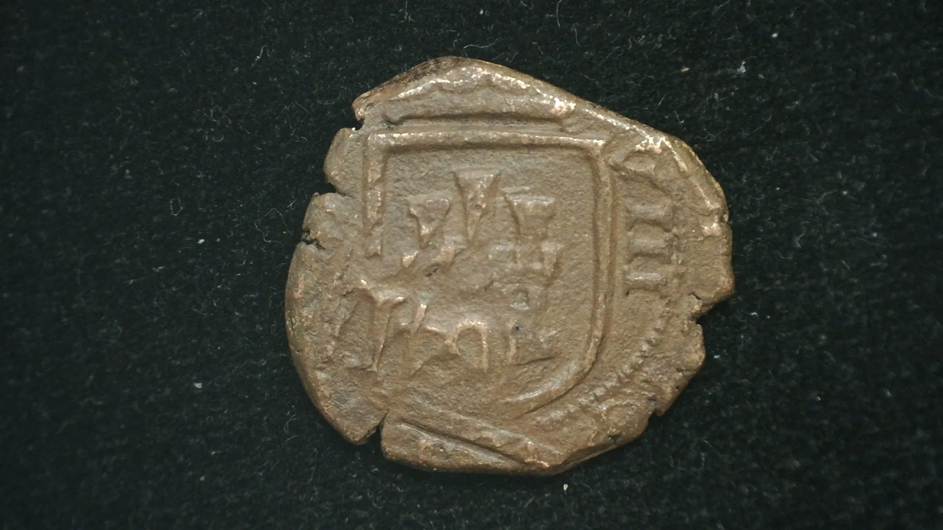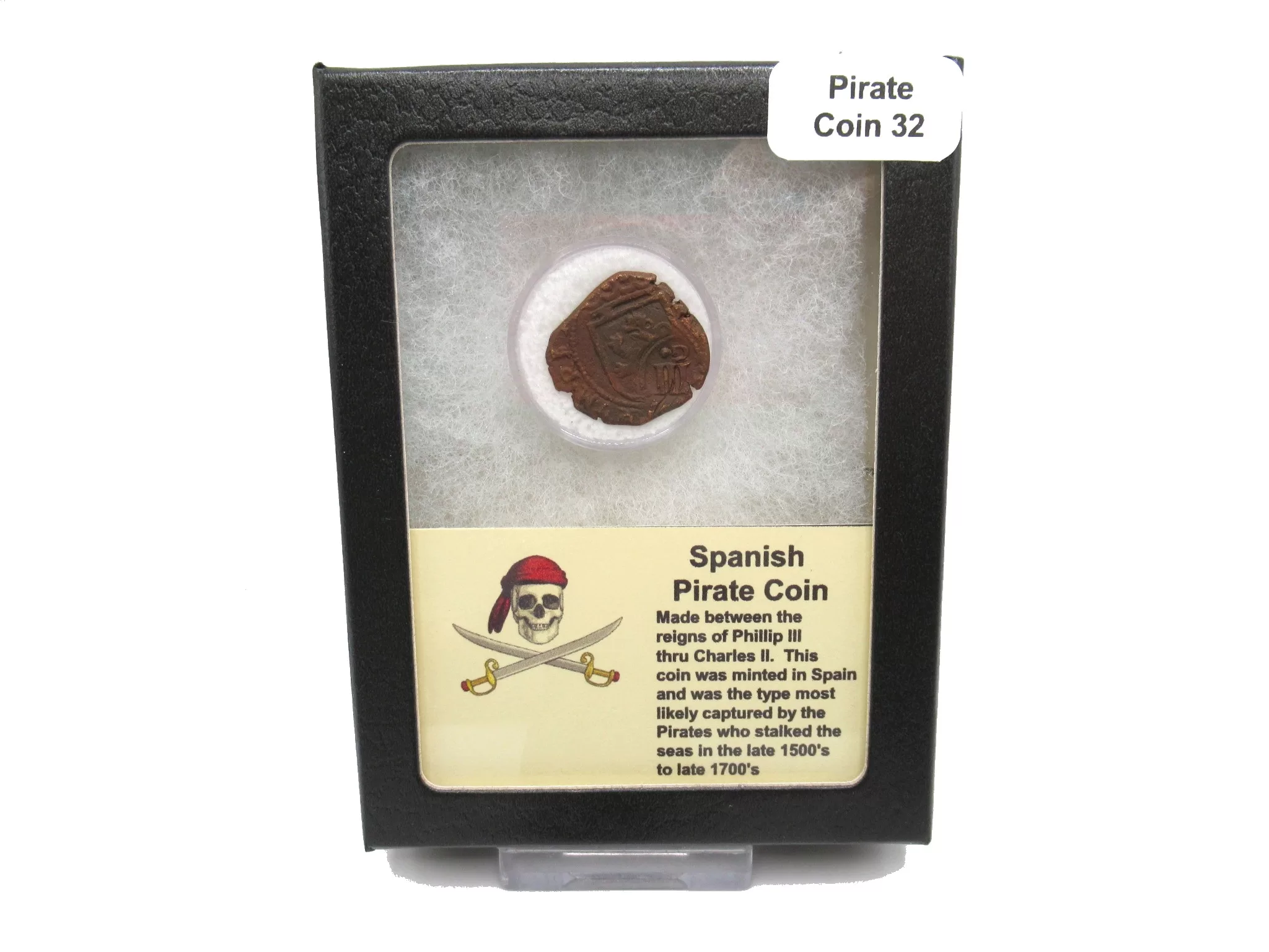 Spanish Pirate Coin   |  Made between the reigns of Phillip III thru Charles II. Each coin was minted in Spain and was the type most likely captured by the Pirates who stalked the seas in the late 1500’s to late 1700’s   On many examples from that period, the coins were over-stamped by the successive  King to obliterate the memory of the previous King.  But it was also practical to use existing coins rather than having to get new stock and start from scratch.  These coins were hand manufactured by cutting blanks from crudely cast bars or rods of refined copper, bronze or silver.  Those blanks were then hand hammered between crudely engraved dies. Each coin is unique in shape and strike.