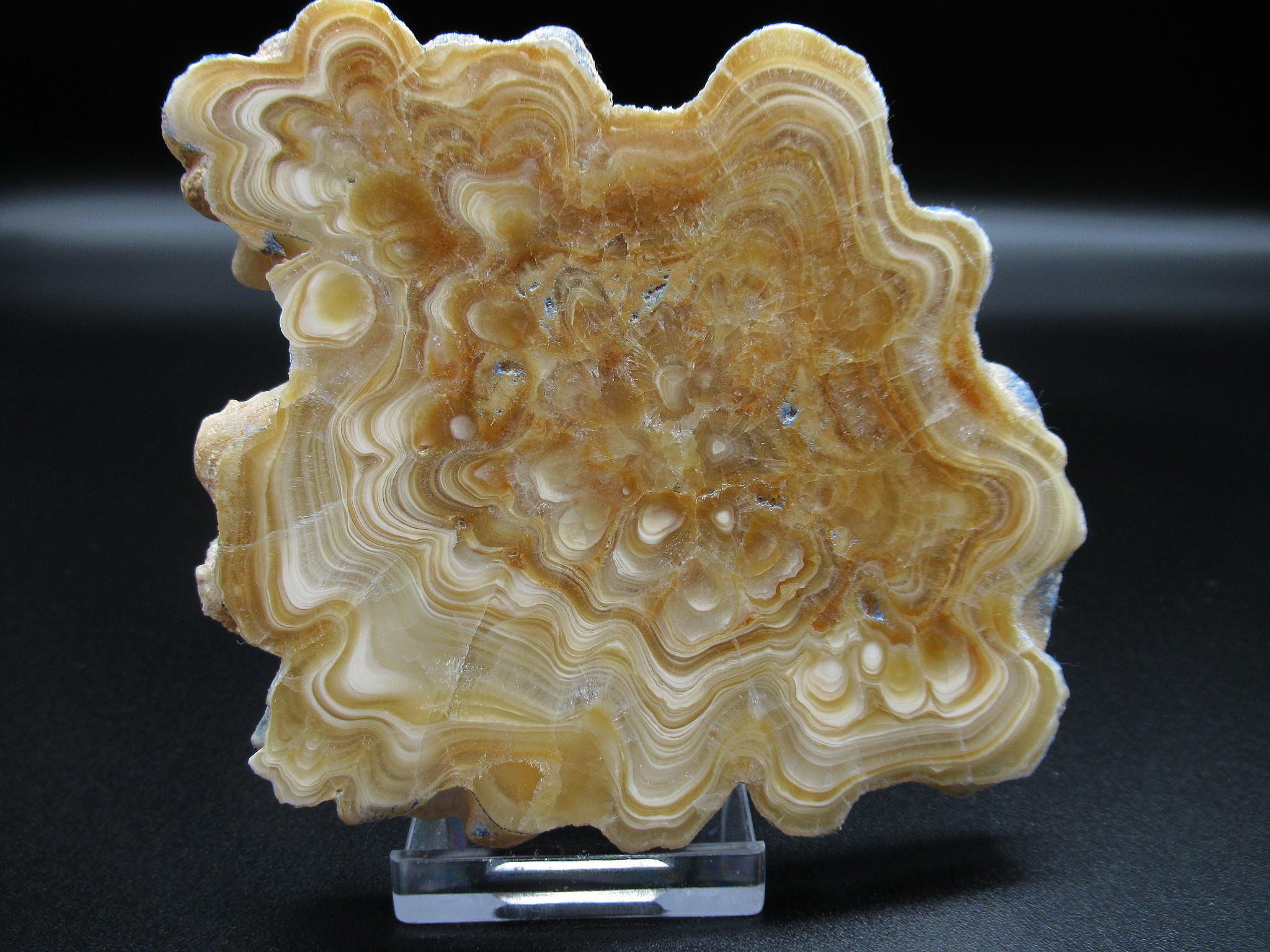 This is a polished slice of a stalactite from Morocco. Because both sides of this slice have been polished to bring out the beauty. Clearly the bands of white, tan and brown Aragonite as well as Calcite are stunning. In a nutshell, a stalactite is a mineral formation that hangs from the ceiling of caves and hot springs, as well as man-made structures such as bridges and mines. Likewise
