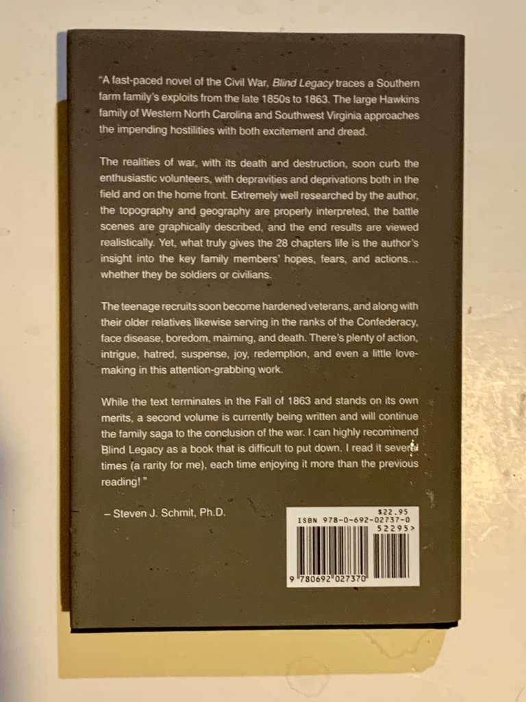 - Jake didn’t stand a chance. The hard life on a North Carolina tobacco farm under the hand of an unyielding, abusive father seasoned the boy with violence and hate, against the looming backdrop of the pending Civil War. Trading the hell at home for one in the trenches, Jake’s story is one of survival, revenge, tenderness, and anguish. Blind Legacy will carry the reader back to a time when idealism brought a nation to its knees. Though the history is already written, Blind Legacy weaves a timeless narrative that falls somewhere between the inspiration of Human will and the tragedy of the Human Condition.