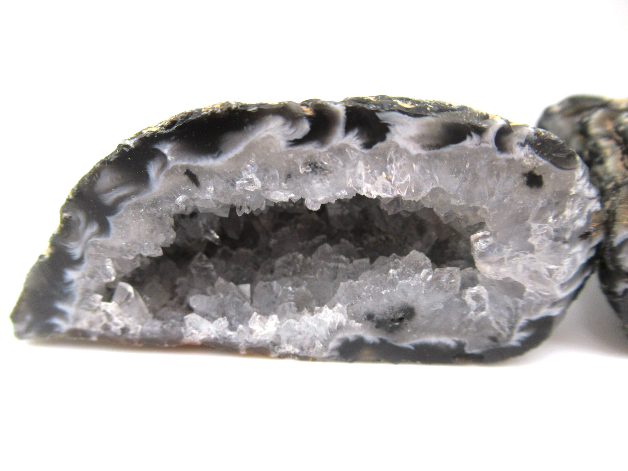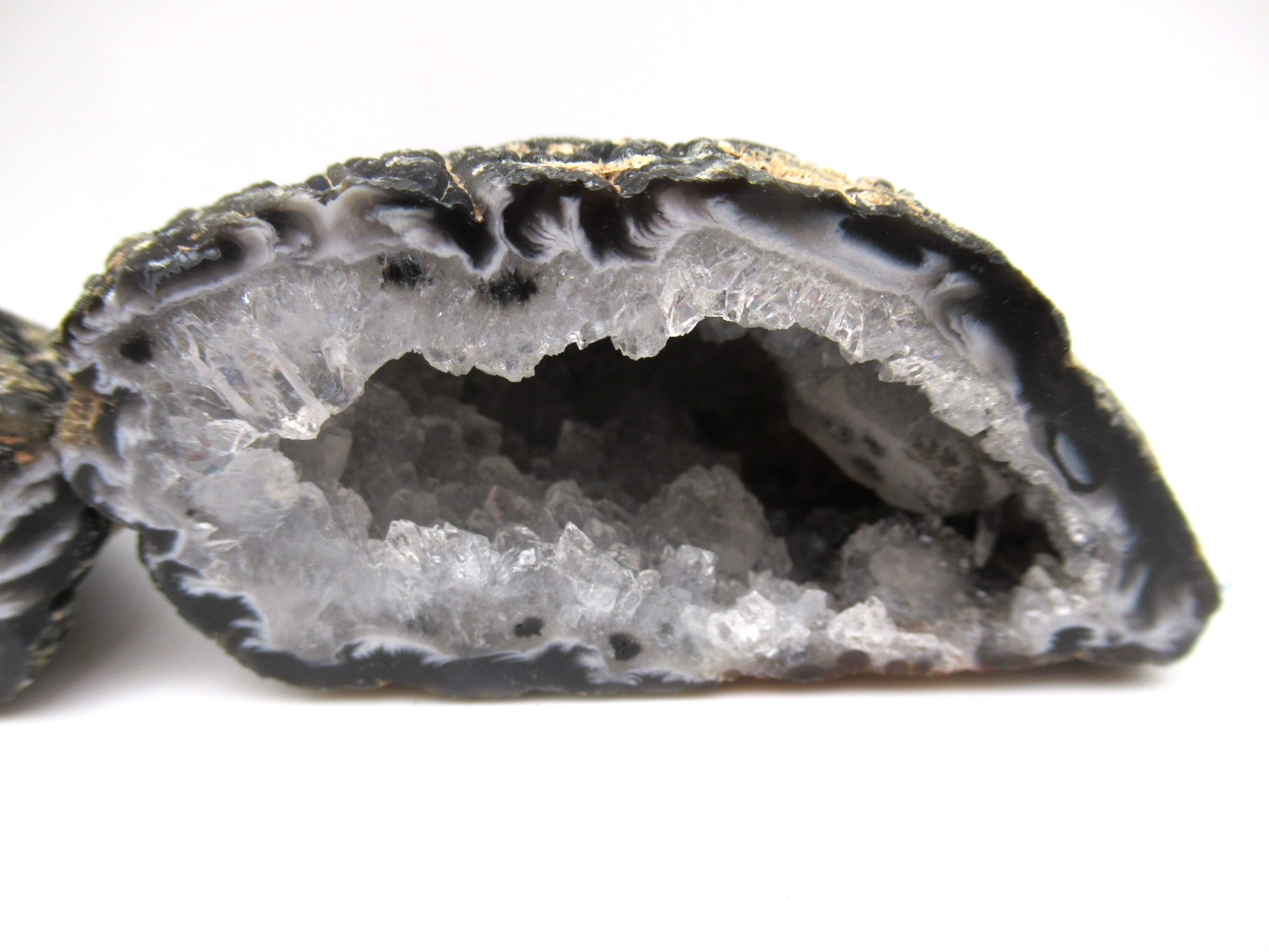 Then water entered the equation. Silica-rich water penetrated the cavities and ran through them, leaving behind the start of crystalline growth. The tiny crystals clung to the inner walls of the bubble. Thousands of years passed, then millions. Slowly, layers formed inside. First came agate, and then layers of quartz. Rock crystal grew larger with jagged points. Still buried deep inside the earth, radioactive minerals in the surround basalts began to decay. The geodes were irradiated, producing color centers in the quartz that transformed into colorful crystals like amethysts.