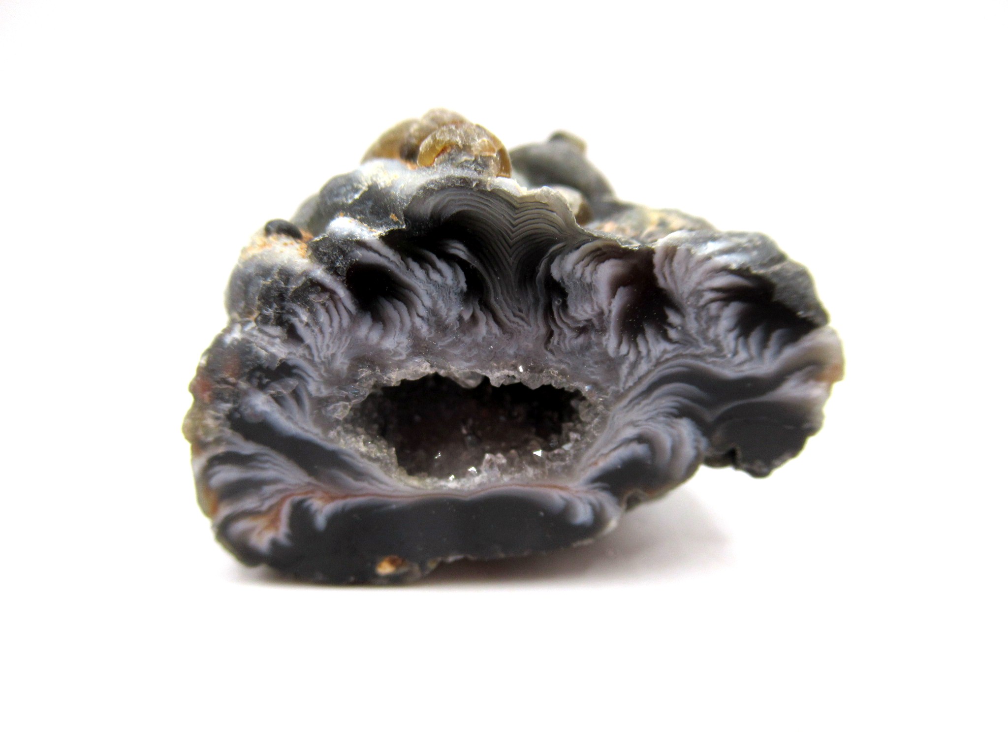 Then water entered the equation. Silica-rich water penetrated the cavities and ran through them, leaving behind the start of crystalline growth. The tiny crystals clung to the inner walls of the bubble. Thousands of years passed, then millions. Slowly, layers formed inside. First came agate, and then layers of quartz. Rock crystal grew larger with jagged points. Still buried deep inside the earth, radioactive minerals in the surround basalts began to decay. The geodes were irradiated, producing color centers in the quartz that transformed into colorful crystals such as amethysts.