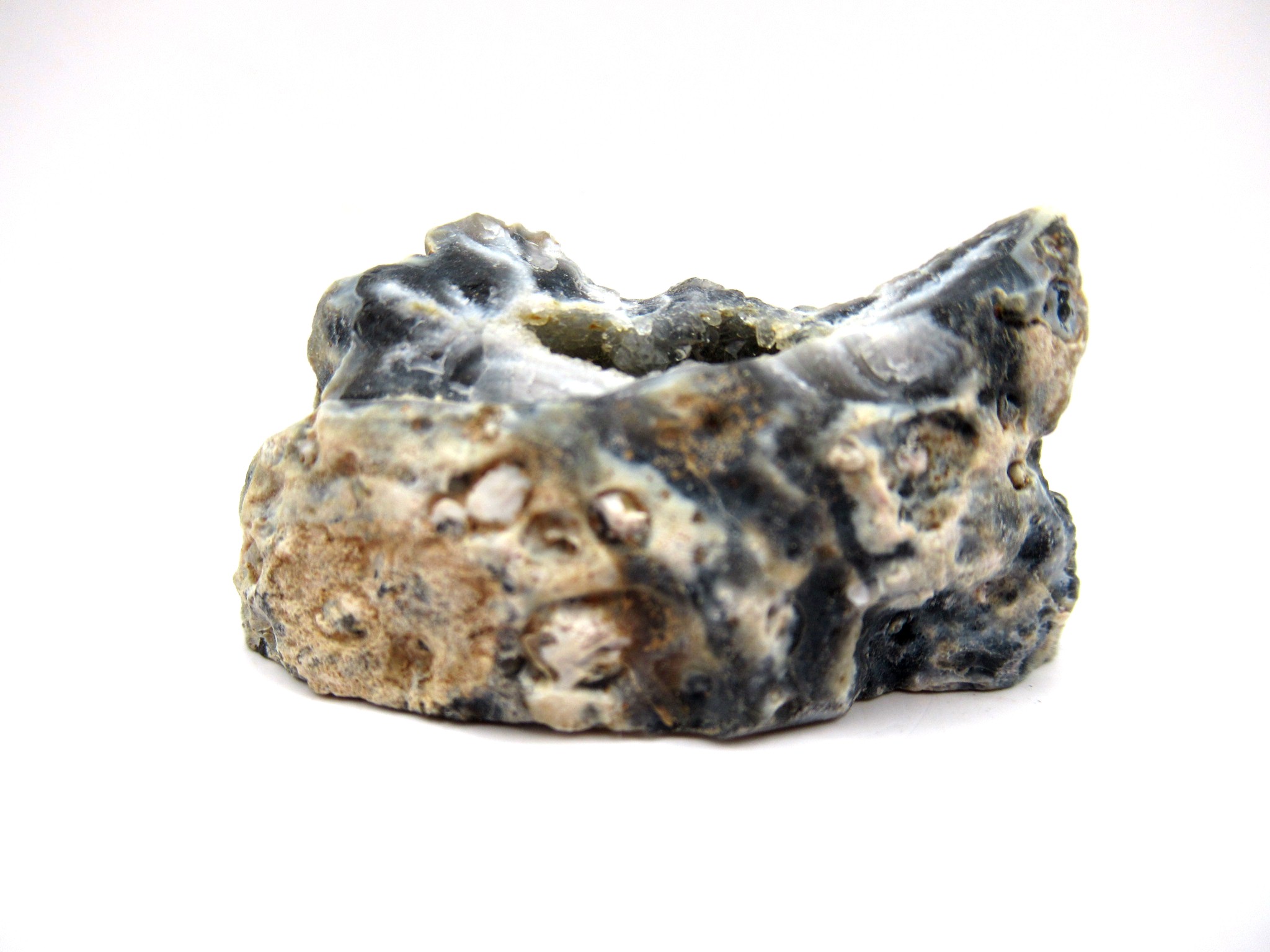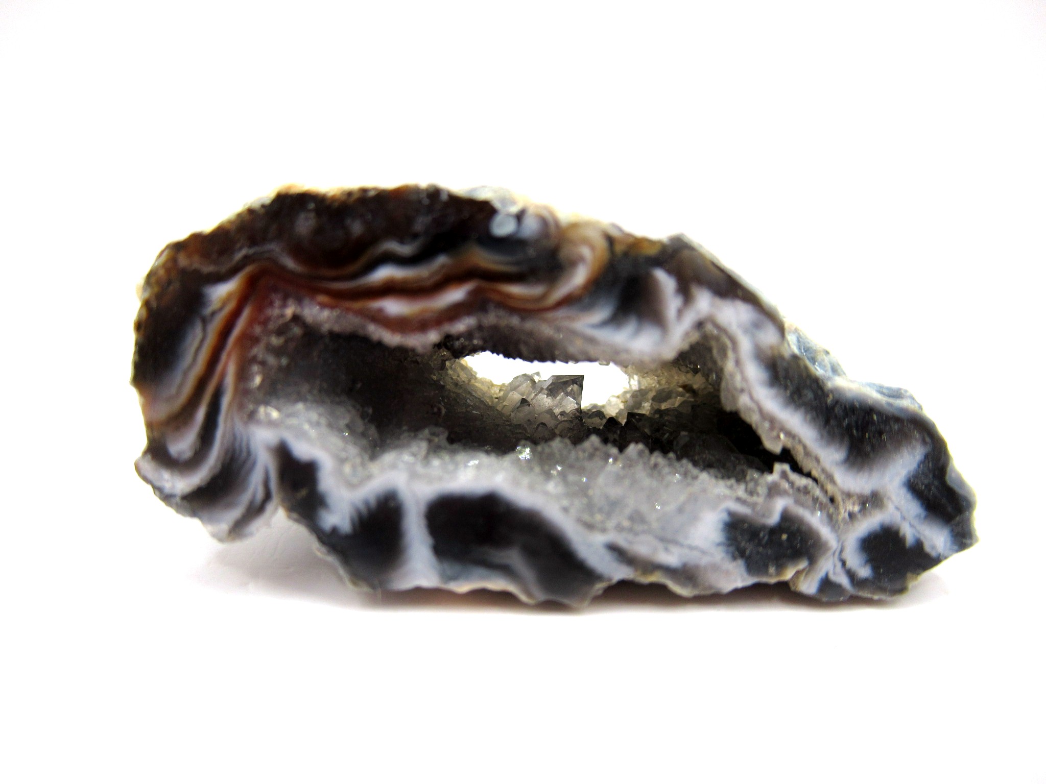 Then water entered the equation. Silica-rich water penetrated the cavities and ran through them, leaving behind the start of crystalline growth. The tiny crystals clung to the inner walls of the bubble. Thousands of years passed, then millions. Slowly, layers formed inside. First came agate, and then layers of quartz. Rock crystal grew larger with jagged points. Still buried deep inside the earth, radioactive minerals in the surround basalts began to decay. The geodes were irradiated, producing color centers in the quartz that transformed into colorful crystals such as amethysts.