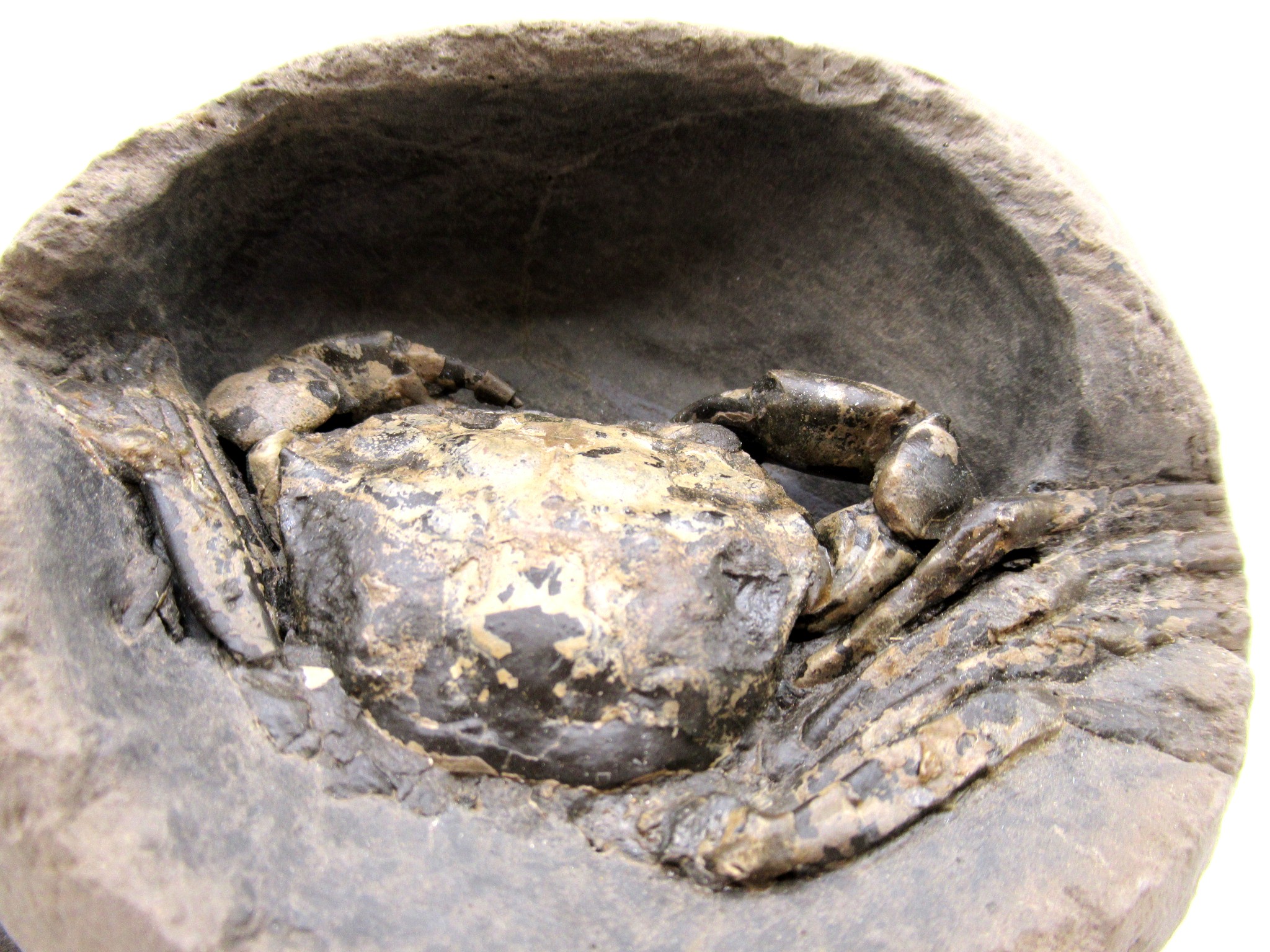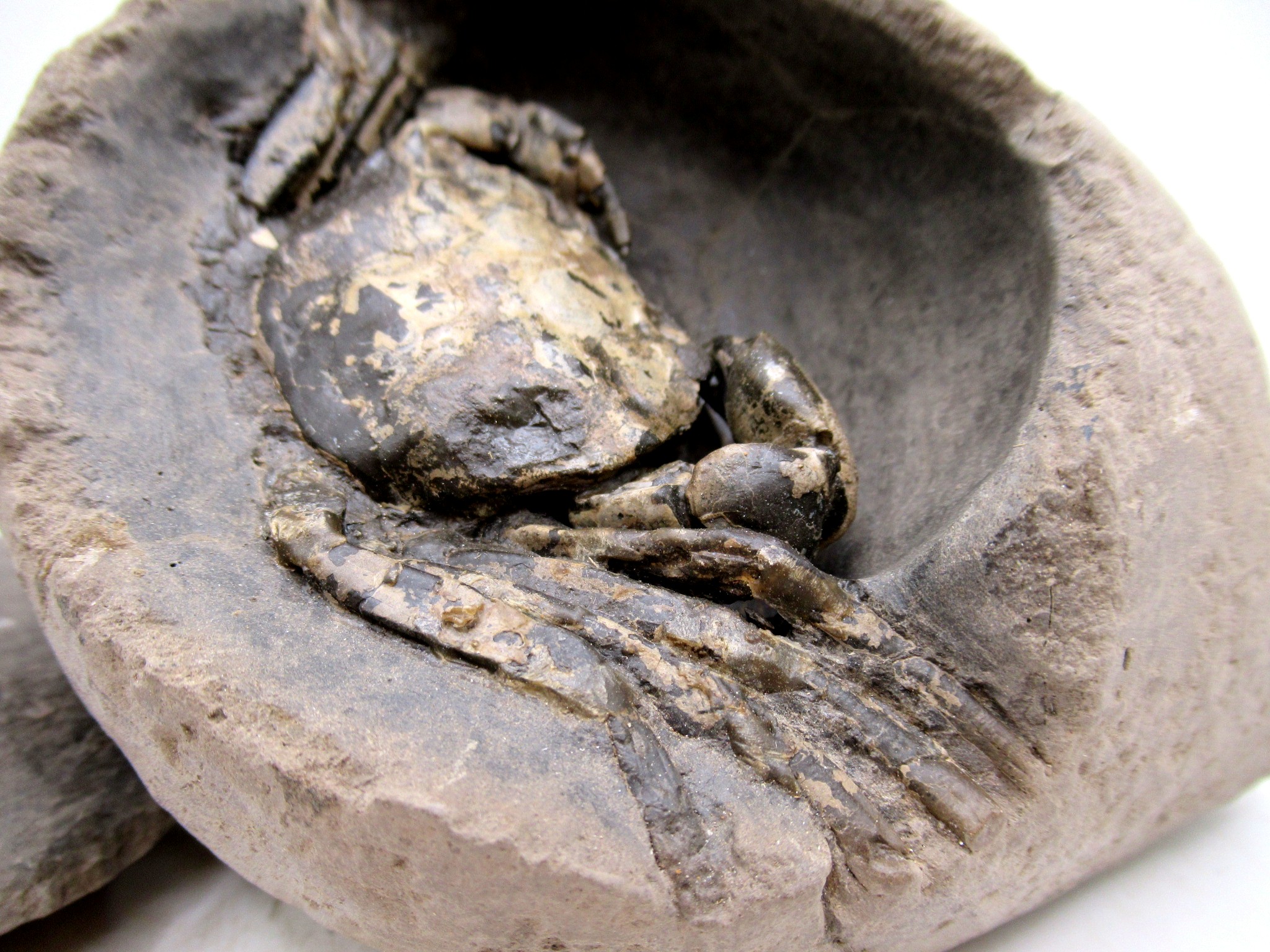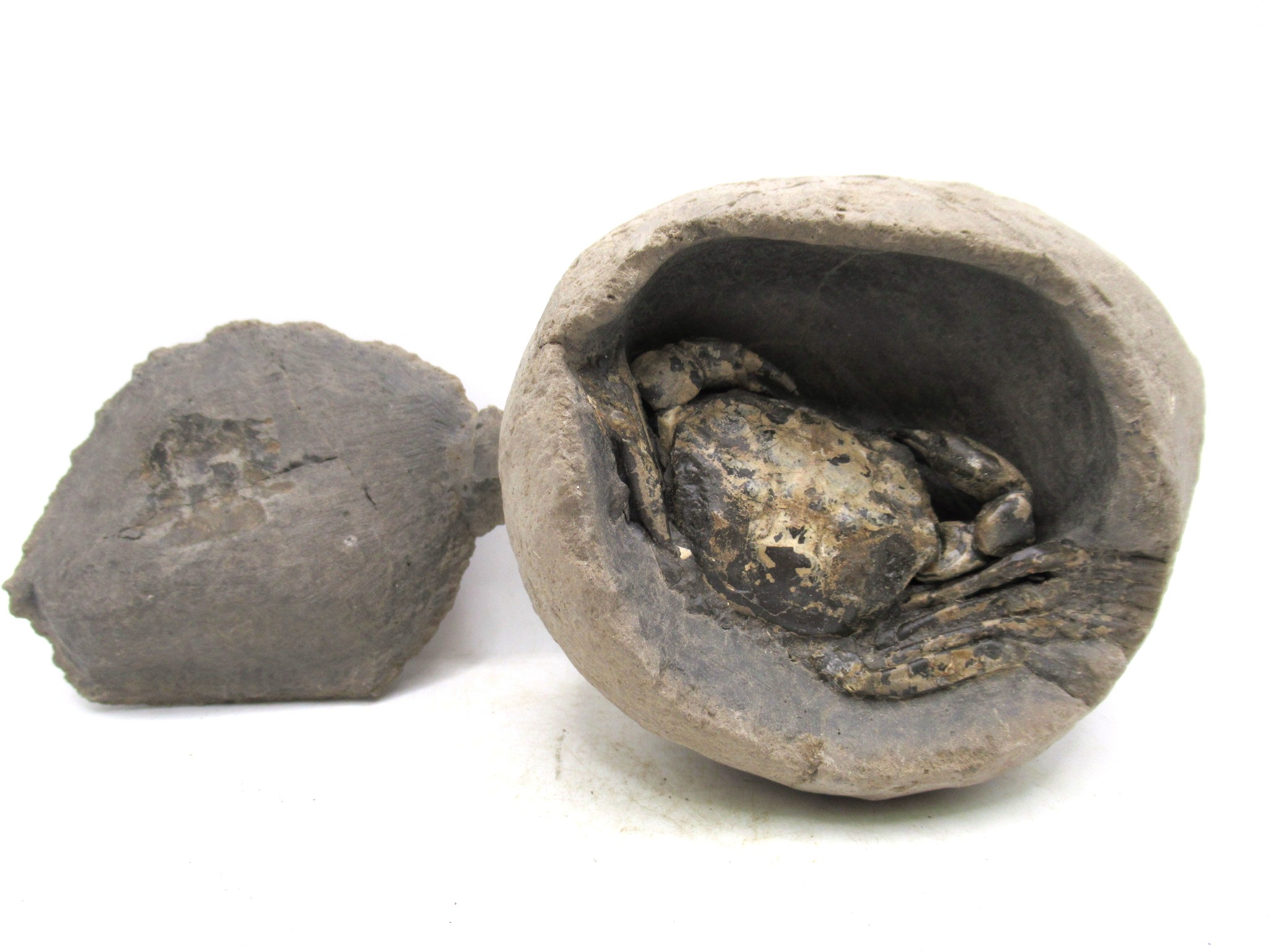 Fossil Coeloma Crab Nodules from Denmark are found along the Limfjords coast in the Jutland region. When conditions are just right, such as during winter or after heavy rains, the gray, round nodules are exposed in the clay and collected. The nodules are then cracked open to check for crabs inside. Only 1 out of 10 nodules contains anything worth preparing. Finally, the painstaking task of preparation begins. The nodule must be reassembled and repaired. Then air scribes and air abrasives are used to prepare the crabs. After many hours of work, the nodule is restored with a beautiful crab inside, with very little reconstruction needed.