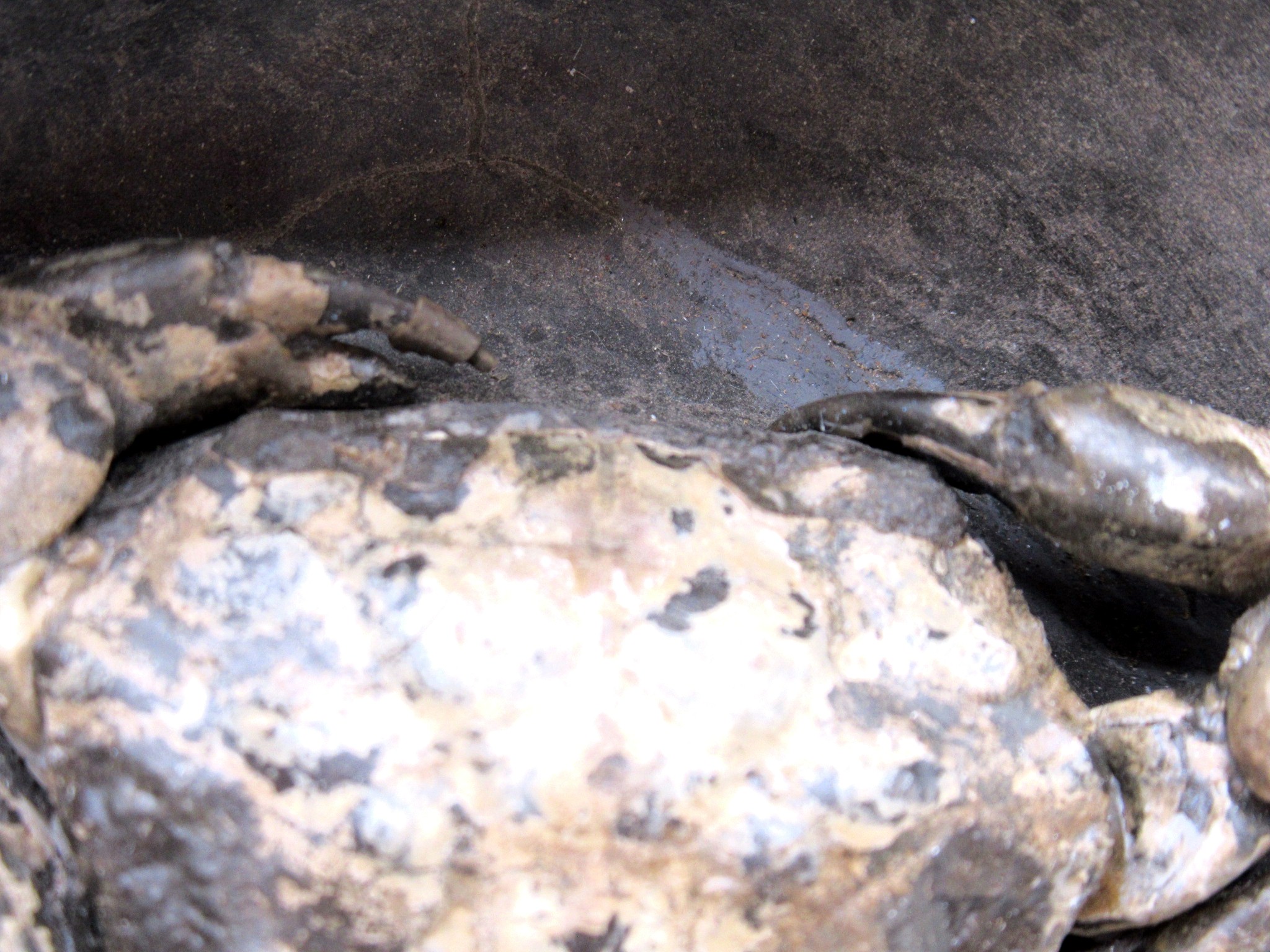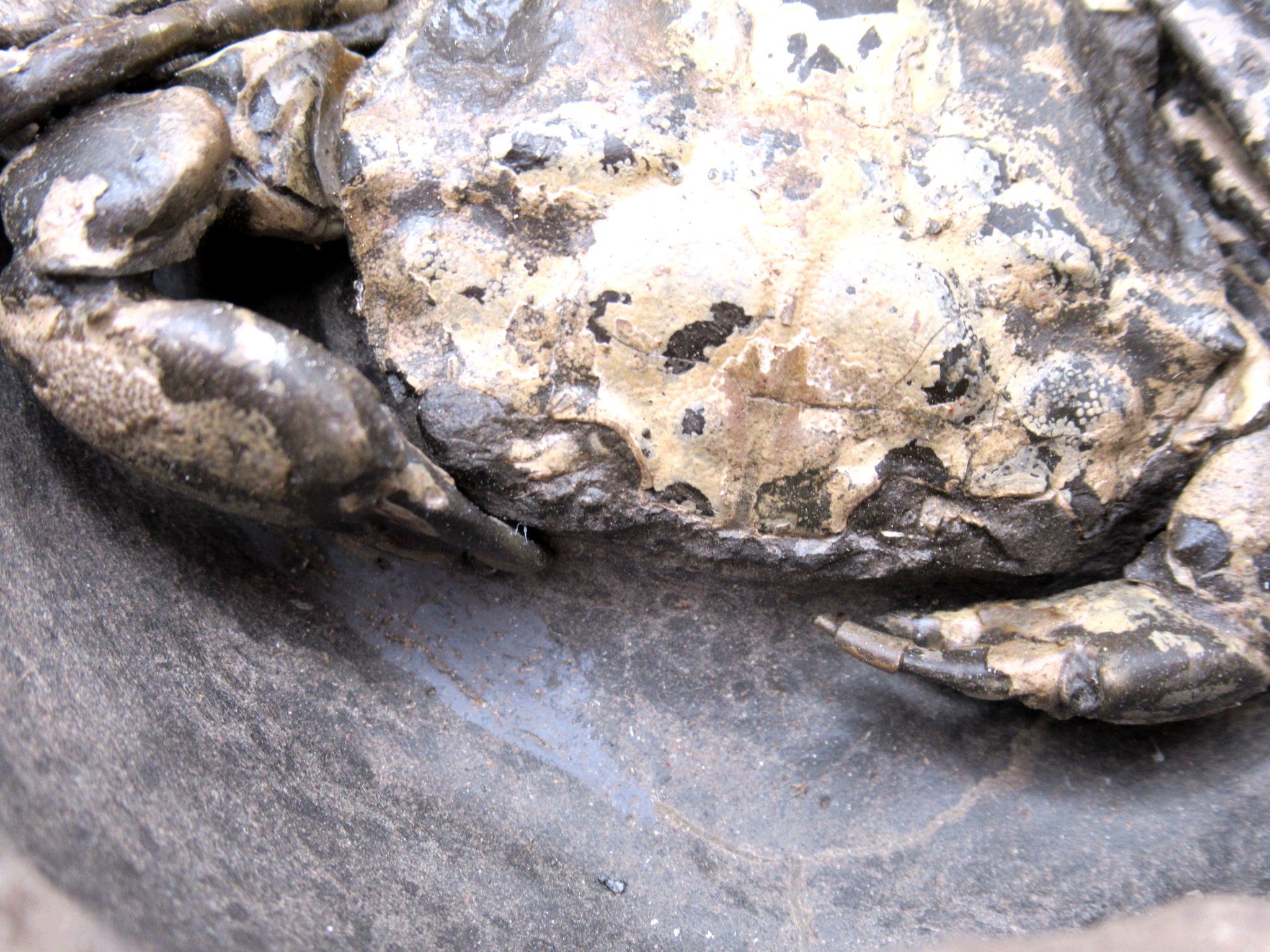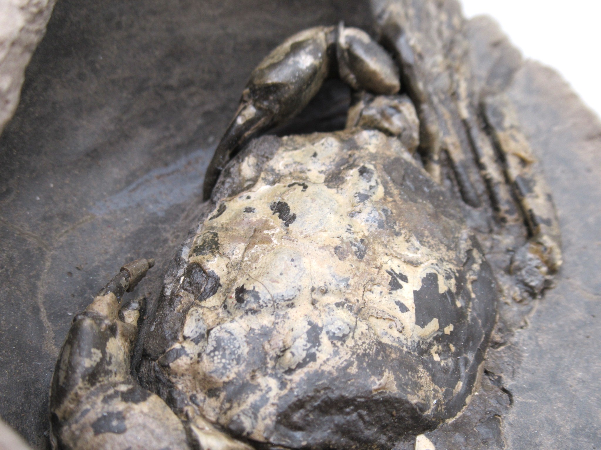 Fossil Coeloma Crab Nodules from Denmark are found along the Limfjords coast in the Jutland region. When conditions are just right, such as during winter or after heavy rains, the gray, round nodules are exposed in the clay and collected. The nodules are then cracked open to check for crabs inside. Only 1 out of 10 nodules contains anything worth preparing. Finally, the painstaking task of preparation begins. The nodule must be reassembled and repaired. Then air scribes and air abrasives are used to prepare the crabs. After many hours of work, the nodule is restored with a beautiful crab inside, with very little reconstruction needed.