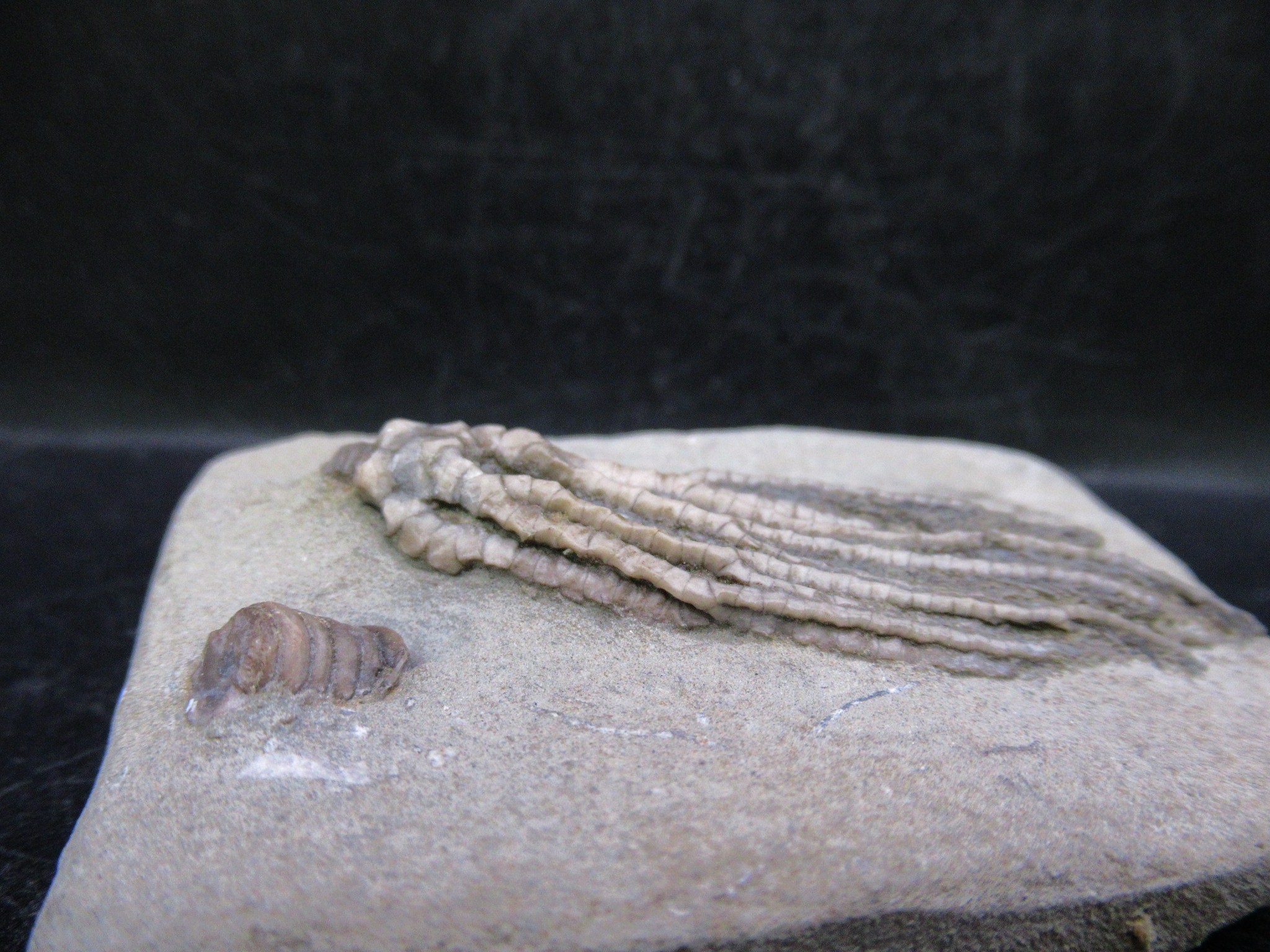 Crawfordsville Indiana is known for its spectacular crinoid faunal assemblage. There are more than 60 species of crinoids among more than 40 genera found in the Crawfordsville area. Seafloor conditions in the Crawfordsville area were obviously very favorable to the proliferation of crinoids, an environment that had both shallow water conditions and an influx of silt from a neighboring delta.