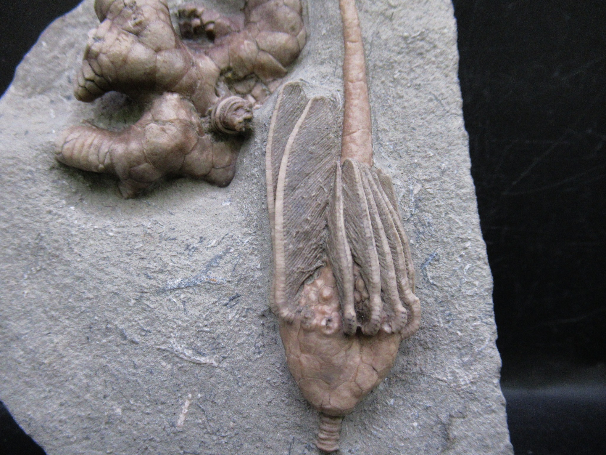 Crawfordsville Indiana is known for its spectacular crinoid faunal assemblage. There are more than 60 species of crinoids among more than 40 genera found in the Crawfordsville area. Seafloor conditions in the Crawfordsville area were obviously very favorable to the proliferation of crinoids, an environment that had both shallow water conditions and an influx of silt from a neighboring delta.