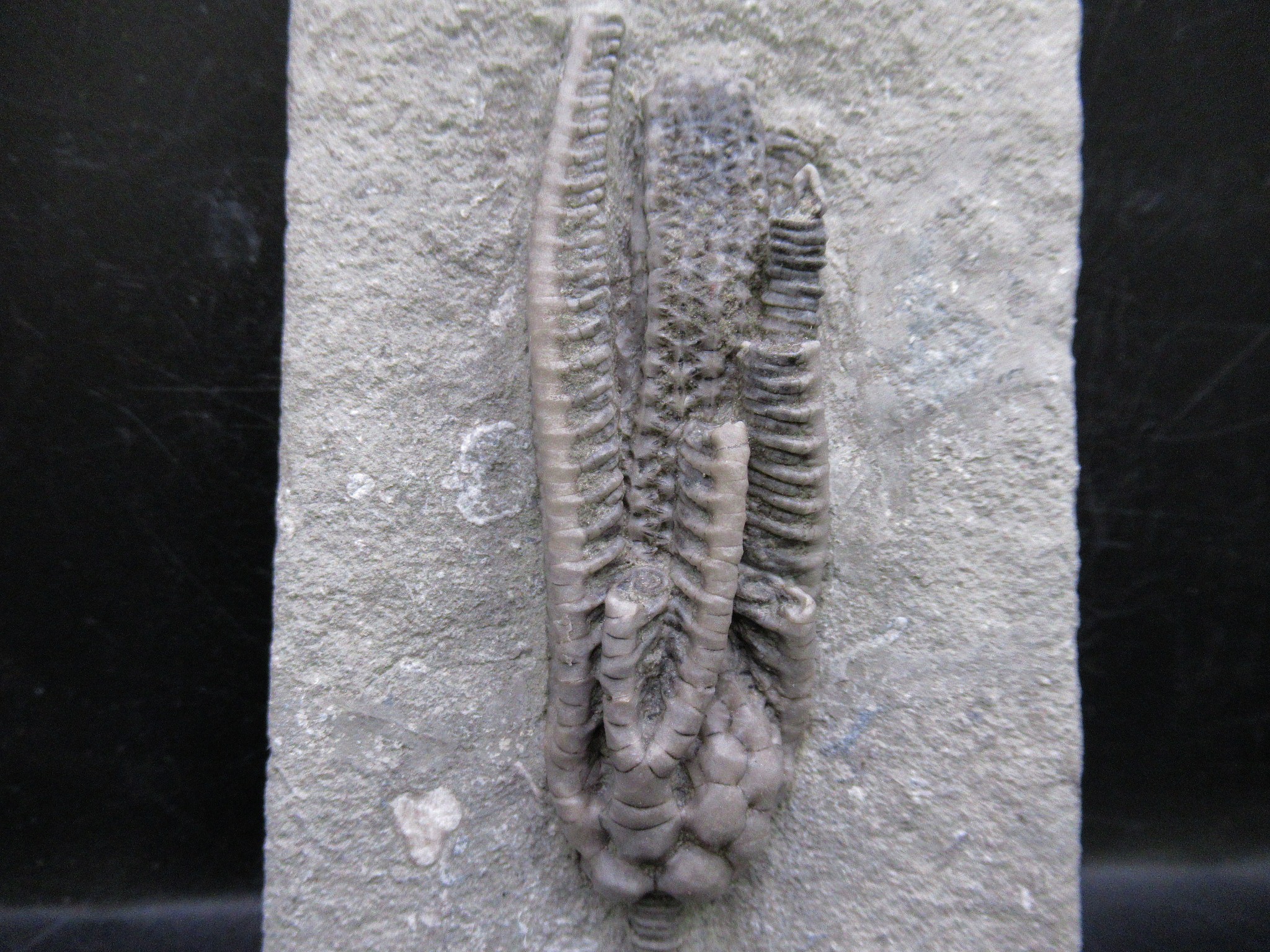 Crawfordsville Indiana is known for its spectacular crinoid faunal assemblage. There are more than 60 species of crinoids among more than 40 genera found in the Crawfordsville area. Seafloor conditions in the Crawfordsville area were obviously very favorable to the proliferation of crinoids, an environment that had both shallow water conditions and an influx of silt from a neighboring delta.
