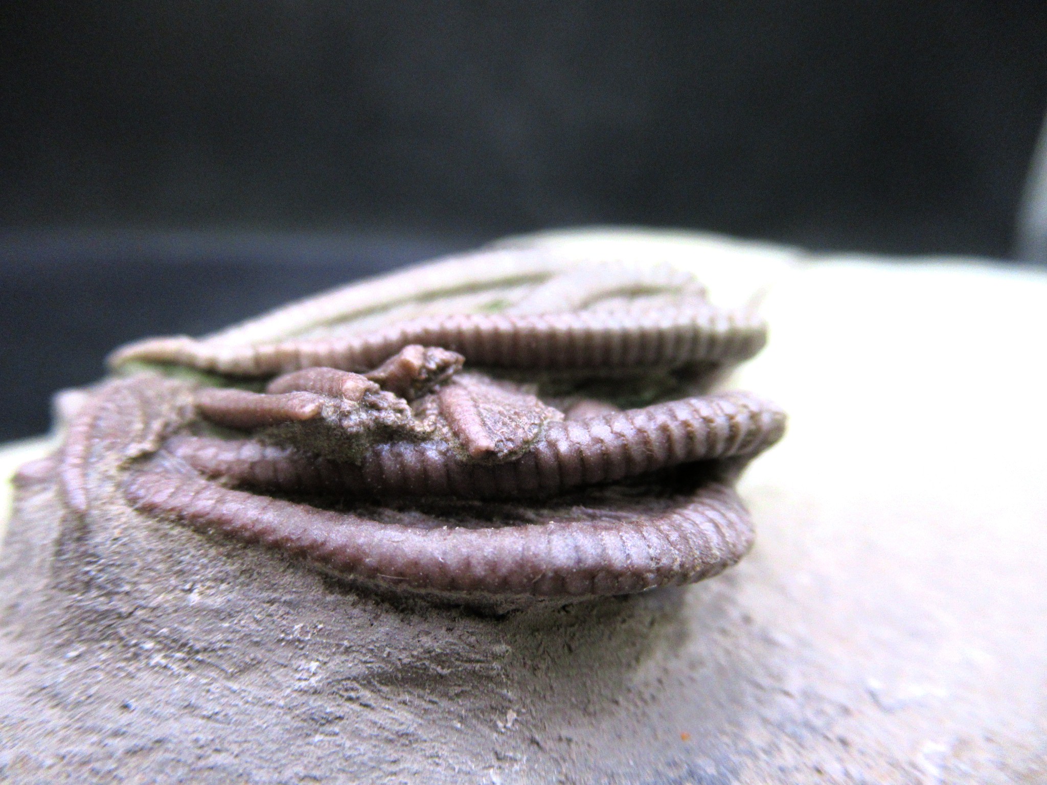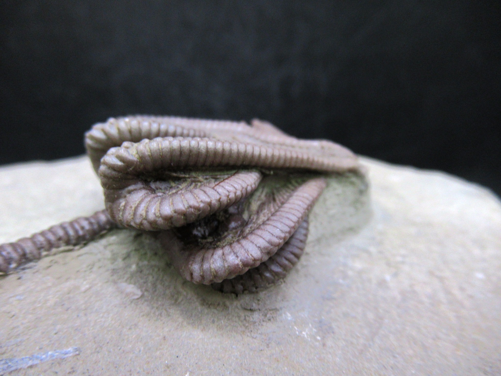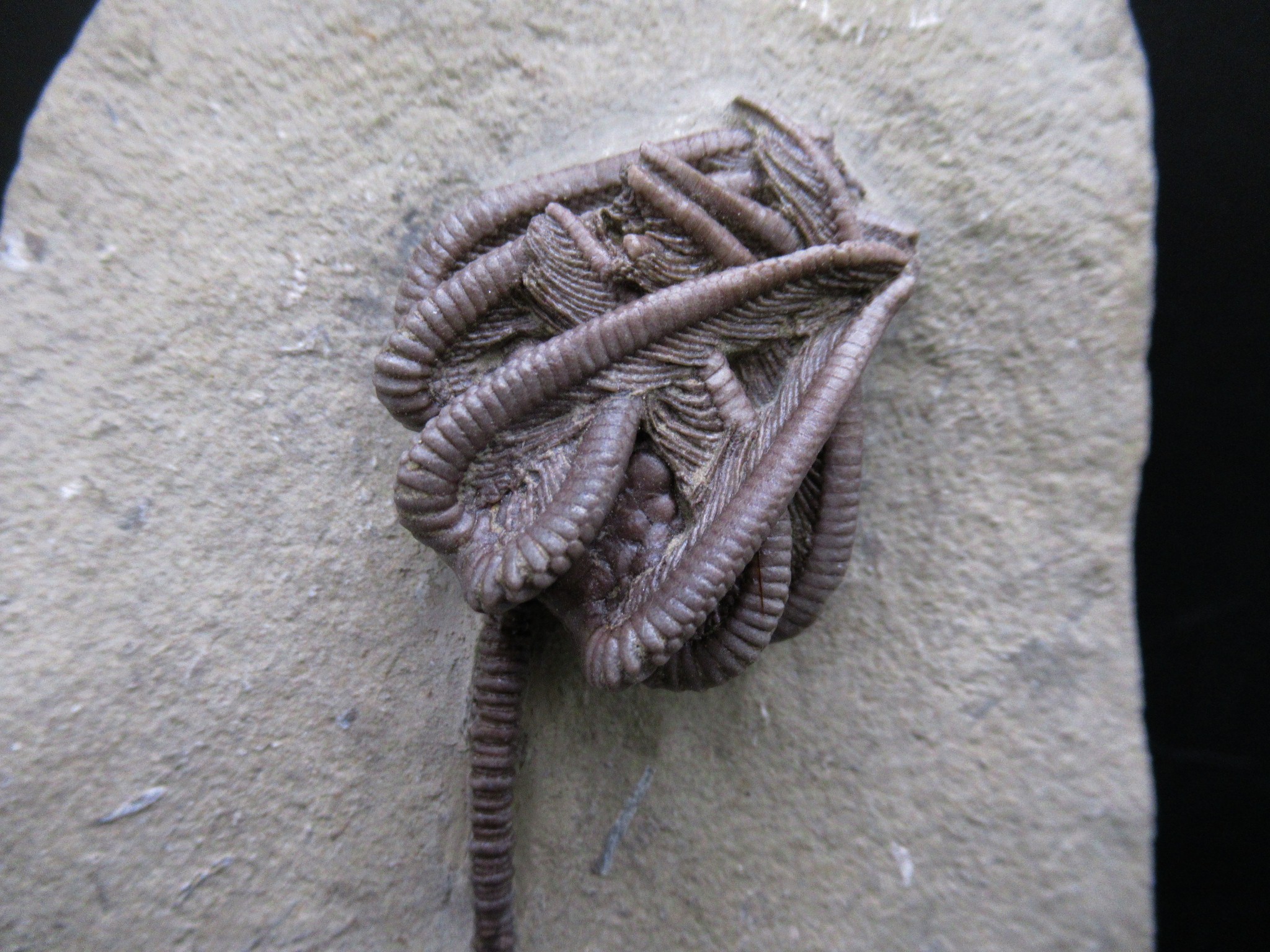 Crawfordsville Indiana is known for its spectacular crinoid faunal assemblage. There are more than 60 species of crinoids among more than 40 genera found in the Crawfordsville area. Seafloor conditions in the Crawfordsville area were obviously very favorable to the proliferation of crinoids, an environment that had both shallow water conditions and an influx of silt from a neighboring delta.
