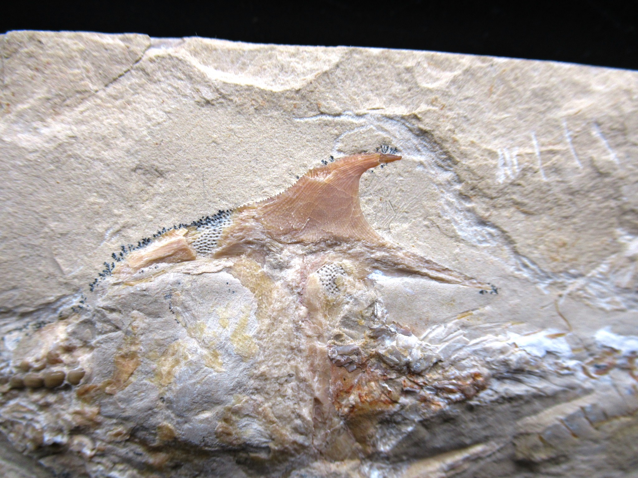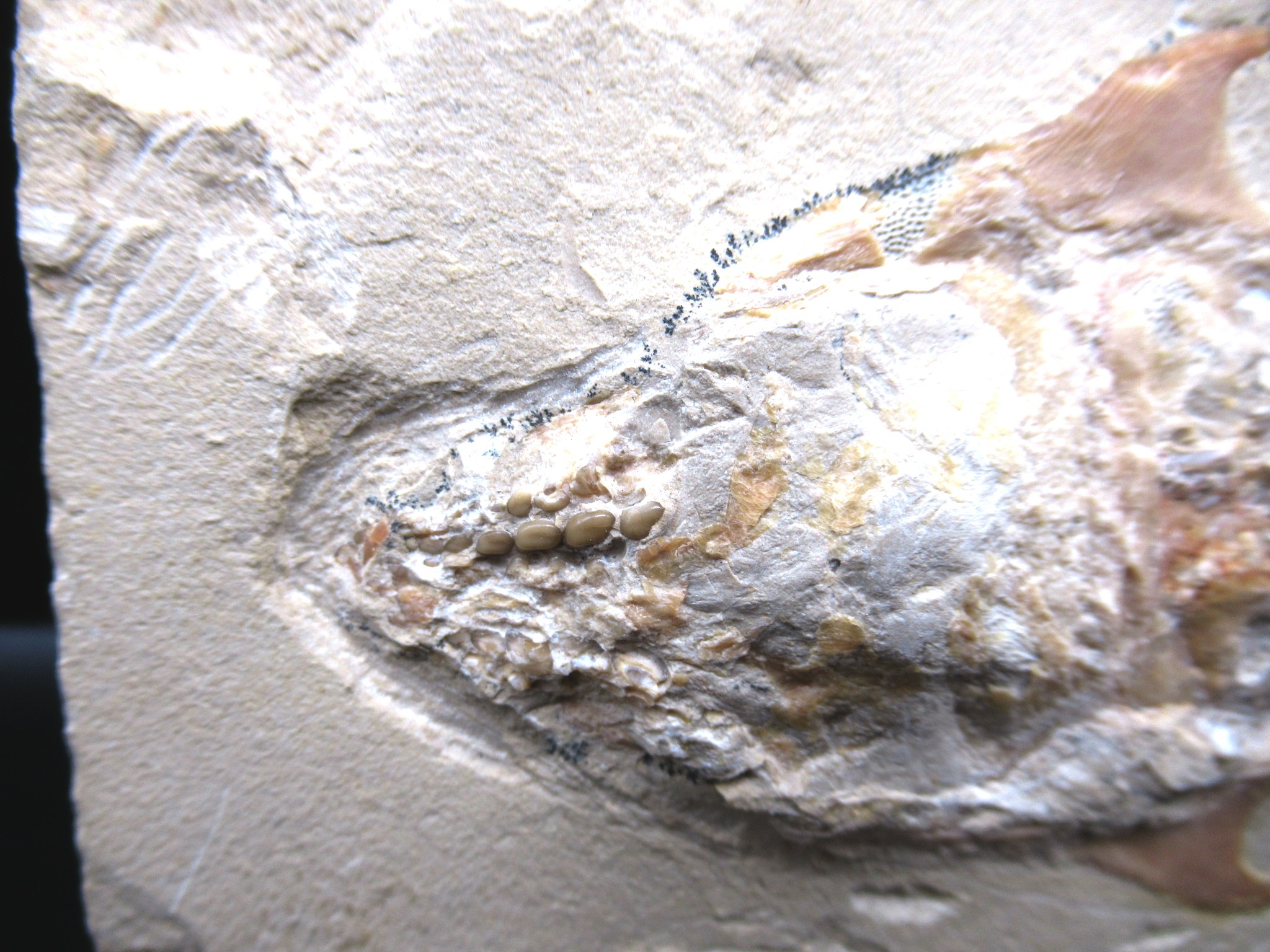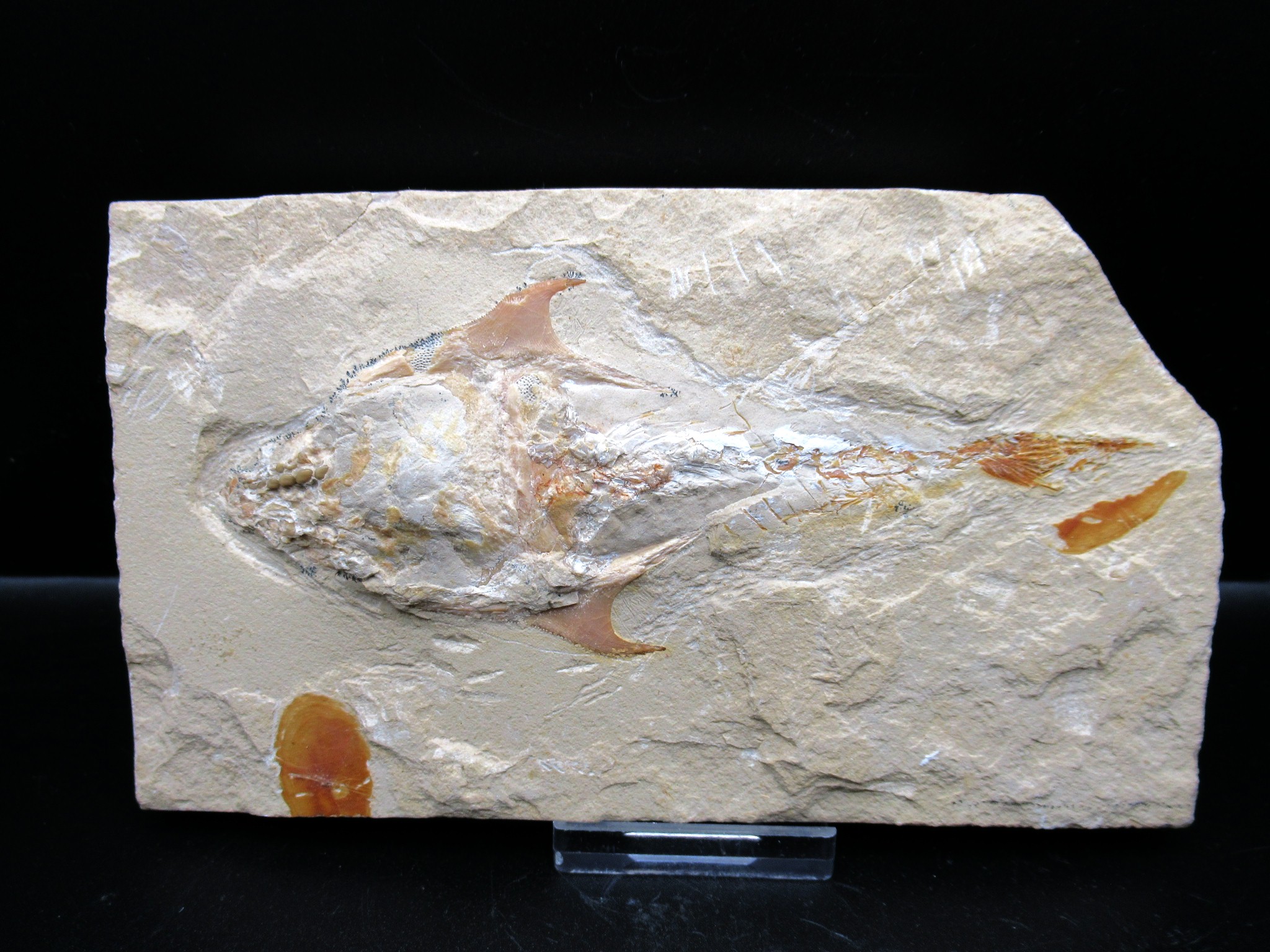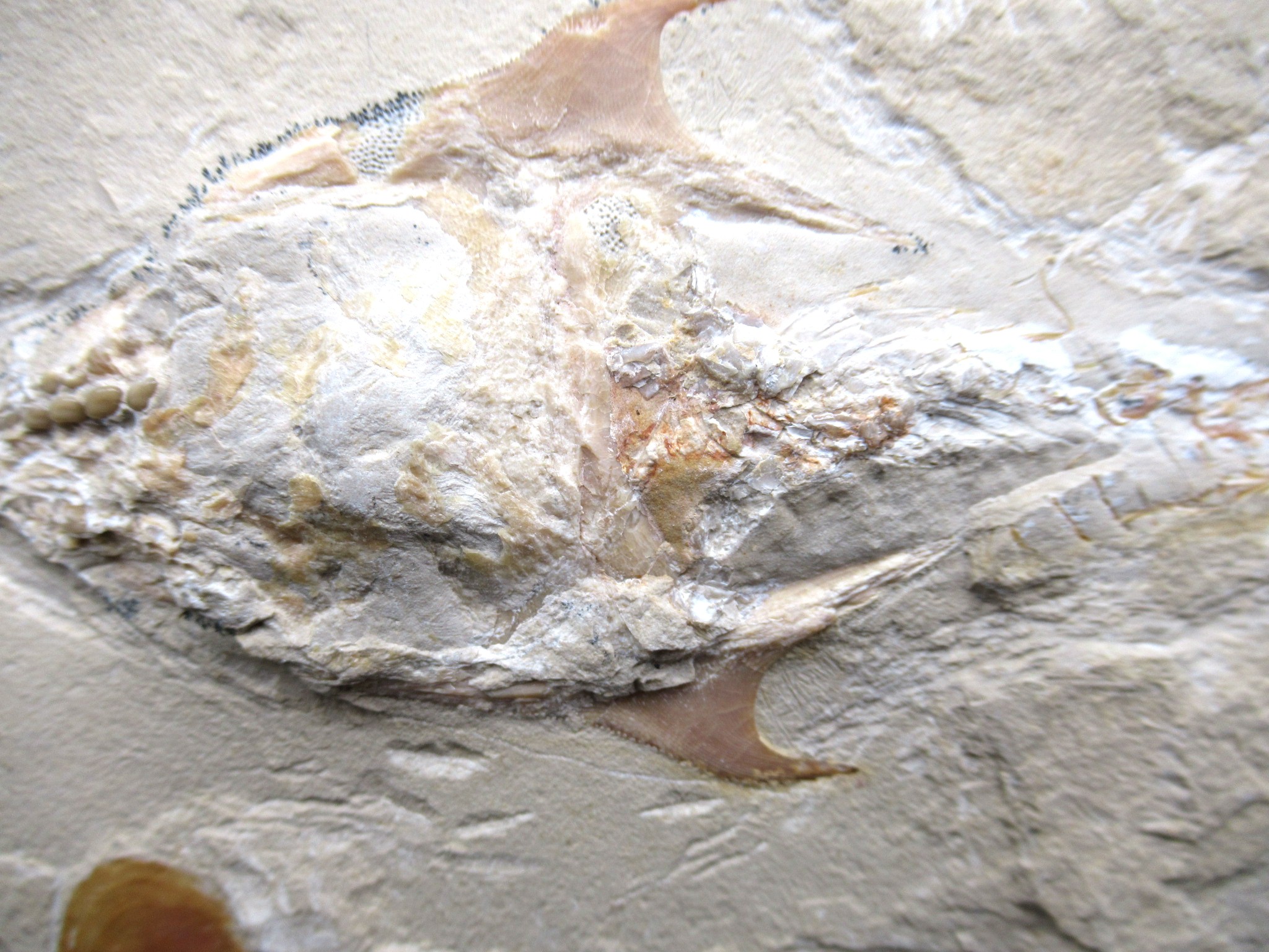 This cretaceous “crusher-fish” bears a resemblance to a stingray, but it is actually a fish. This is a pycnodont with two sickle-shaped spines and a long snout with big dental plates that are out of proportion to the size of the fish.