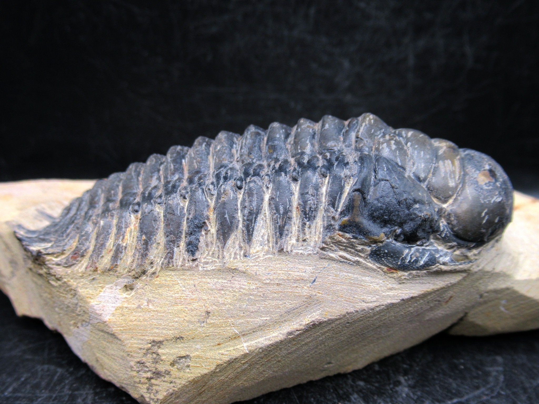 This specimen shows the remarkable as well as intricate details preserved in stone. The most diagnostic features of this trilobite are the sharp pleural and pygidial spines and the distinctive cephalon. Finally, this is an extinct genus of trilobite in the order Phacopida found in Morocco. .