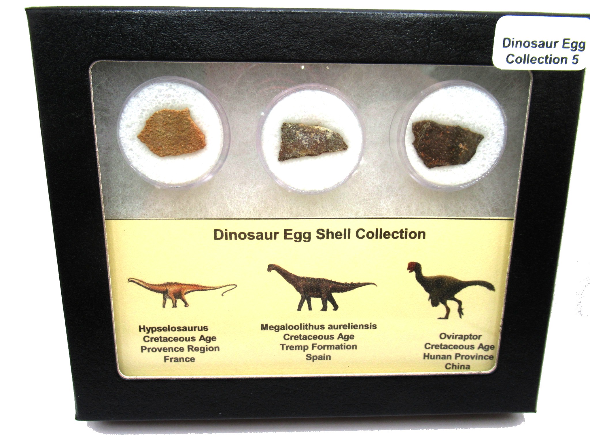 • Collection will contain a piece of the following Dinosaurs:  Oviraptor, Hypselosaurus, and Megaloolithius