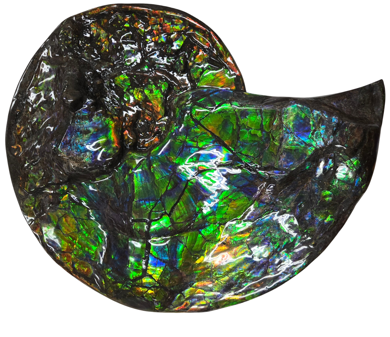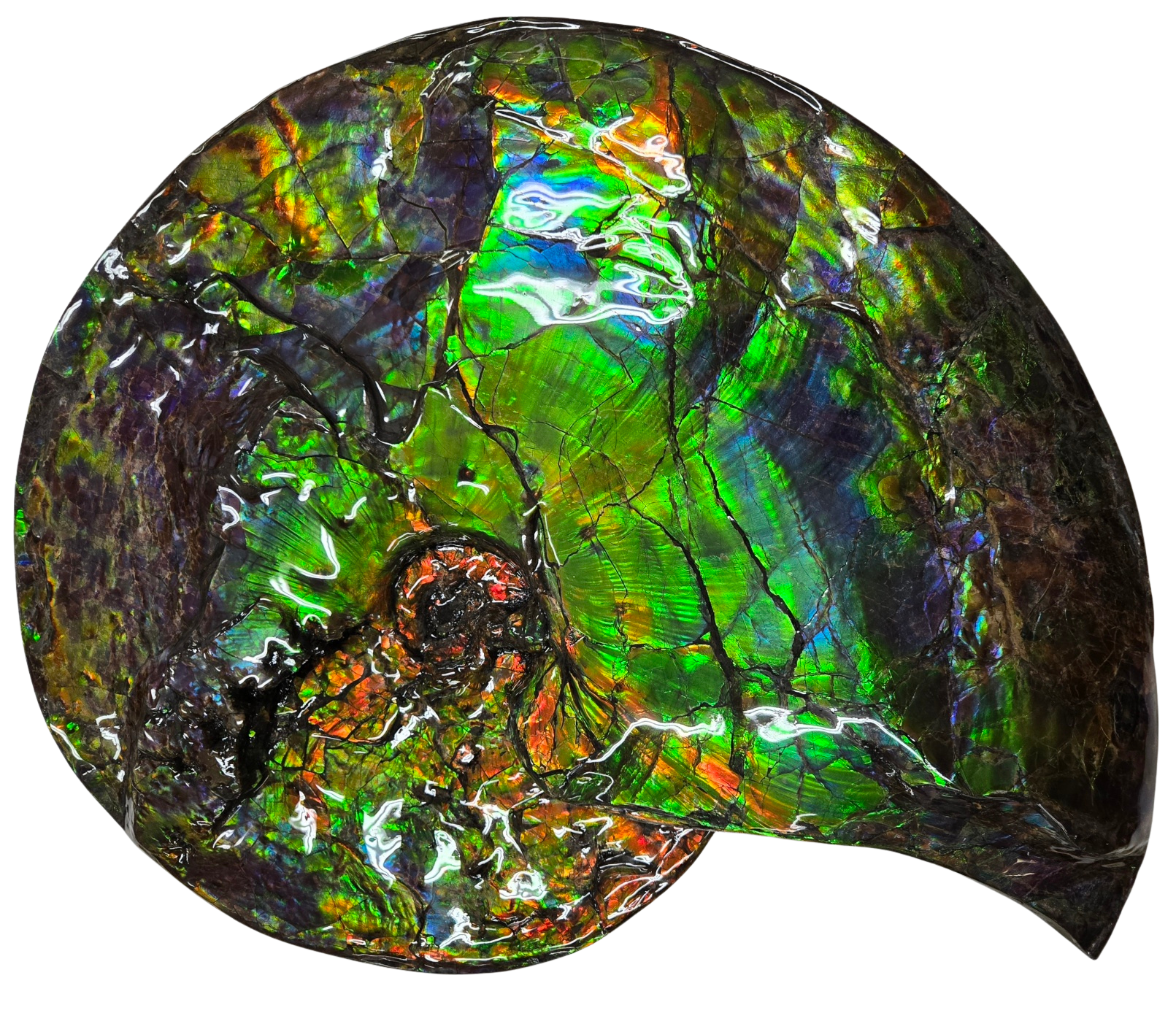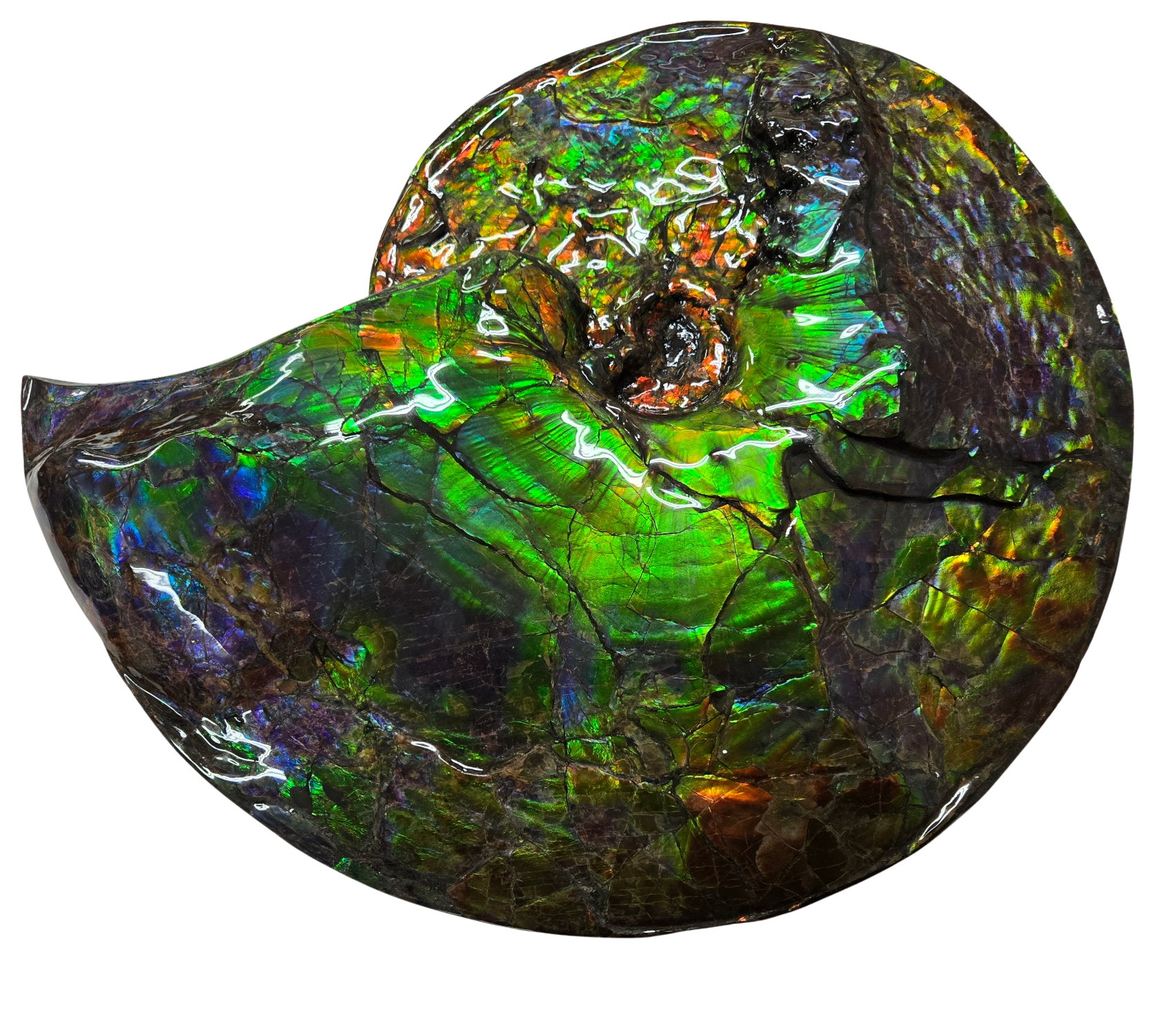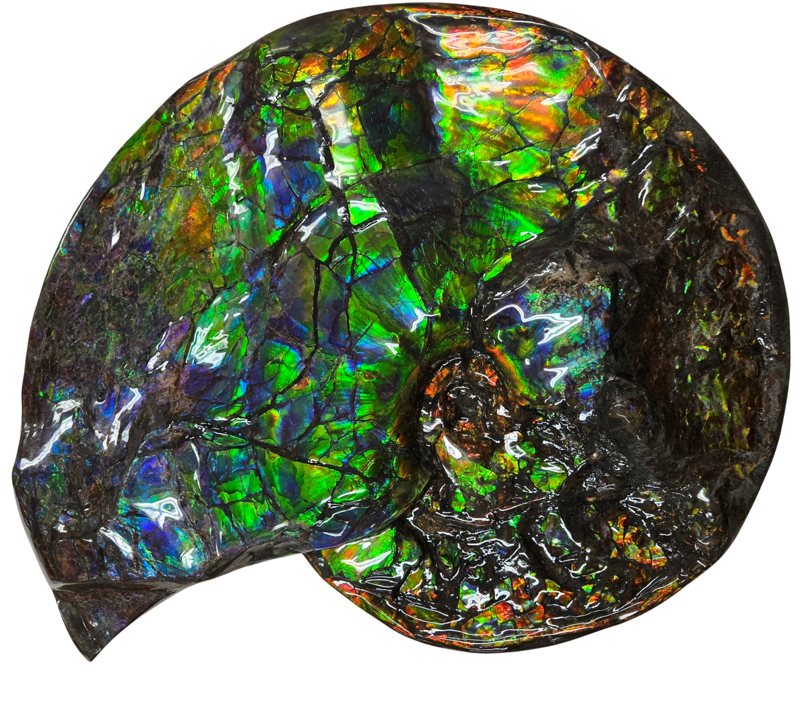 Ammolite – A RARE gemstone material that forms on the outer shell of certain ammonites. It displays brilliant iridescent colors, much like opal or mother-of-pearl. Colors – Red and green are most common, but rare blues and purples are highly prized.