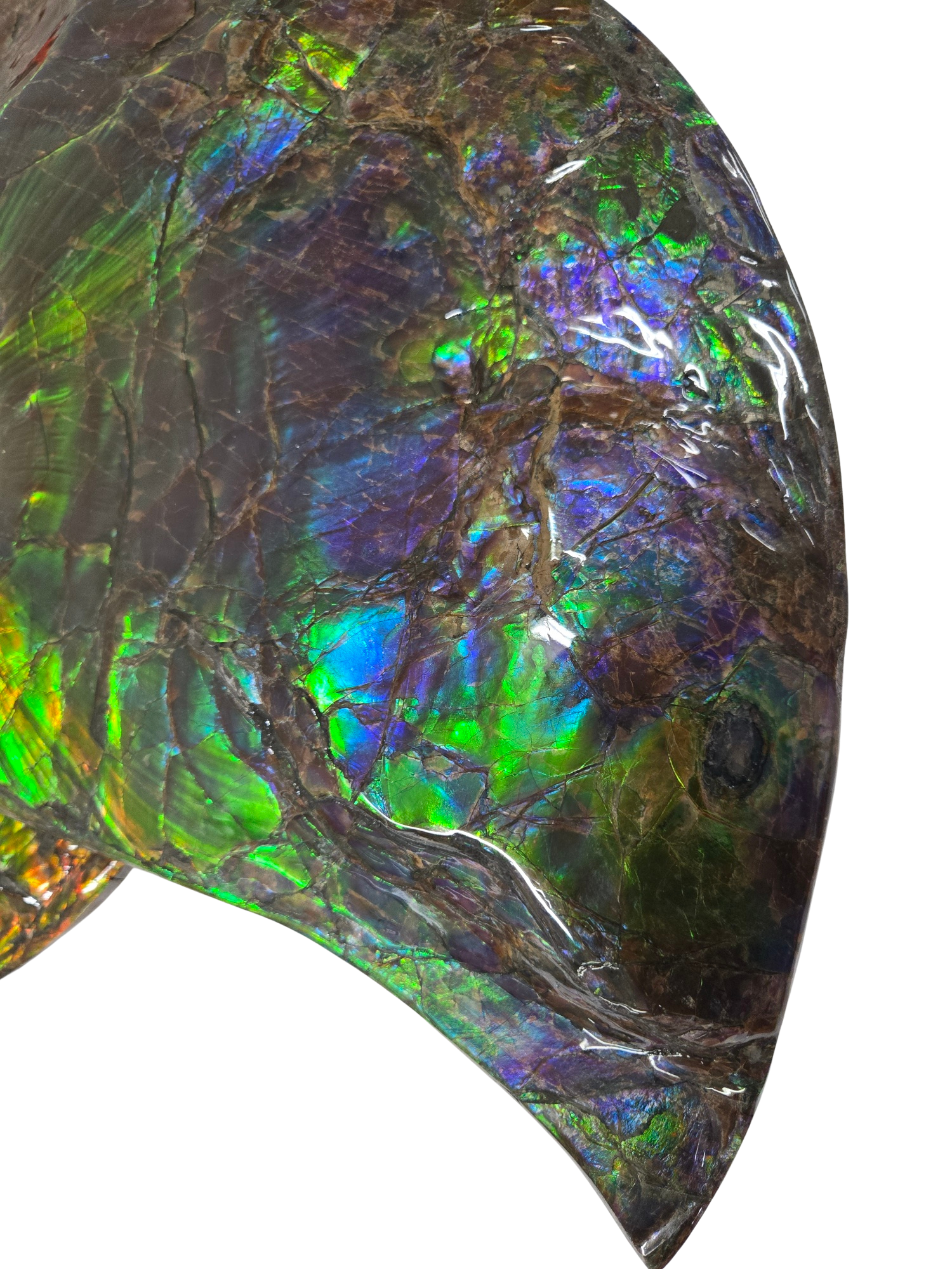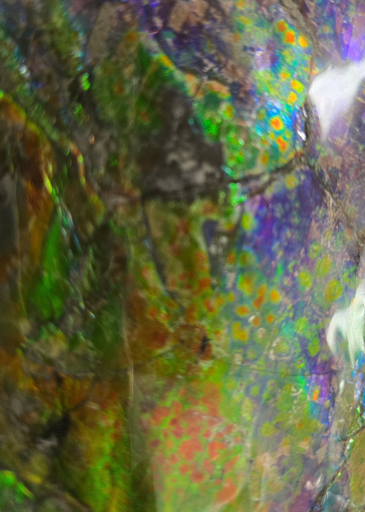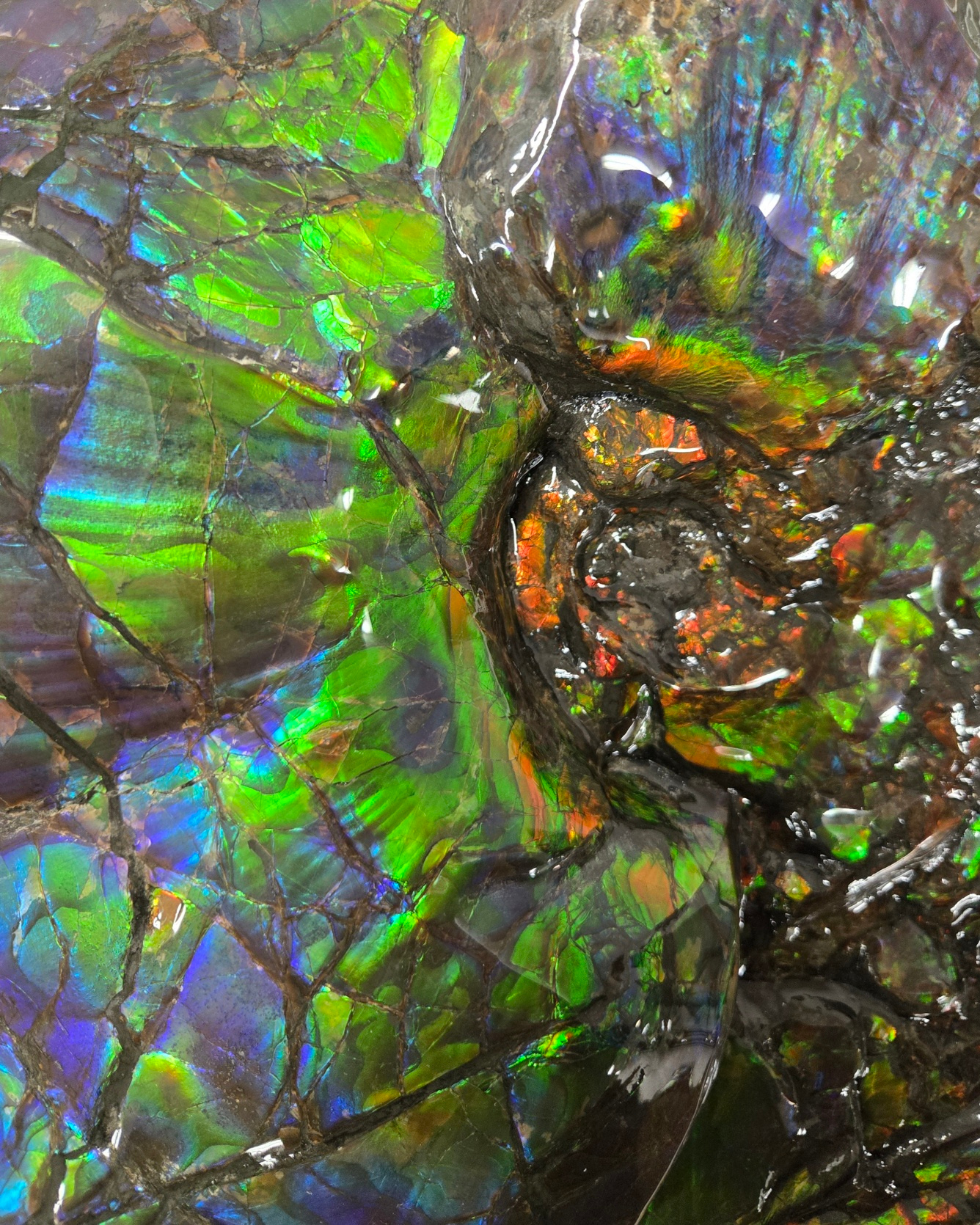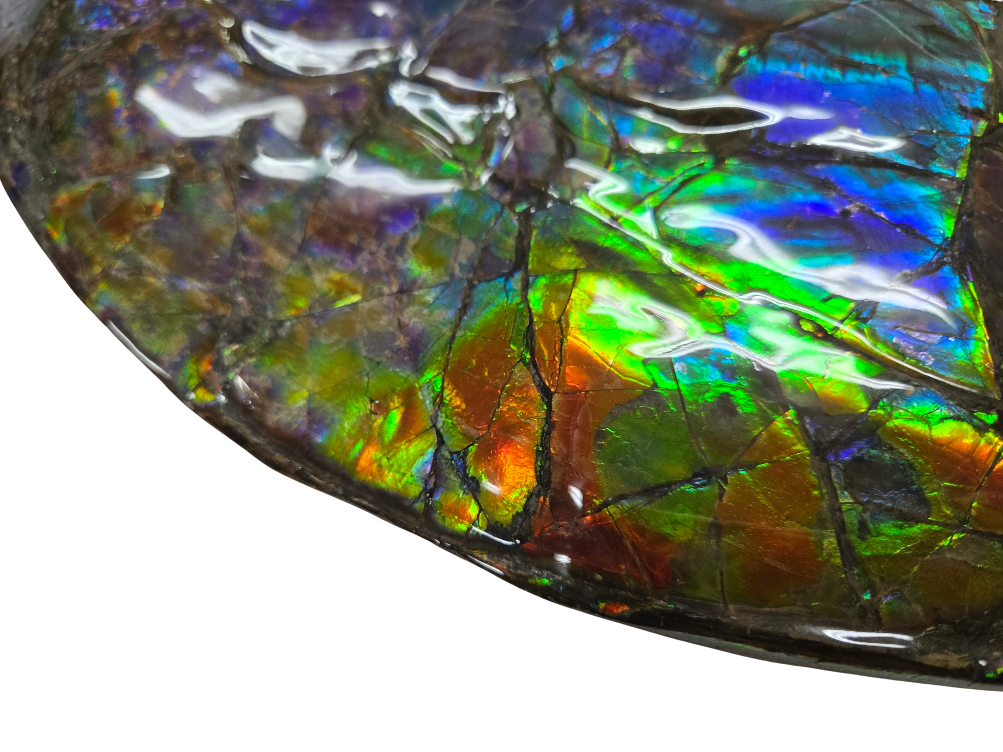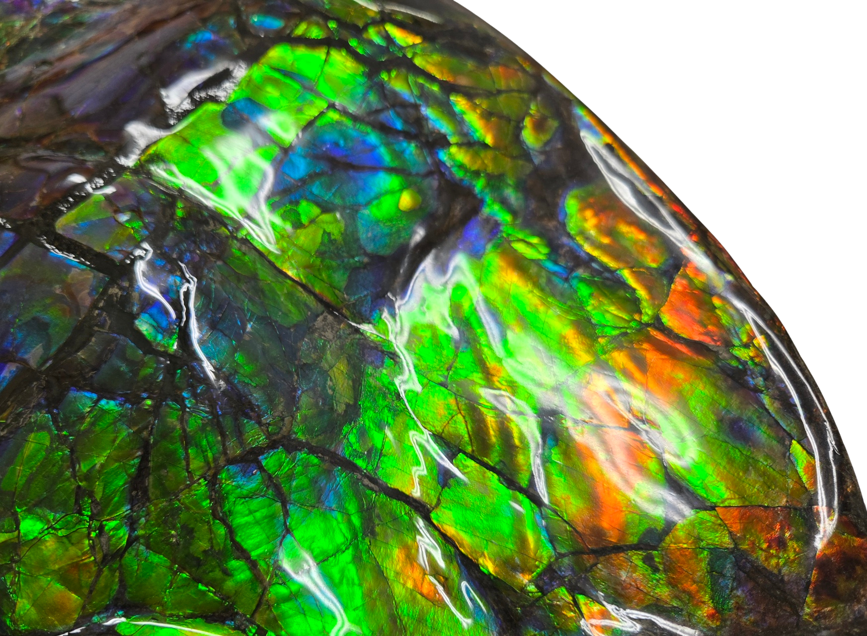 Ammolite – A RARE gemstone material that forms on the outer shell of certain ammonites. It displays brilliant iridescent colors, much like opal or mother-of-pearl. Colors – Red and green are most common, but rare blues and purples are highly prized.