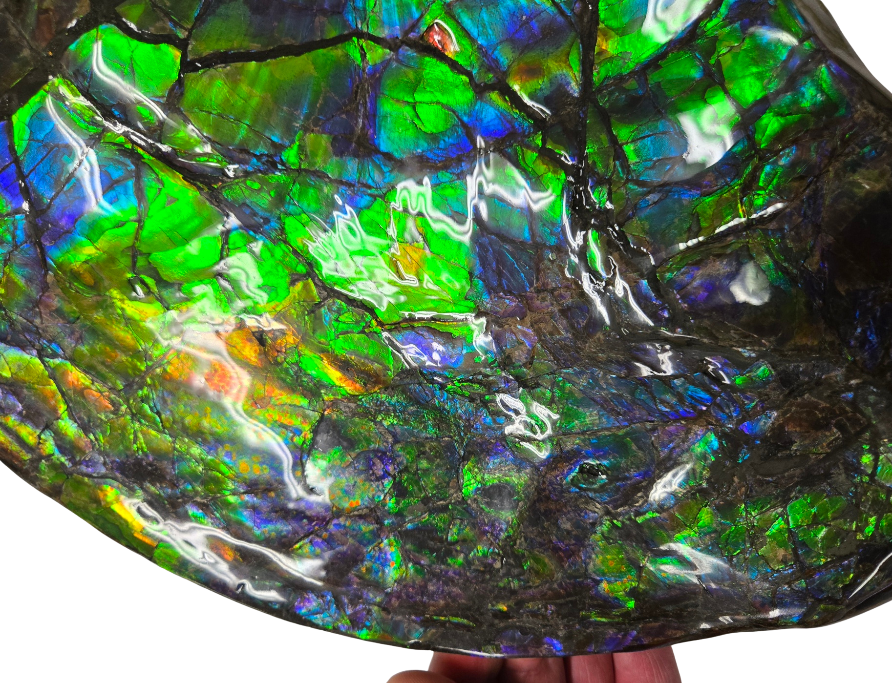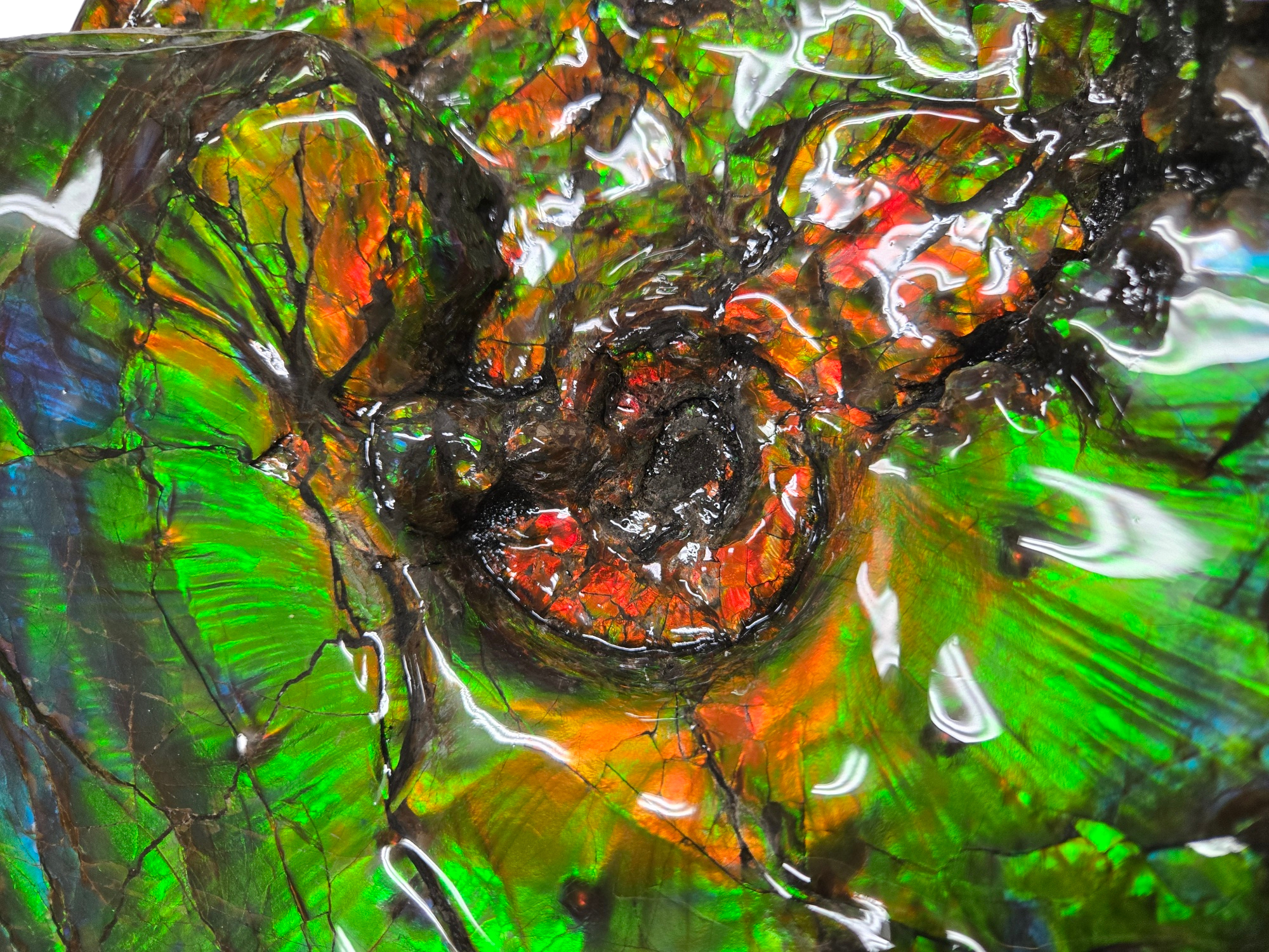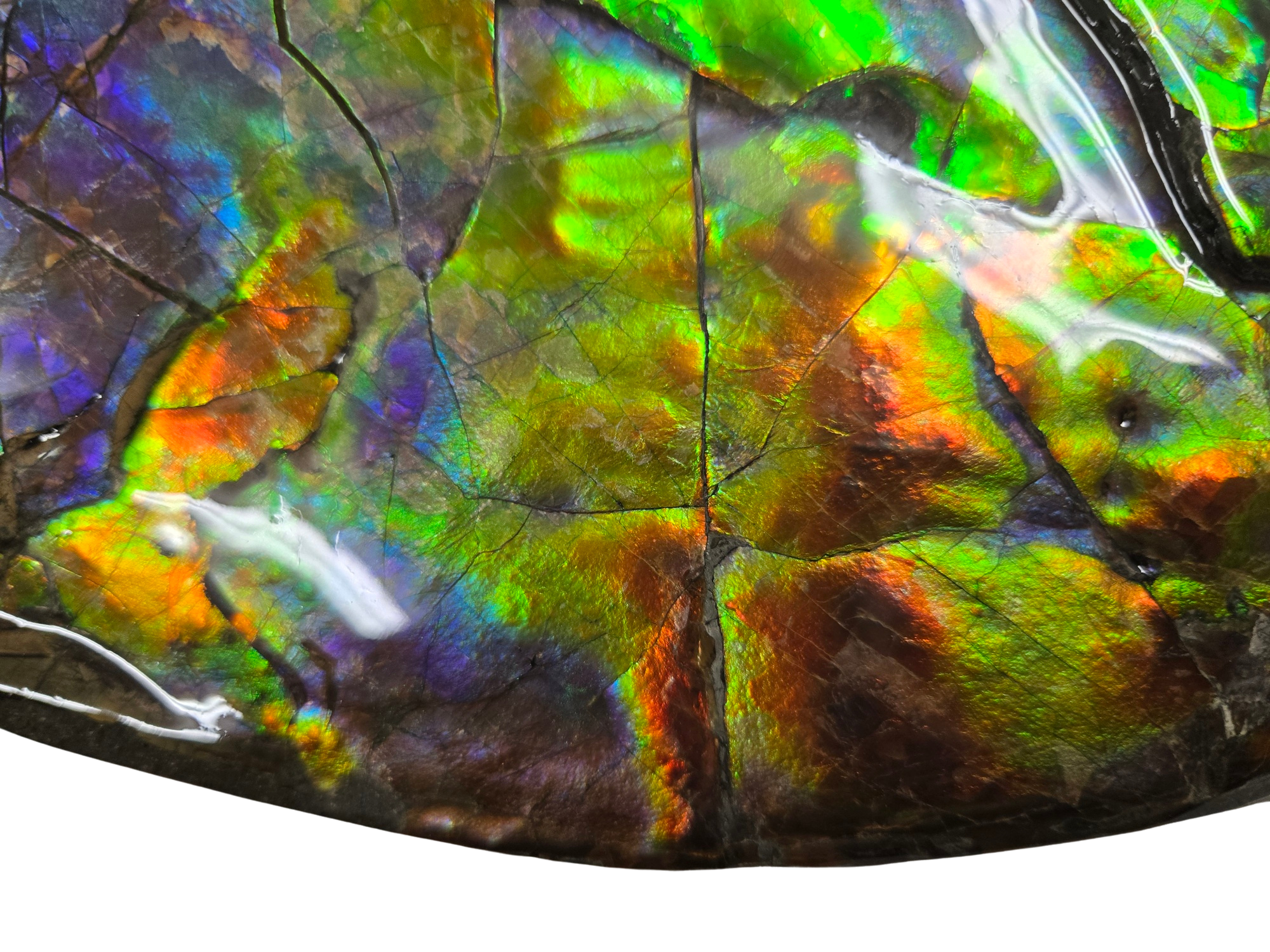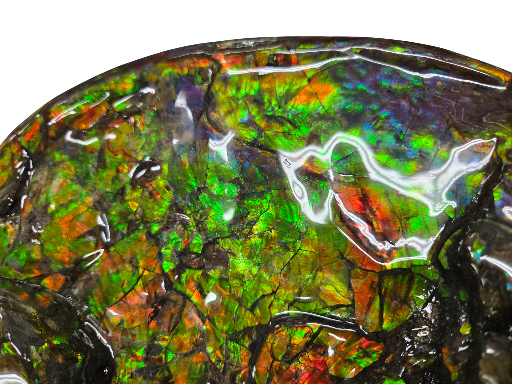 Ammolite – A RARE gemstone material that forms on the outer shell of certain ammonites. It displays brilliant iridescent colors, much like opal or mother-of-pearl. Colors – Red and green are most common, but rare blues and purples are highly prized.