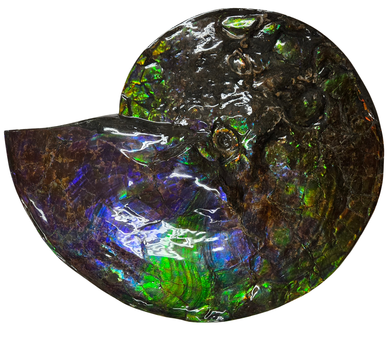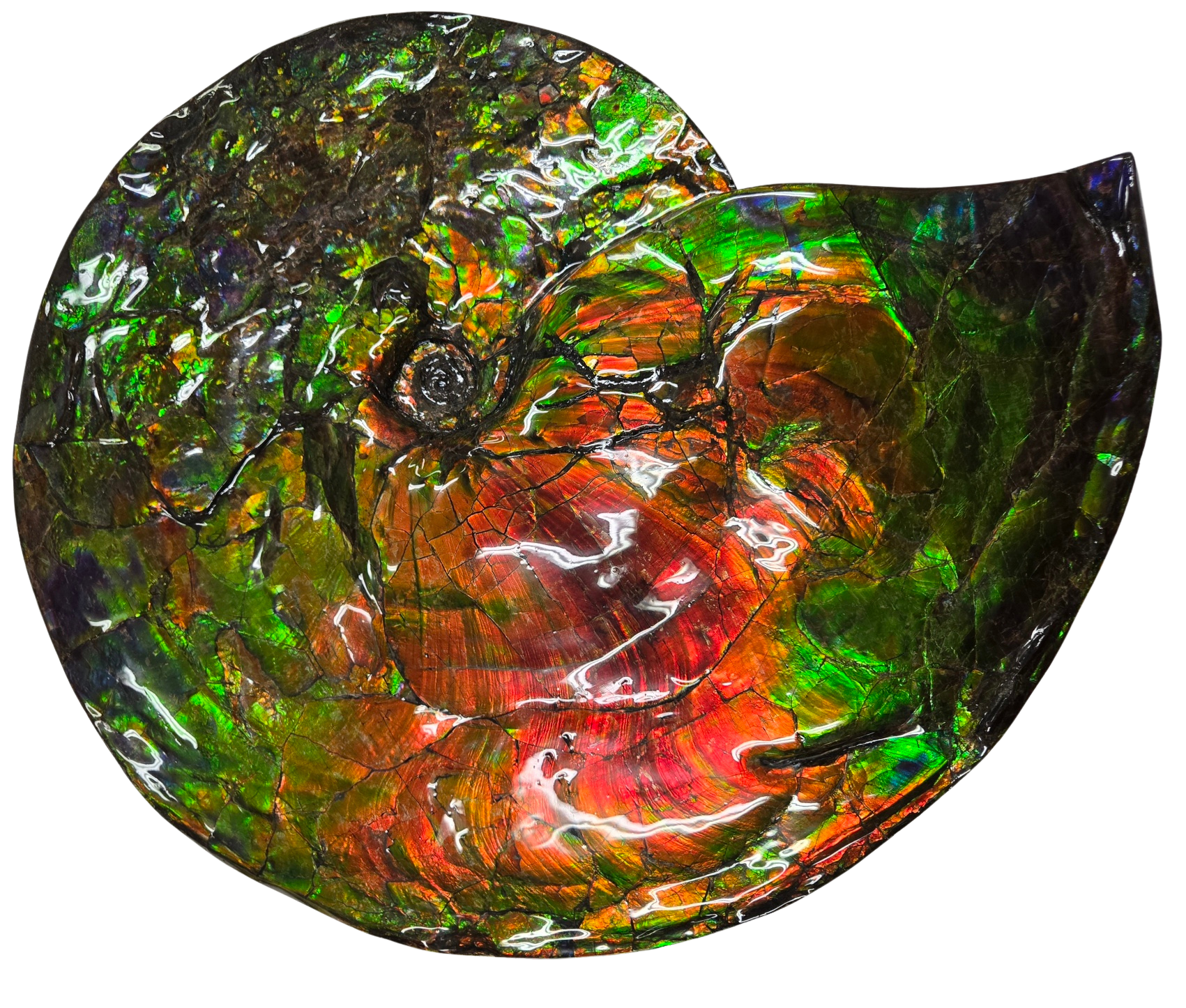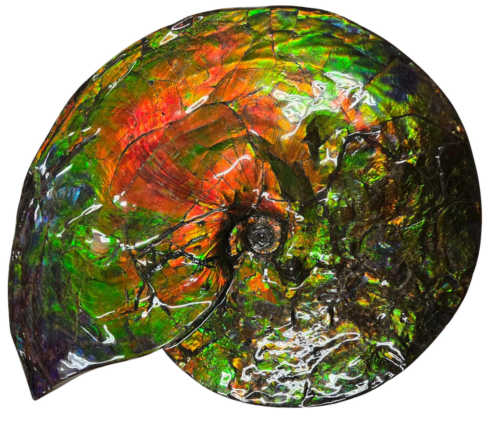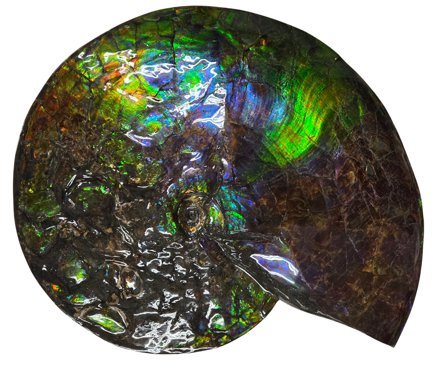 Ammolite – A RARE gemstone material that forms on the outer shell of certain ammonites. It displays brilliant iridescent colors, much like opal or mother-of-pearl.  Colors – Red and green are most common, but rare blues and purples are highly prized.