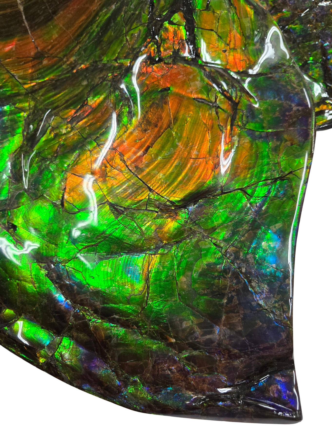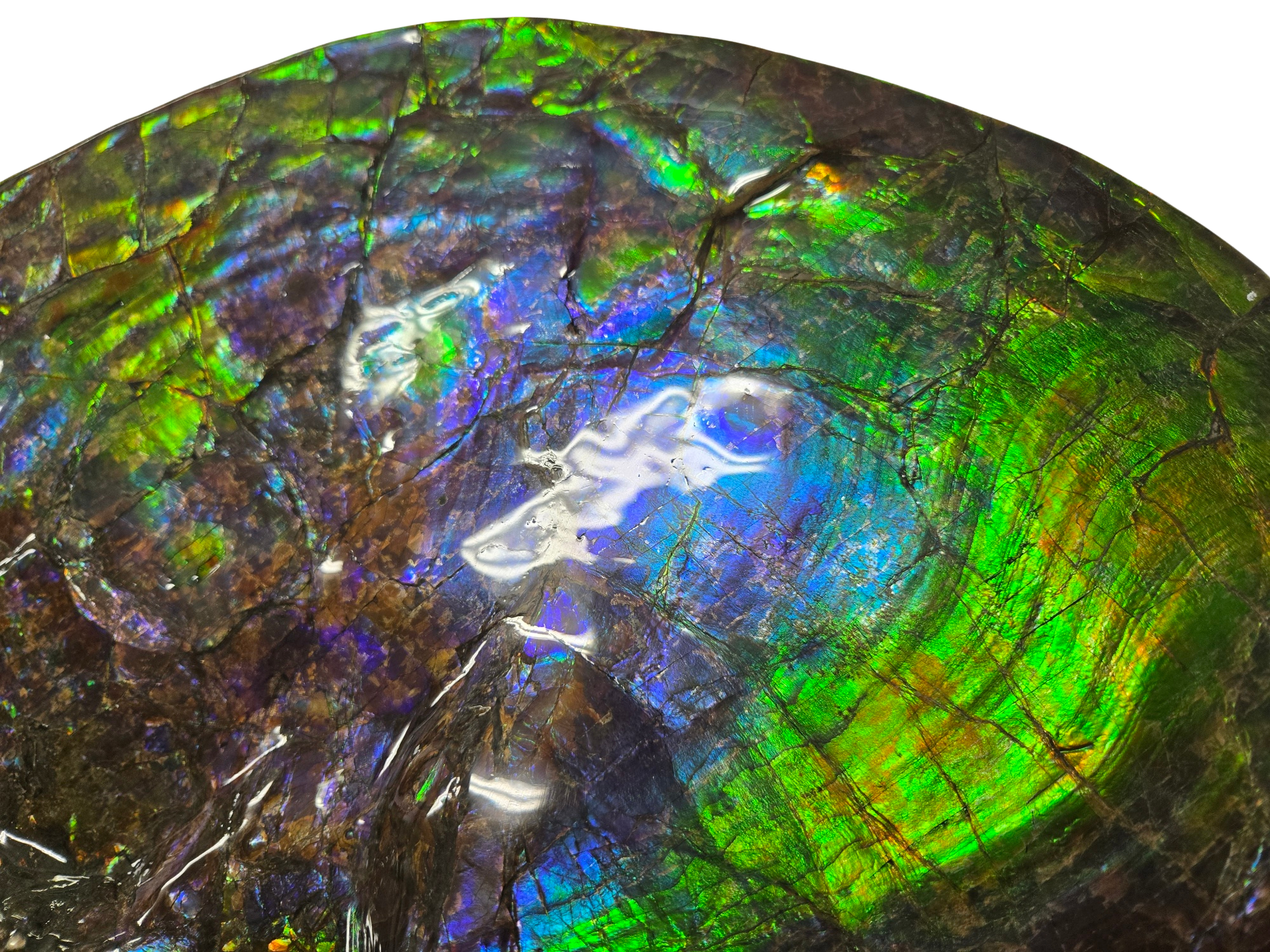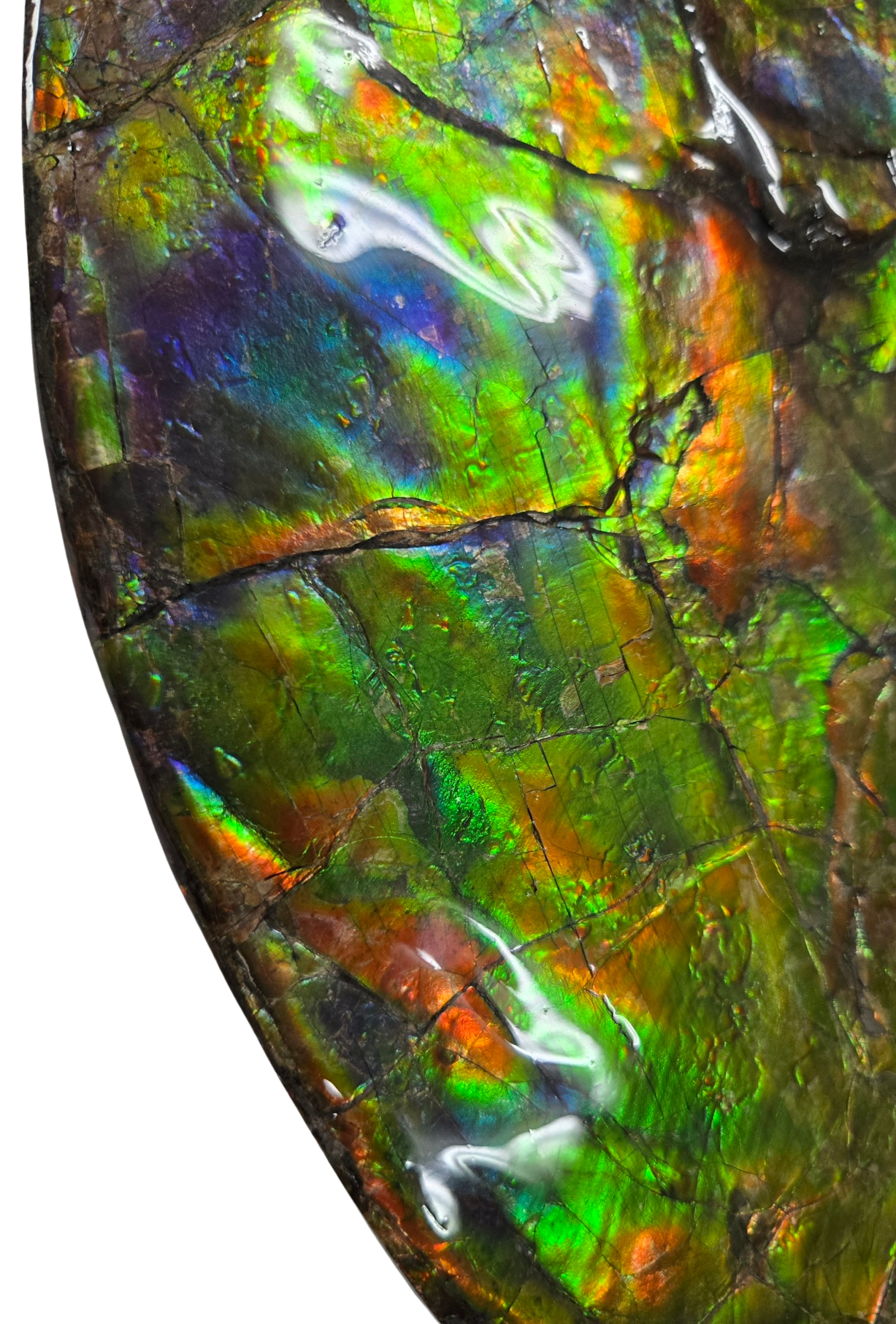 Ammolite – A RARE gemstone material that forms on the outer shell of certain ammonites. It displays brilliant iridescent colors, much like opal or mother-of-pearl.  Colors – Red and green are most common, but rare blues and purples are highly prized.