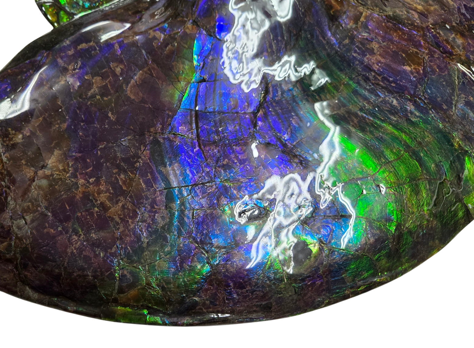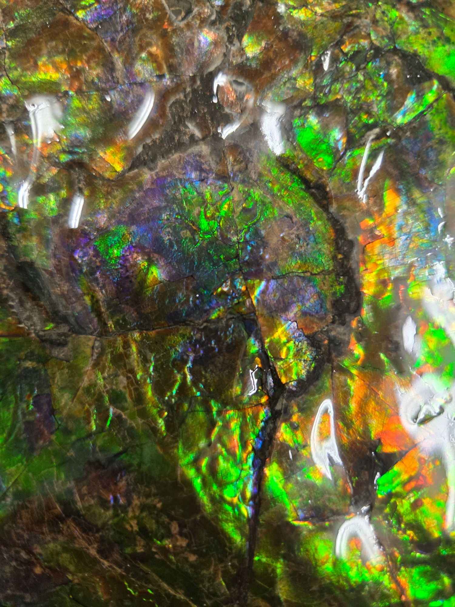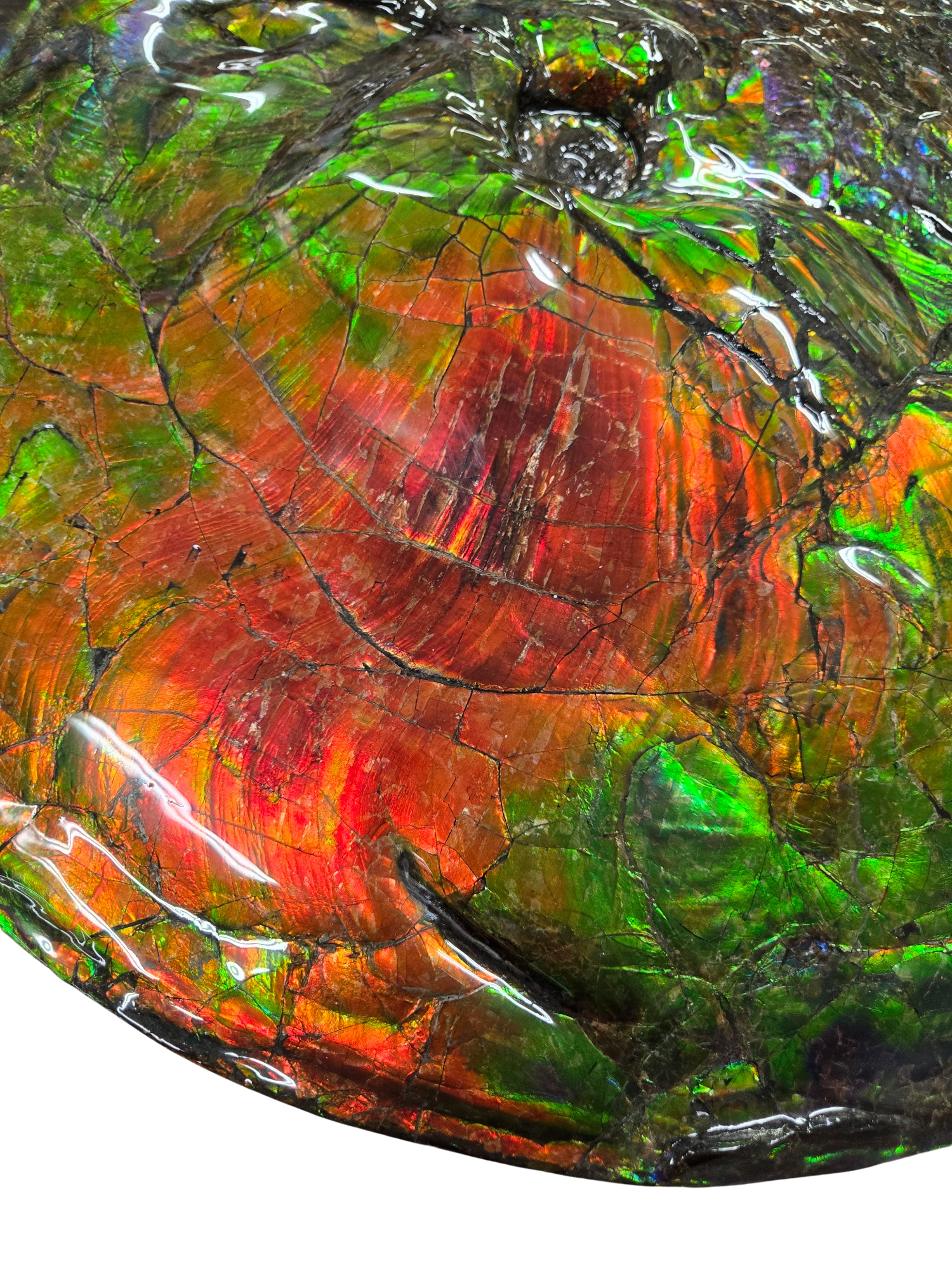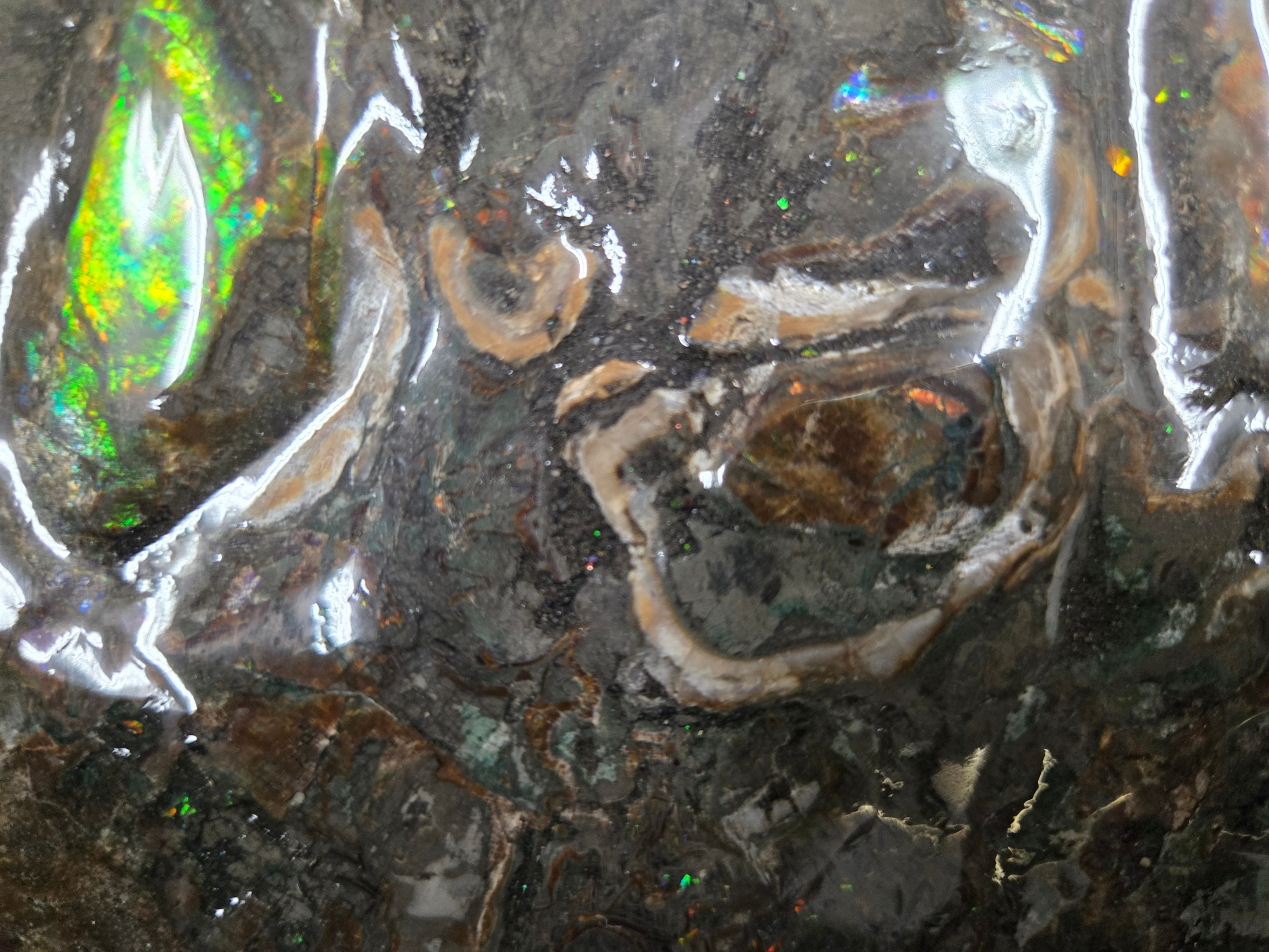 Ammolite – A RARE gemstone material that forms on the outer shell of certain ammonites. It displays brilliant iridescent colors, much like opal or mother-of-pearl.  Colors – Red and green are most common, but rare blues and purples are highly prized.