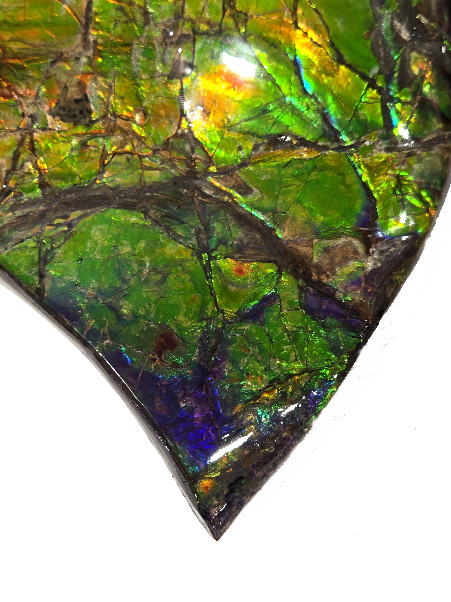 Ammolite – A RARE gemstone material that forms on the outer shell of certain ammonites. It displays brilliant iridescent colors, much like opal or mother-of-pearl.  Colors – Red and green are most common, but rare blues and purples are highly prized.