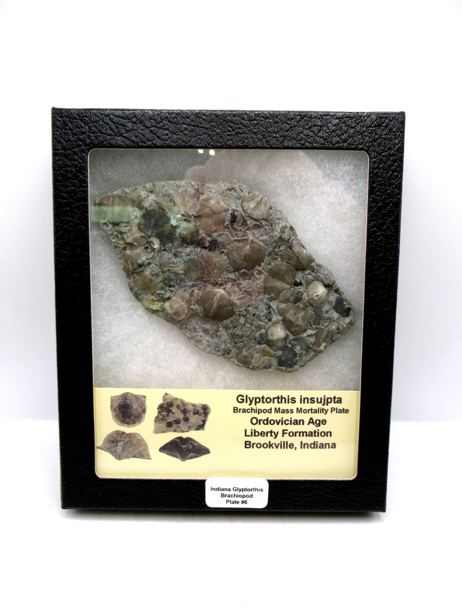 - This plate of brachiopods measures 4.52″ long as well as 2.59″ wide. In addition, it will come in a 5.25″ x 6.25″ tall Riker Mount with an ID Label as well. Finally, 100% Guaranteed Genuine .
