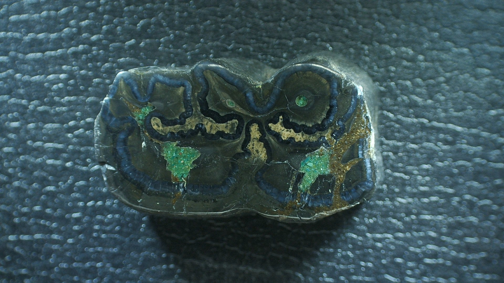 - If present, the blue green colors are Chrysocolla that has been introduced