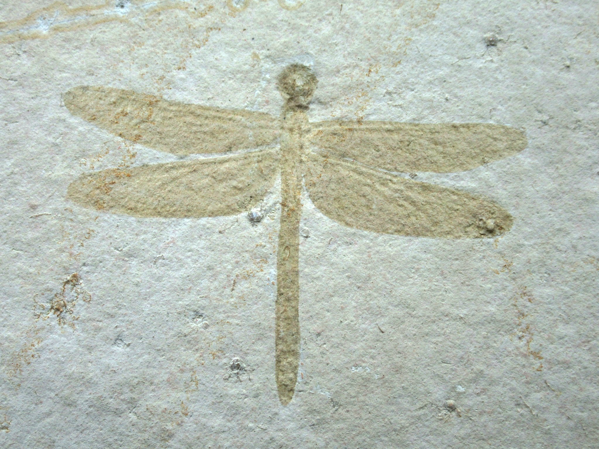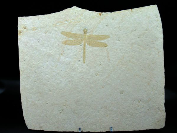 - This detailed Dragonfly displays nicely on its slab of limestone that measures approximately. 10.5″ x 12″ in size. The wingspan is 4.0″ wide. (Like all split limestone fossils, the parts that are missing when separated are highlighted with a tint)