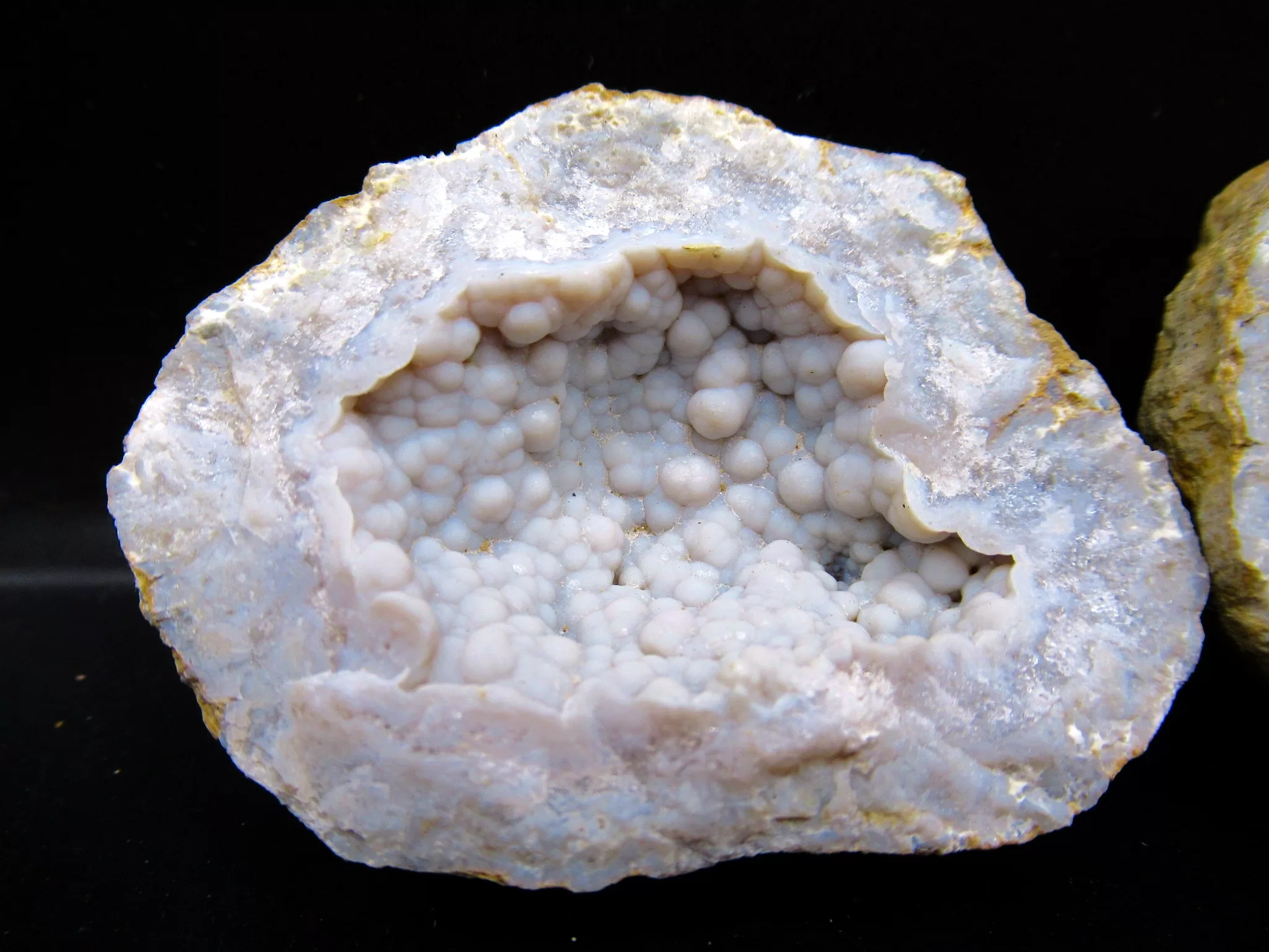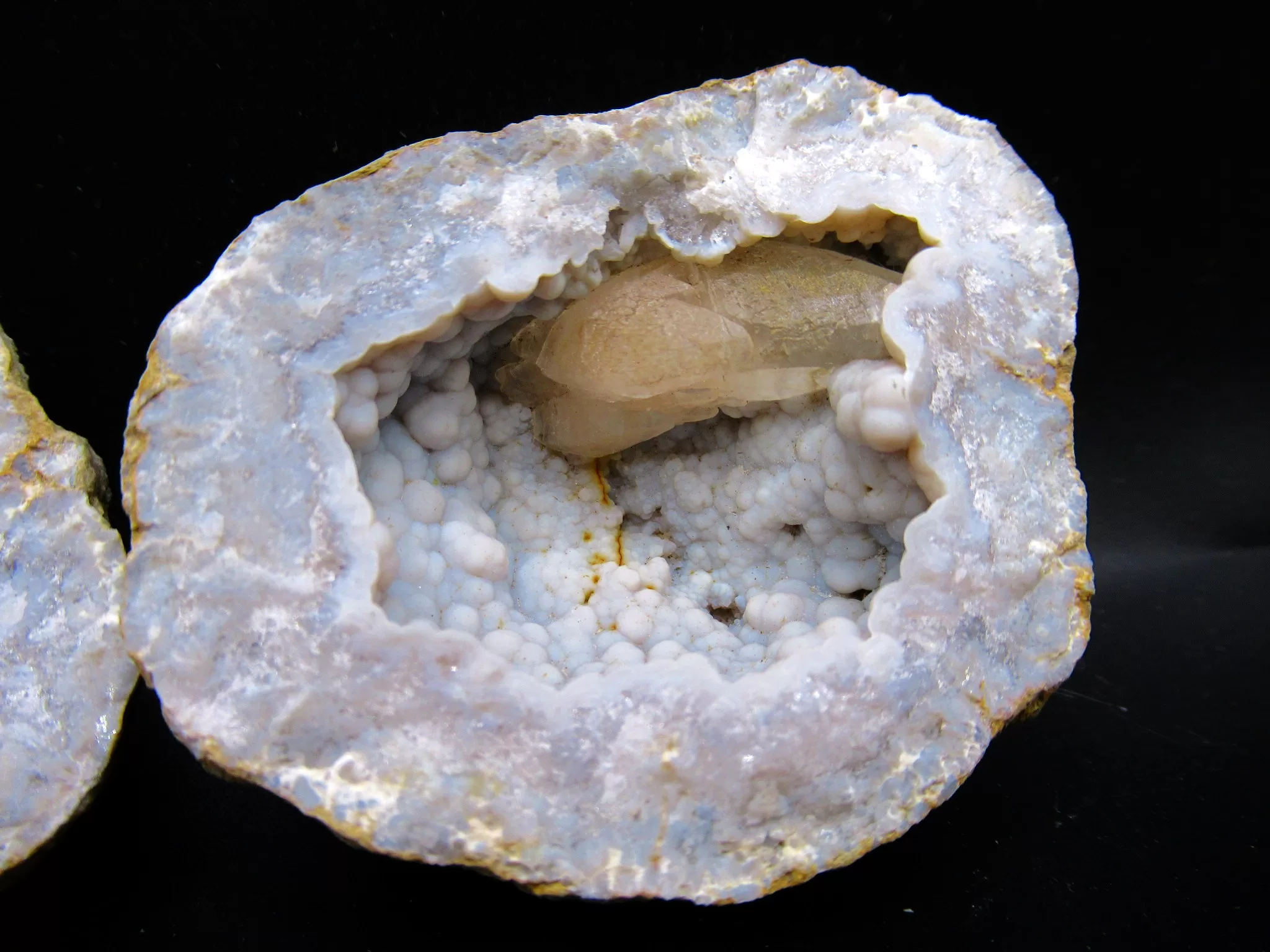 Geodes from the Keokuk area contain a variety of minerals, but quartz is dominant in most. Beautiful transparent to white quartz crystals cover the interior walls of many geodes. Chalcedony forms the outer shell in all Keokuk geodes. White, gray, blue, yellow or orange chalcedony also encrust the interior walls of many geodes.