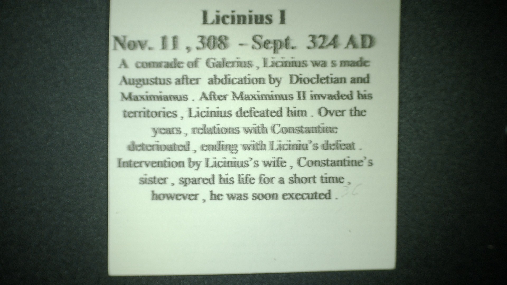 Valerius Licinianus Licinius (c. 265 – 325) was Roman emperor from 308 to 324. For most of his reign he was the colleague and rival of Constantine I, with whom he co-authored the Edict of Milan, AD 313, that granted official toleration to Christians in the Roman Empire. He was finally defeated at the Battle of Chrysopolis (AD 324), and was later executed on the orders of Constantine I.