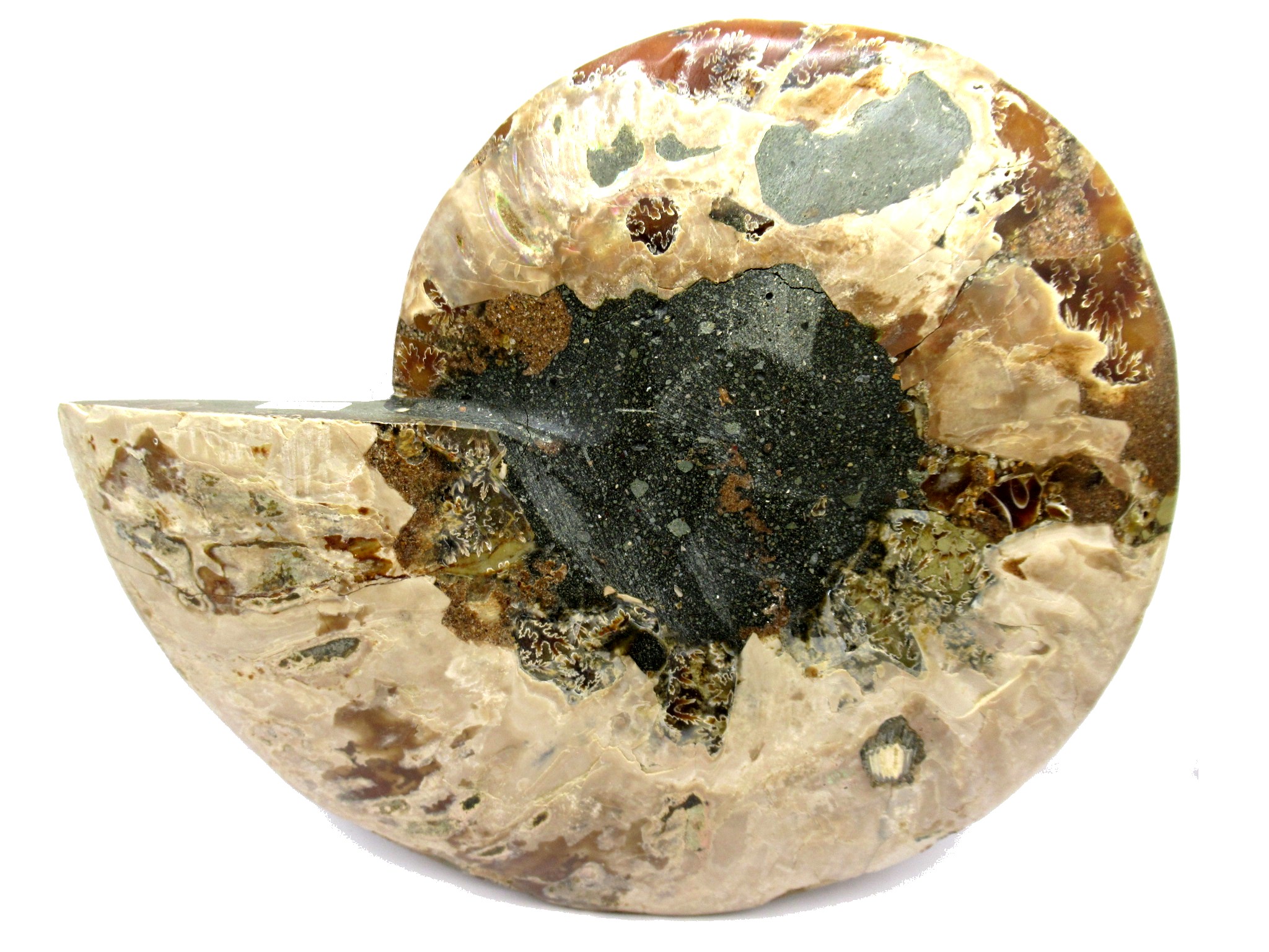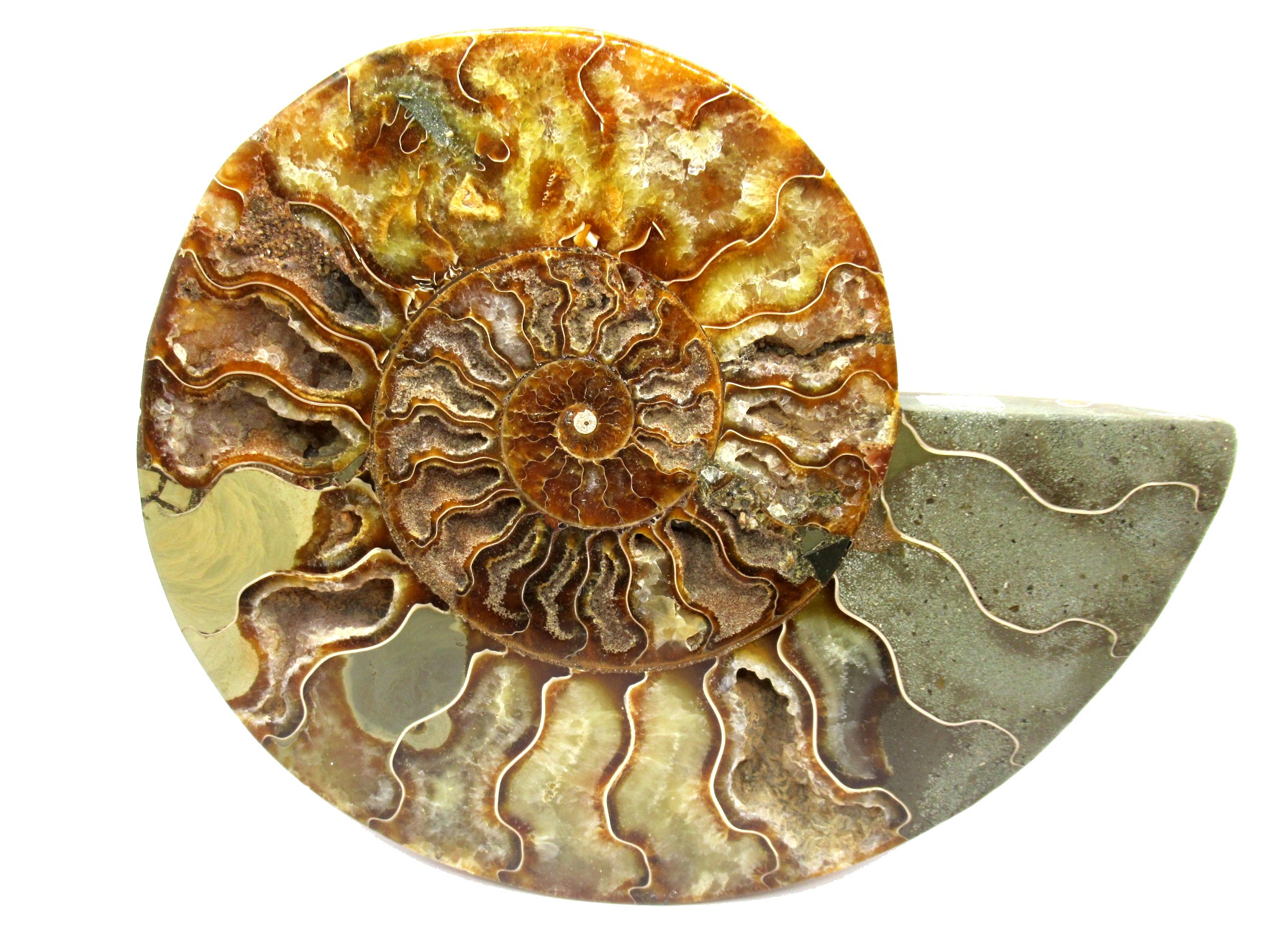 In this case the whole ammonite was sliced in half and polished. As a result you are able to see the beautiful chambers as well as the incredible colors. Because some of the chambers are hollow you can see crystals present as well.