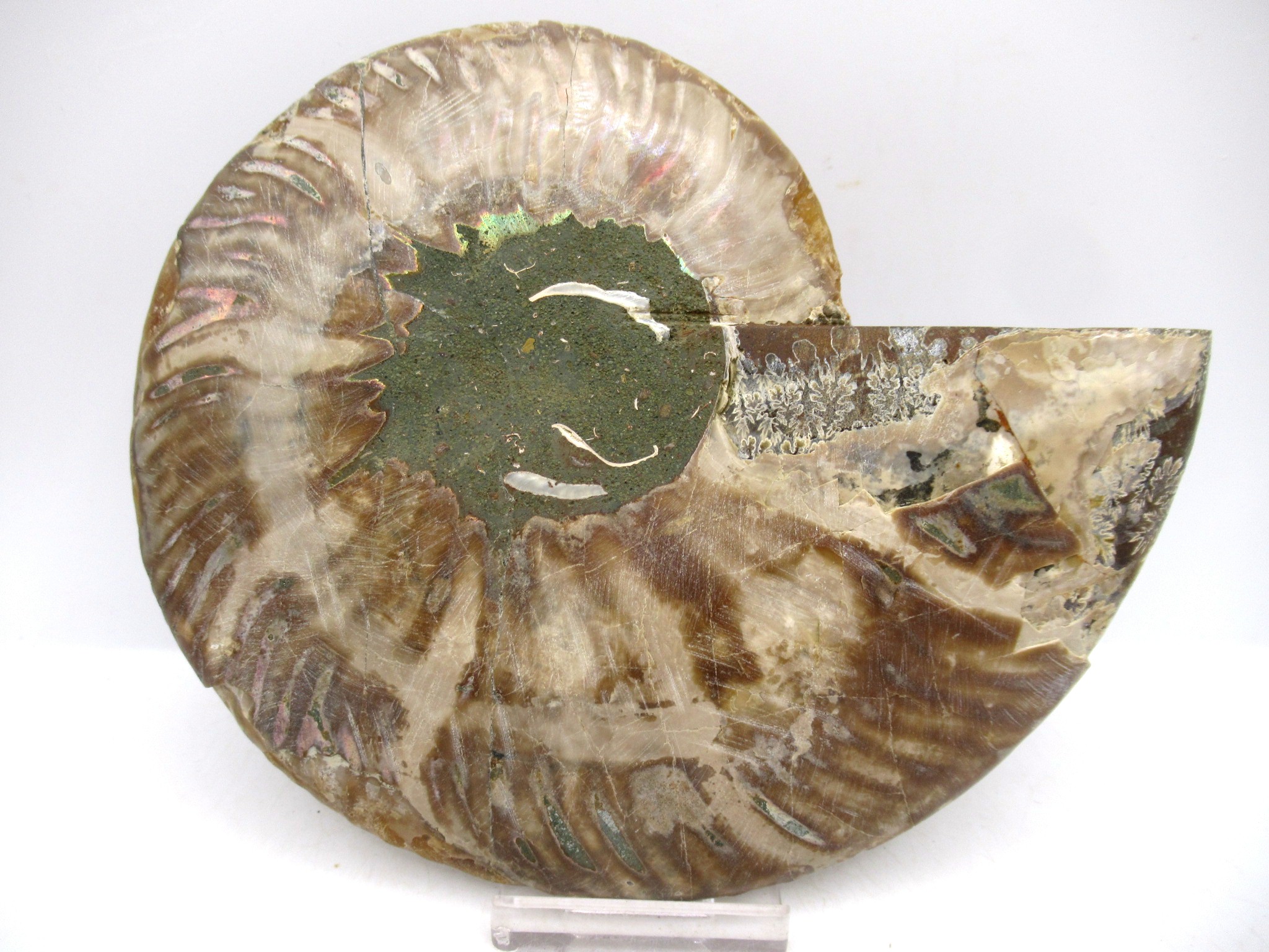 In this case the whole ammonite was sliced in half and polished. As a result you are able to see the beautiful chambers as well as the incredible colors. Because some of the chambers are hollow you can see crystals present as well.