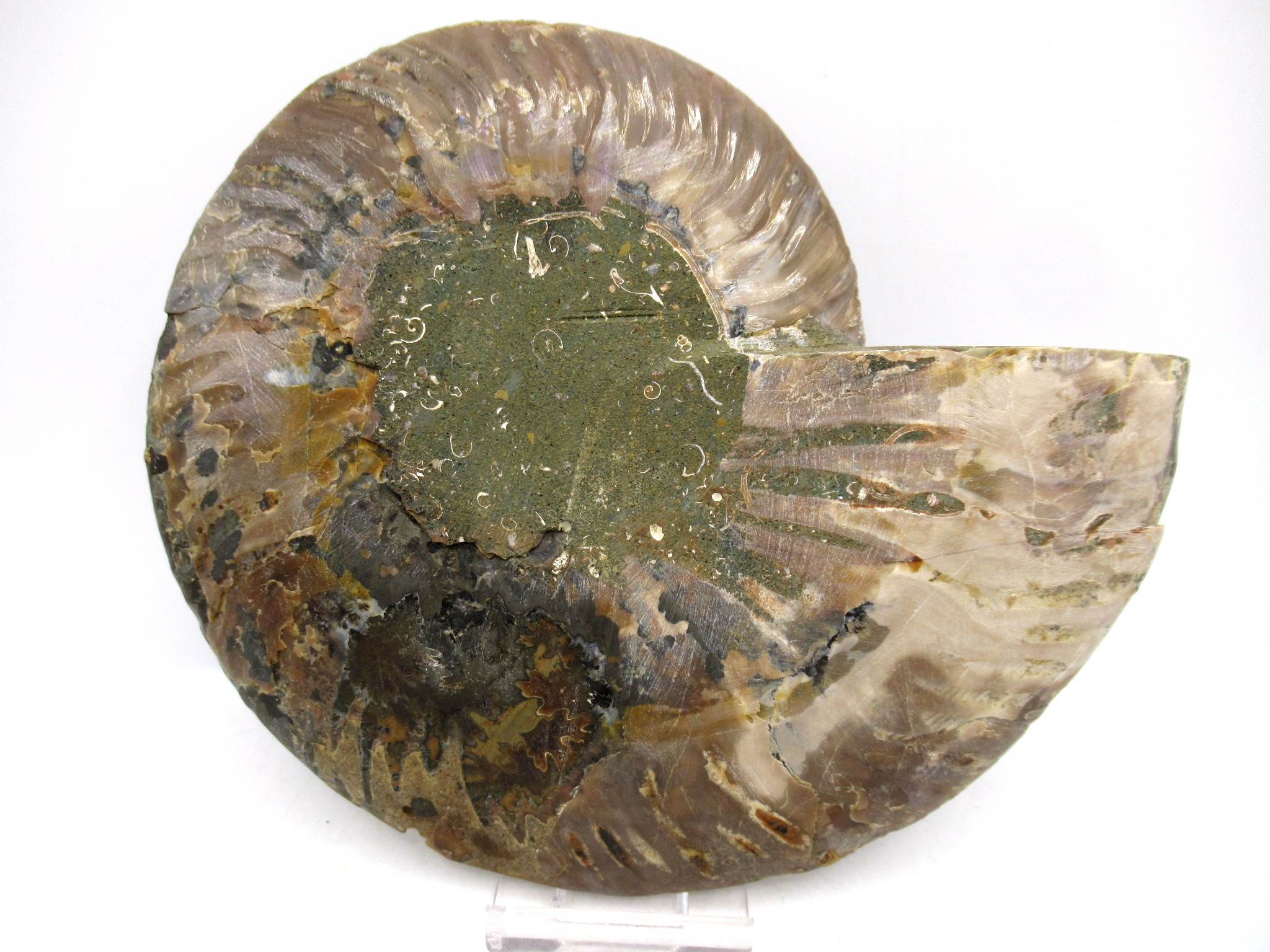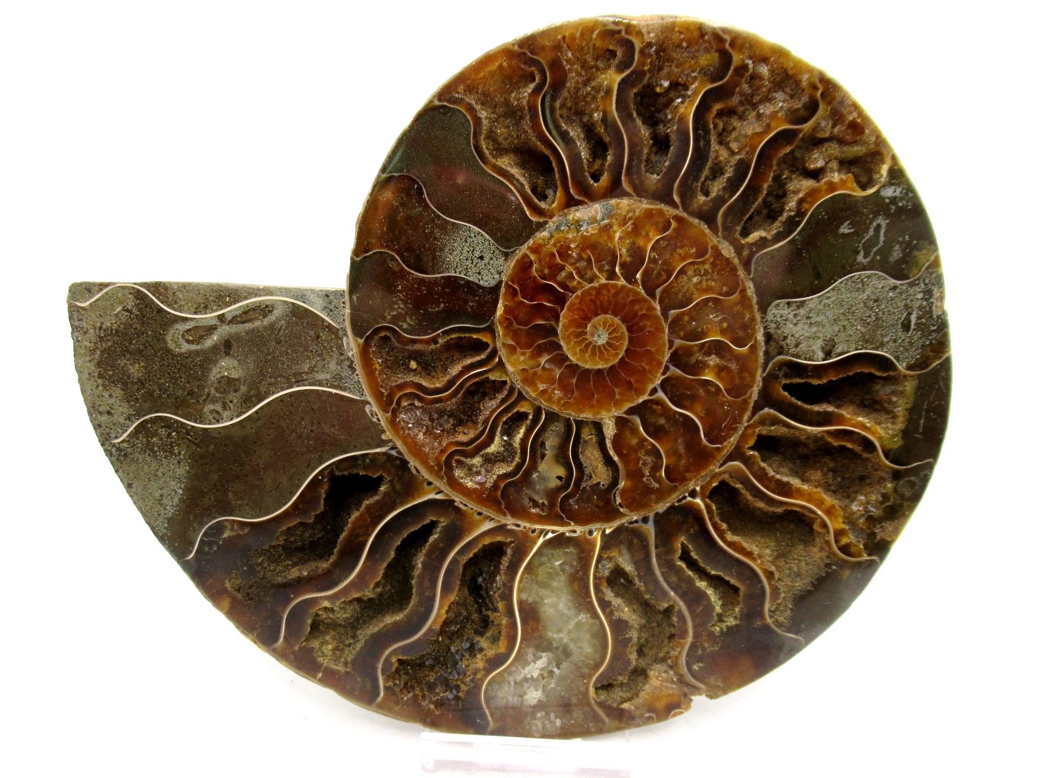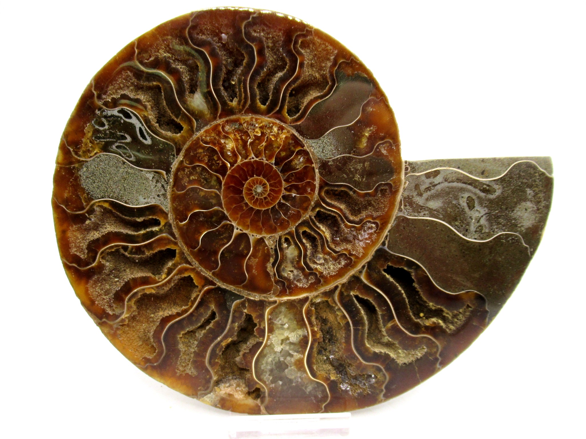 In this case the whole ammonite was sliced in half and polished. As a result you are able to see the beautiful chambers as well as the incredible colors. Because some of the chambers are hollow you can see crystals present as well.