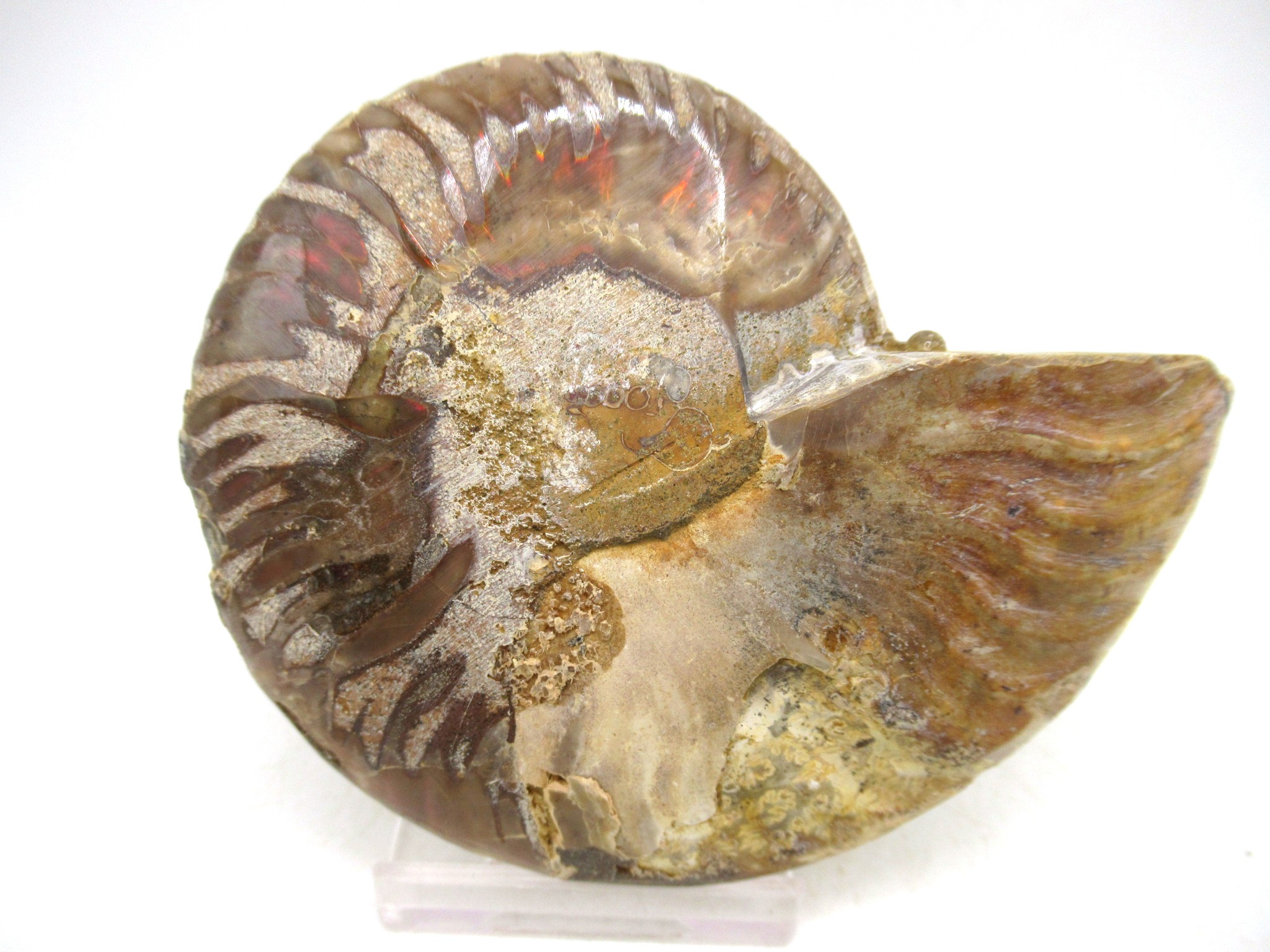 In this case the whole ammonite was sliced in half and polished. As a result you are able to see the beautiful chambers as well as the incredible colors. Because some of the chambers are hollow you can see crystals present as well.