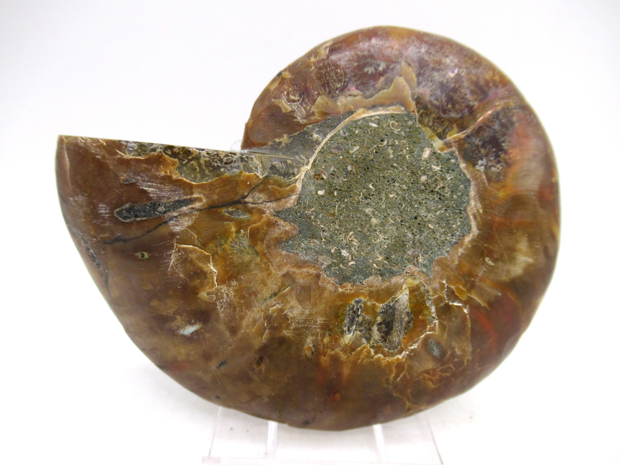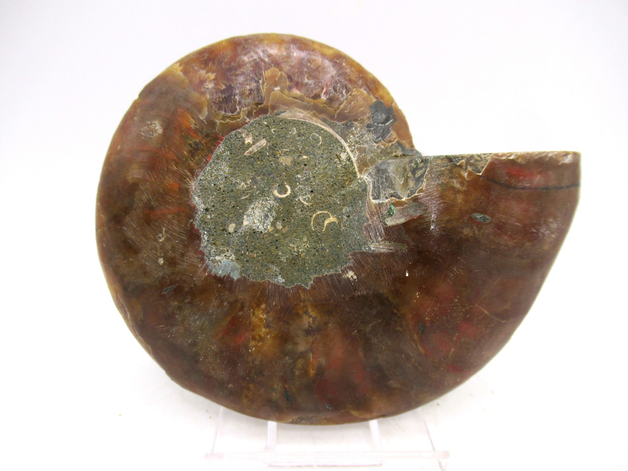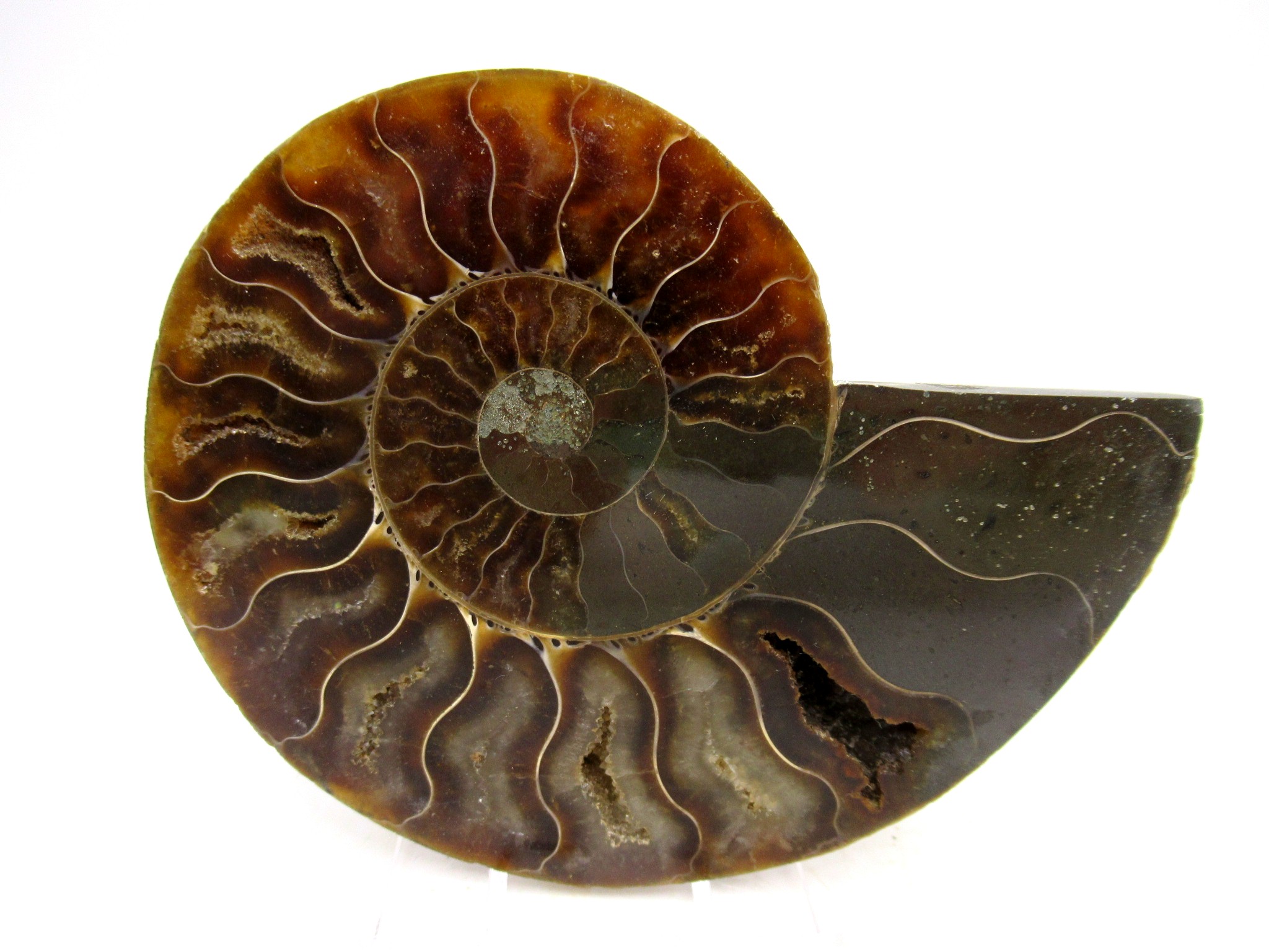 In this case the whole ammonite was sliced in half and polished. As a result you are able to see the beautiful chambers as well as the incredible colors. Because some of the chambers are hollow you can see crystals present as well.