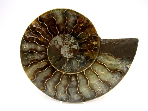 In this case the whole ammonite was sliced in half and polished.  As a result you are able to see the beautiful chambers as well as the incredible colors.  Because some of the chambers are hollow you can see crystals present as well.