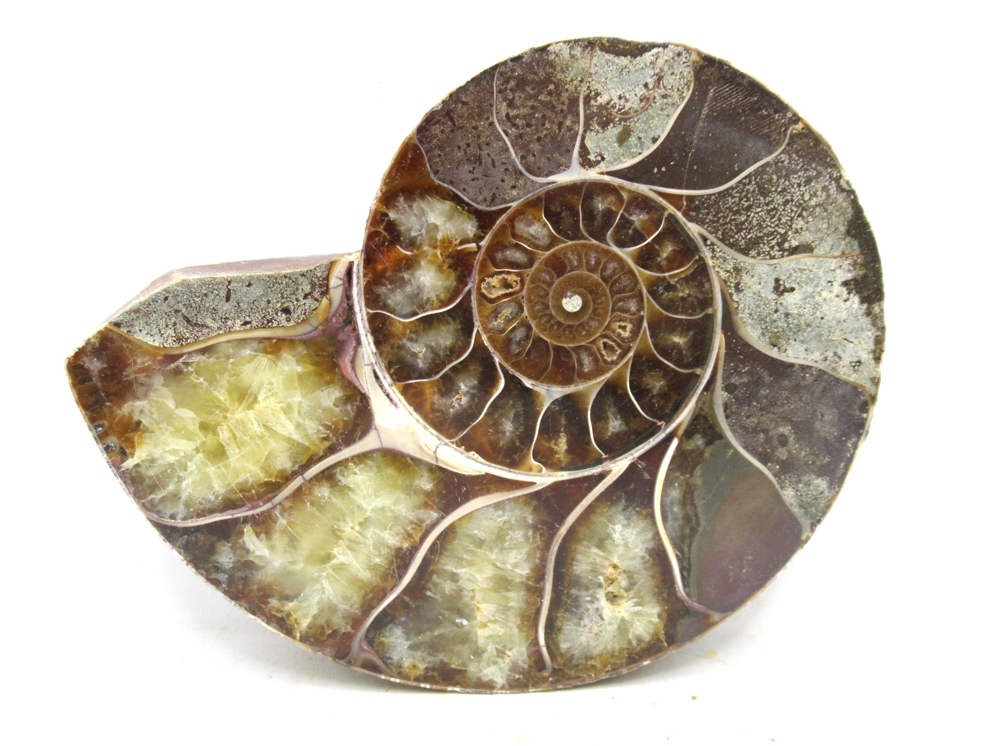 - This beautiful cut & polished specimen shows off the internal chambers as well as the outer shell!