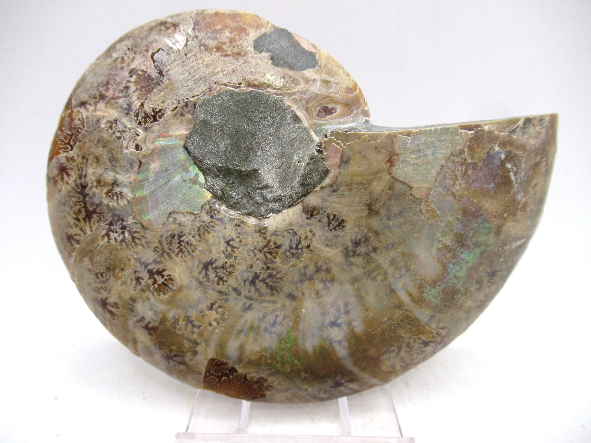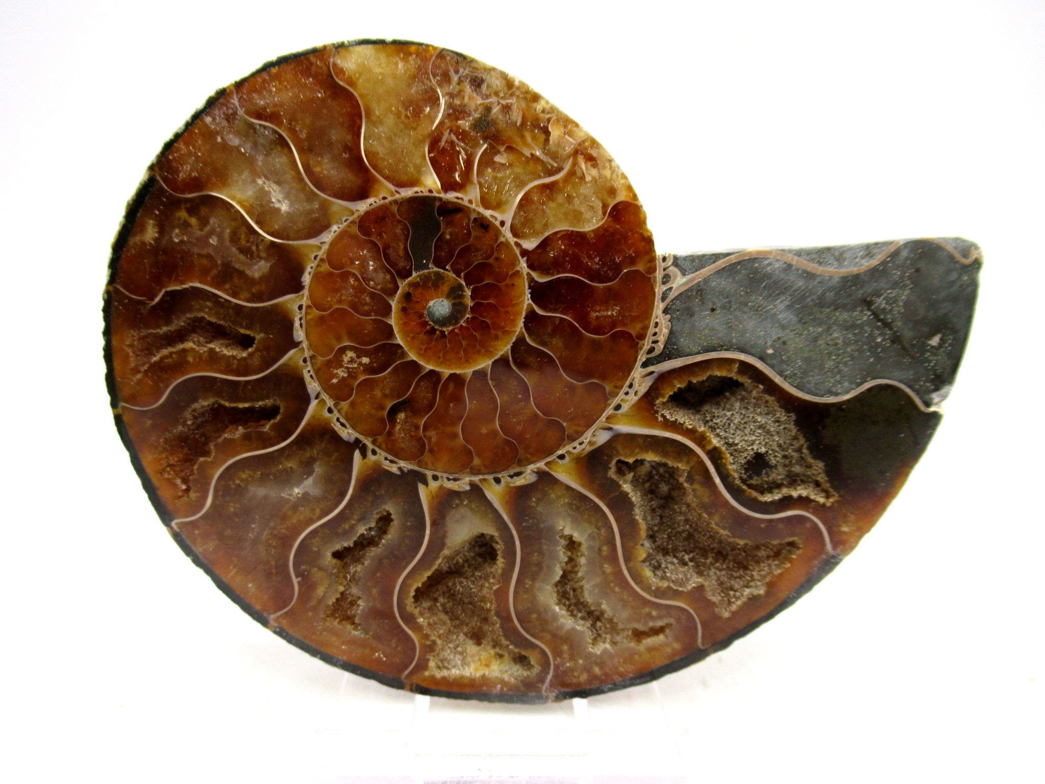 In this case the whole ammonite was sliced in half and polished. As a result you are able to see the beautiful chambers as well as the incredible colors. Because some of the chambers are hollow you can see crystals present as well.