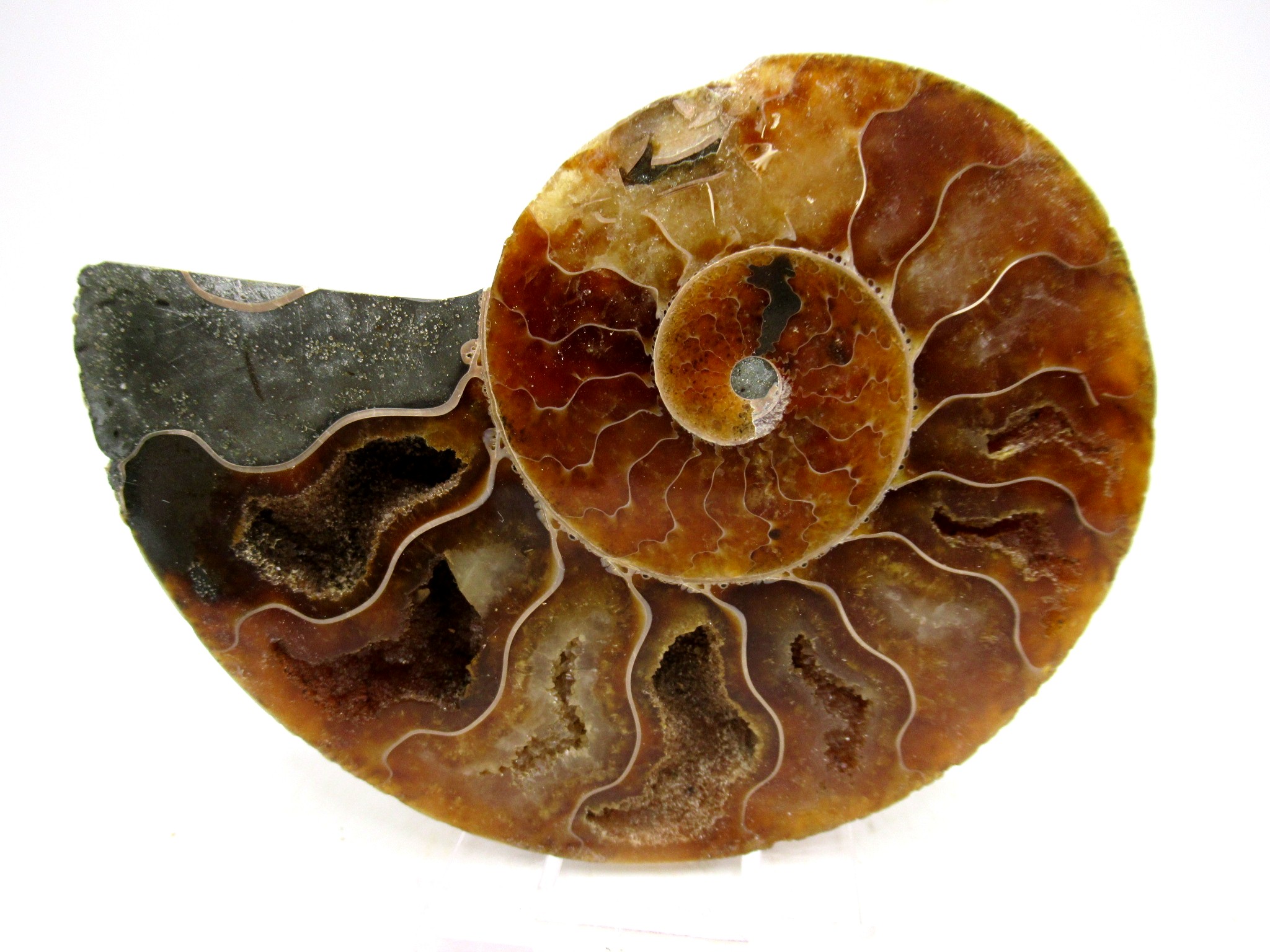 - This beautiful cut & polished specimen shows off the internal chambers as well as the outer shell!
