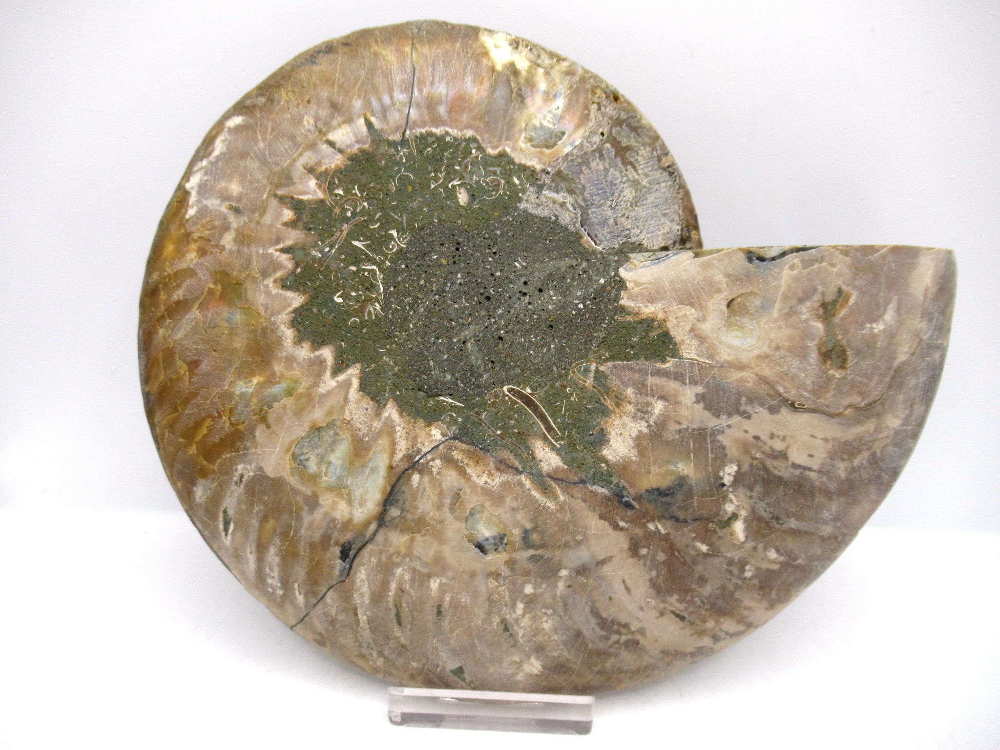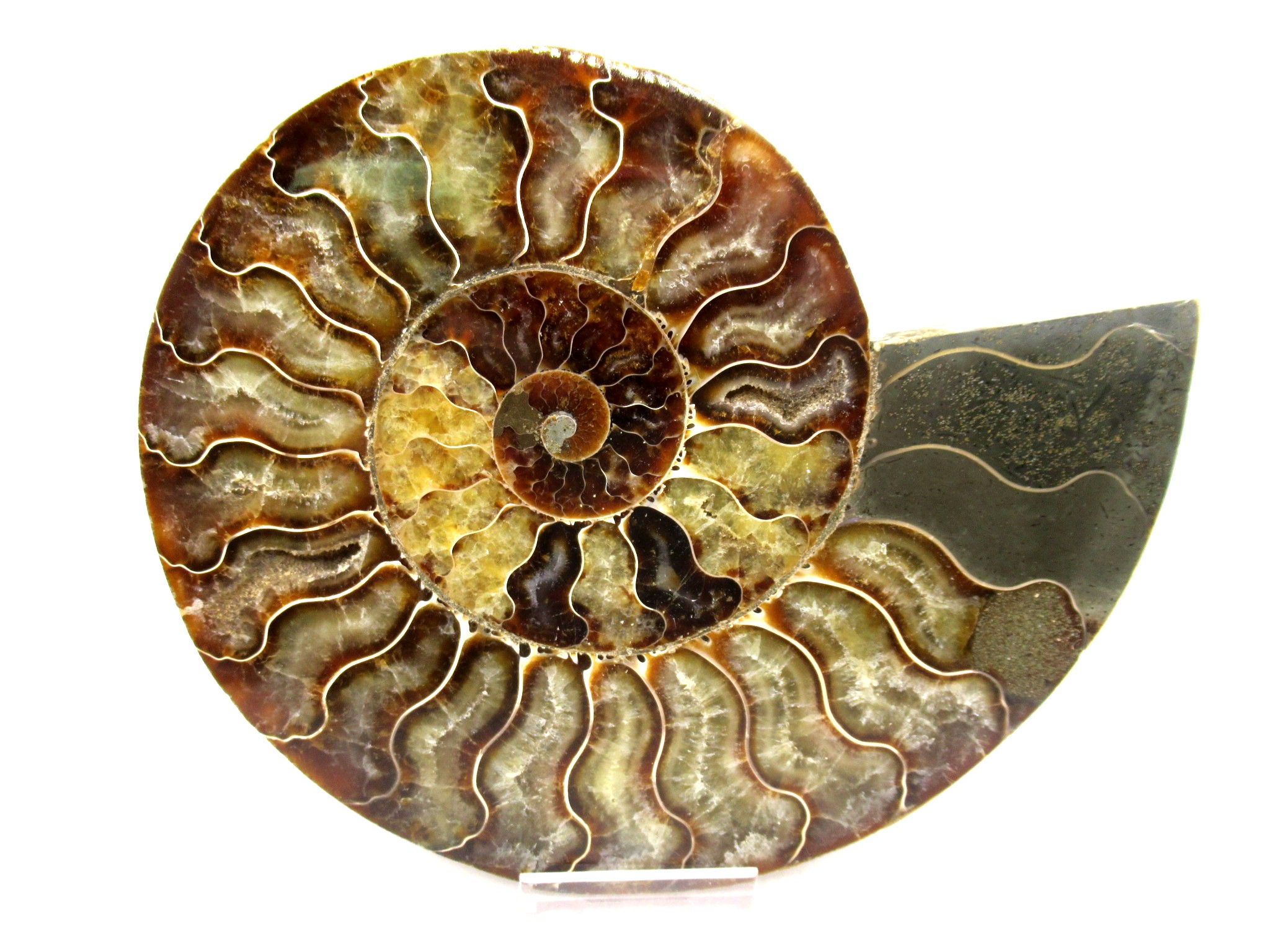 In this case the whole ammonite was sliced in half and polished. As a result you are able to see the beautiful chambers as well as the incredible colors. Because some of the chambers are hollow you can see crystals present as well.