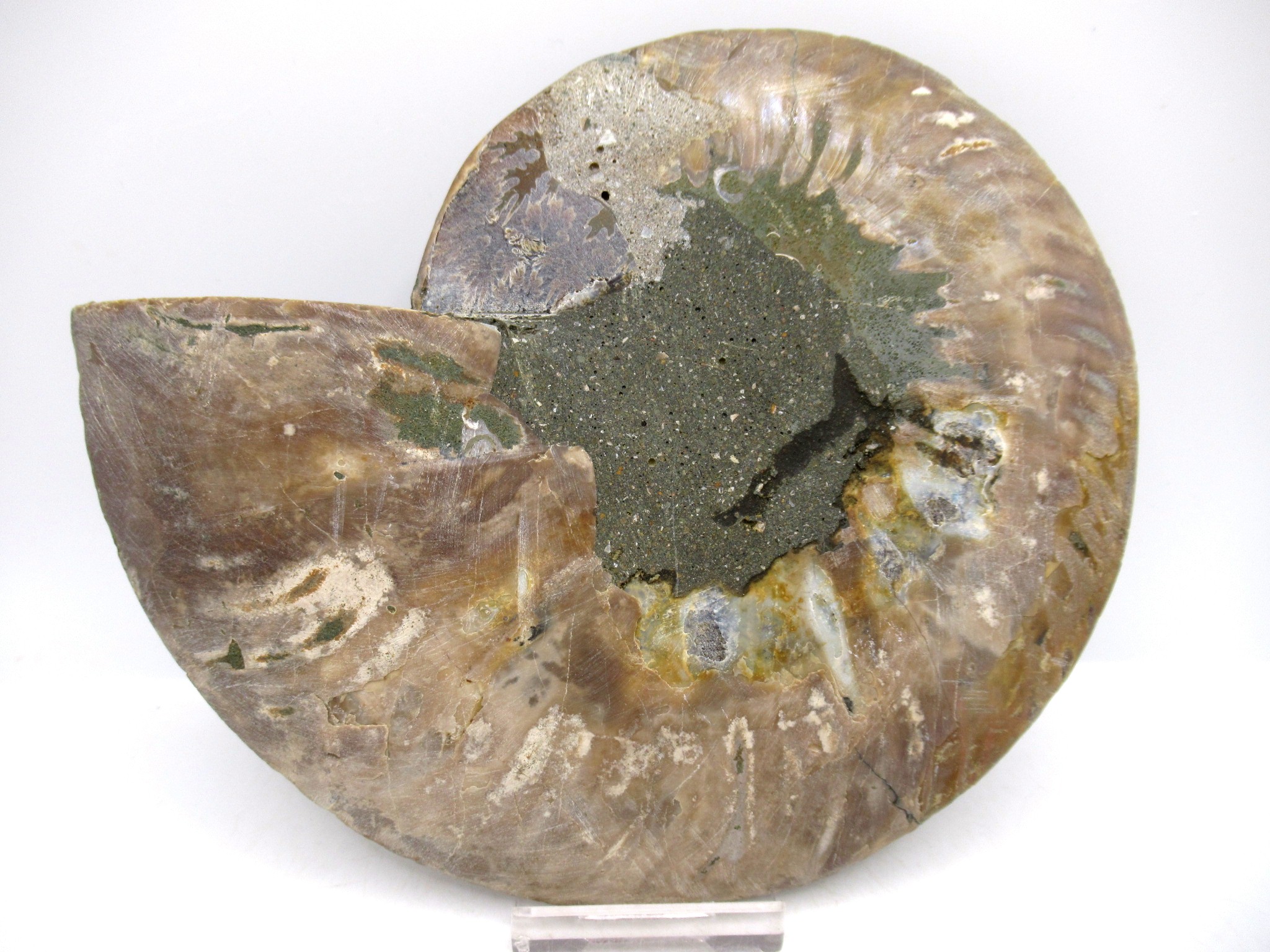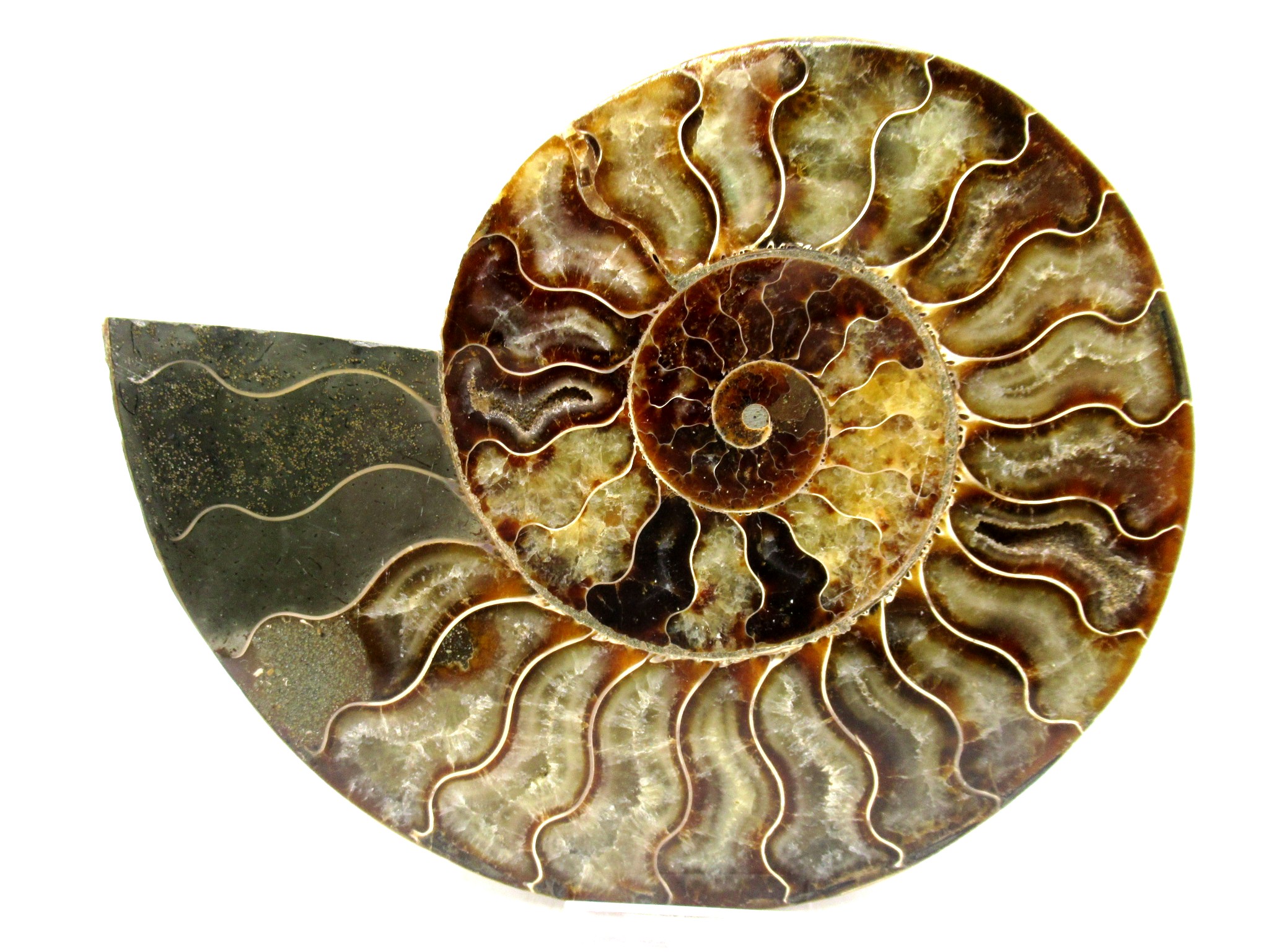 - This beautiful cut & polished specimen shows off the internal chambers as well as the outer shell!