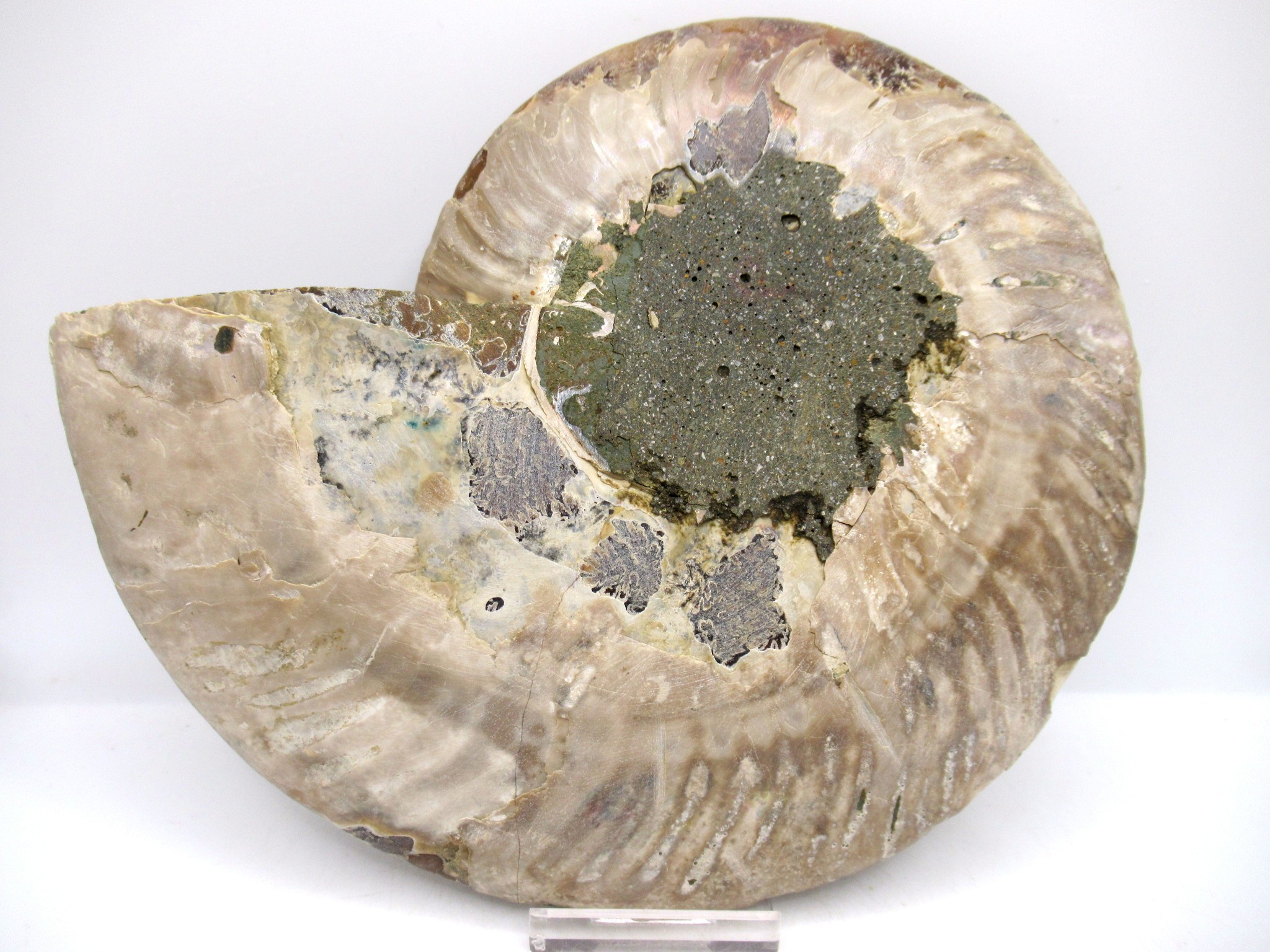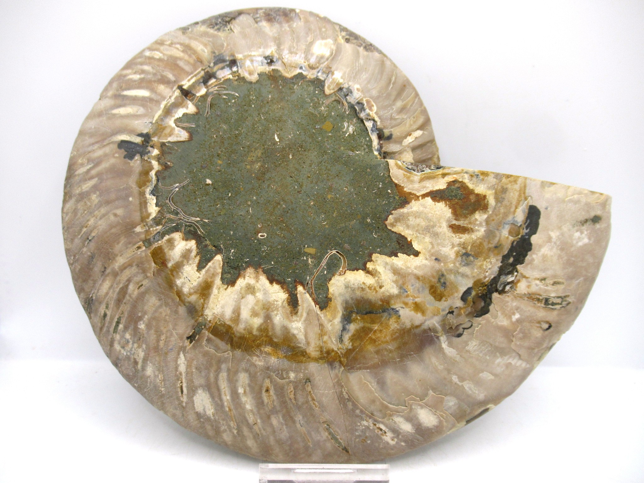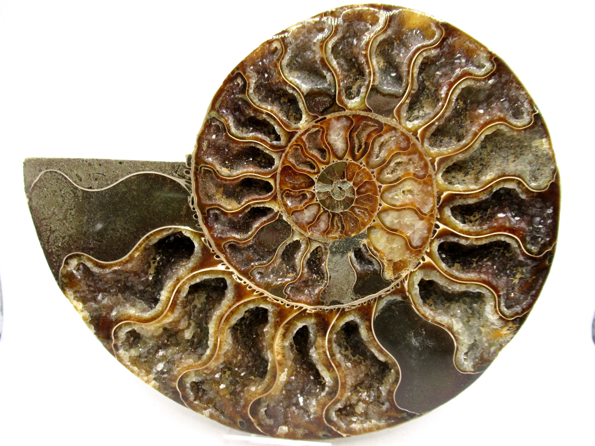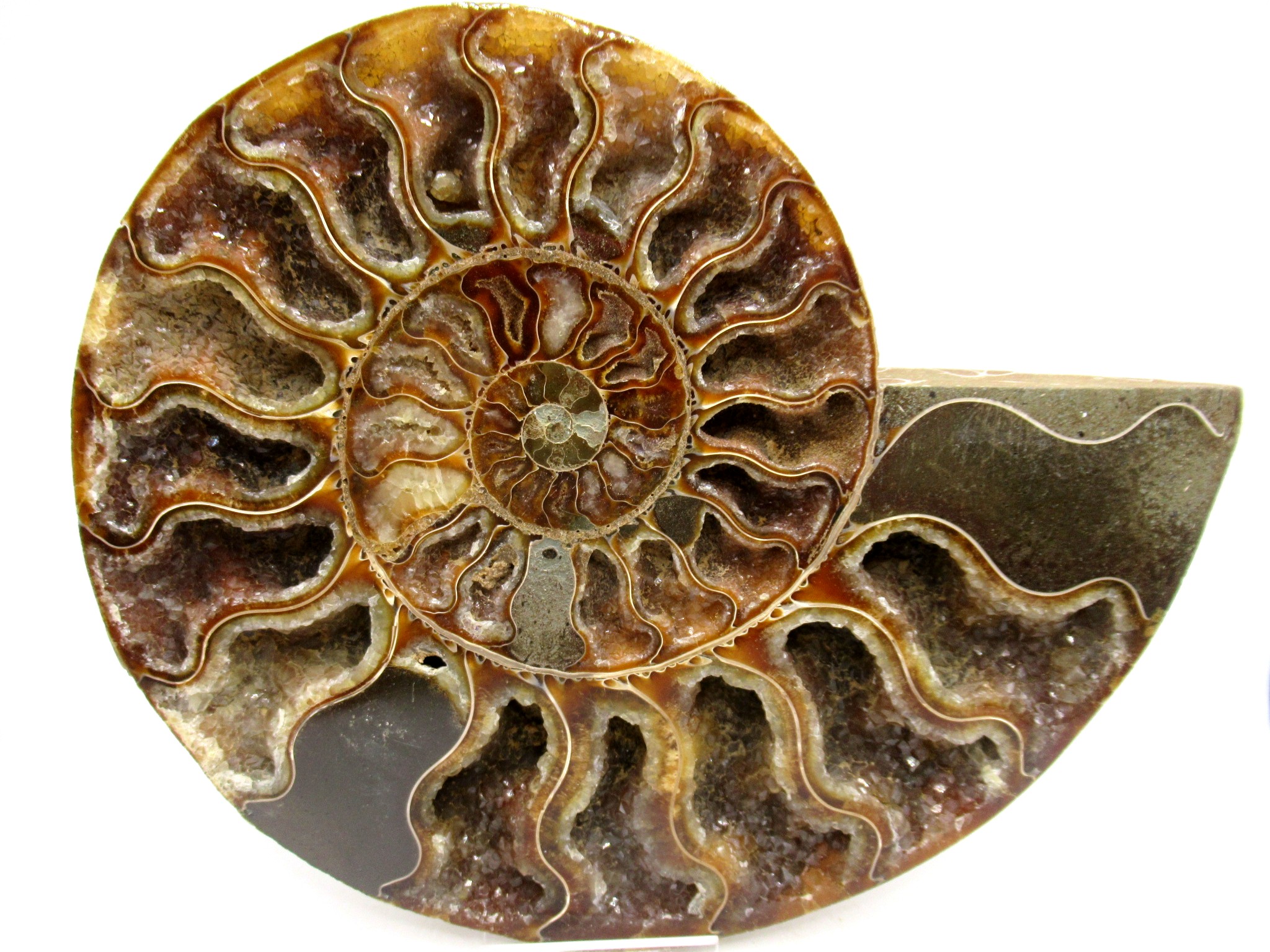 In this case the whole ammonite was sliced in half and polished.  As a result you are able to see the beautiful chambers as well as the incredible colors.  Because some of the chambers are hollow you can see crystals present as well.