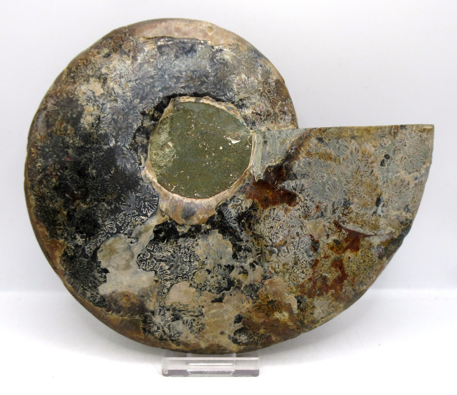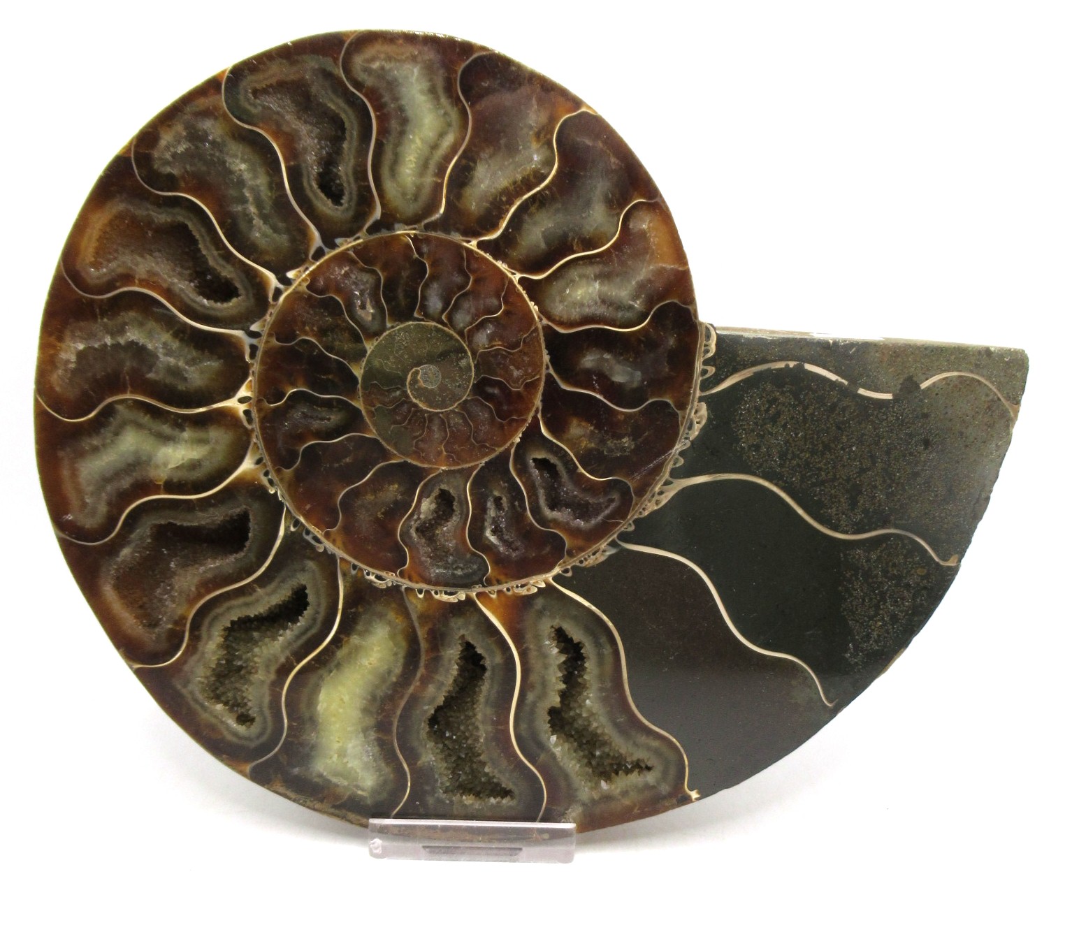 In this case the whole ammonite was sliced in half and polished. As a result you are able to see the beautiful chambers as well as the incredible colors. Because some of the chambers are hollow you can see crystals present as well.