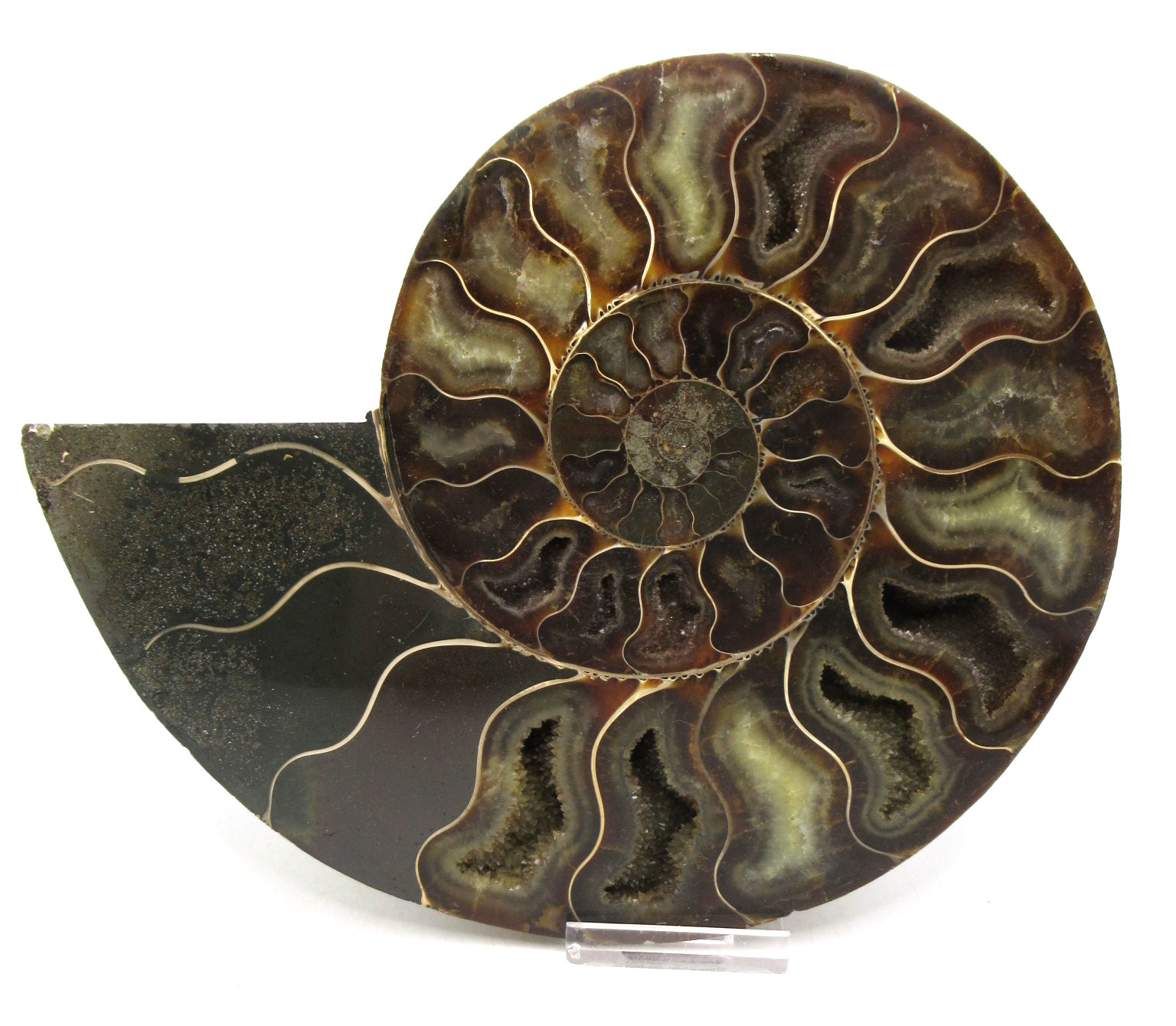 - This beautiful cut & polished specimen shows off the internal chambers as well as the outer shell!