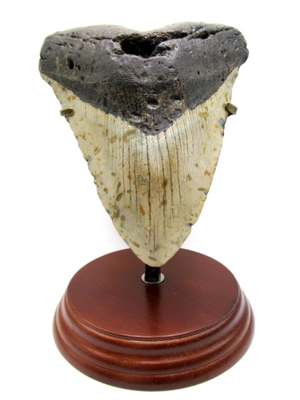 - Specimen measures 5.70″ long along the longest side of the tooth. It will come with the metal and wooden stand as shown.