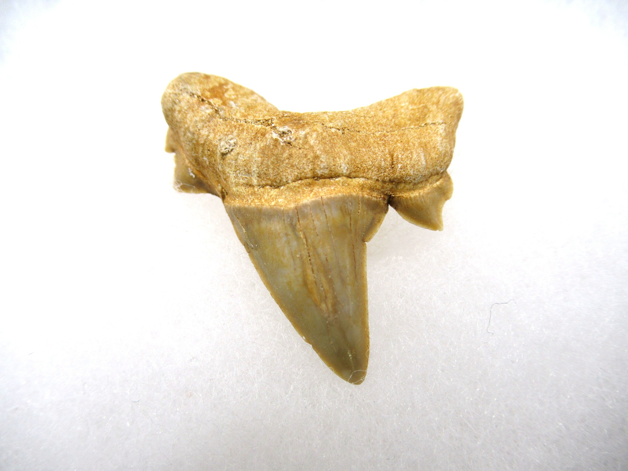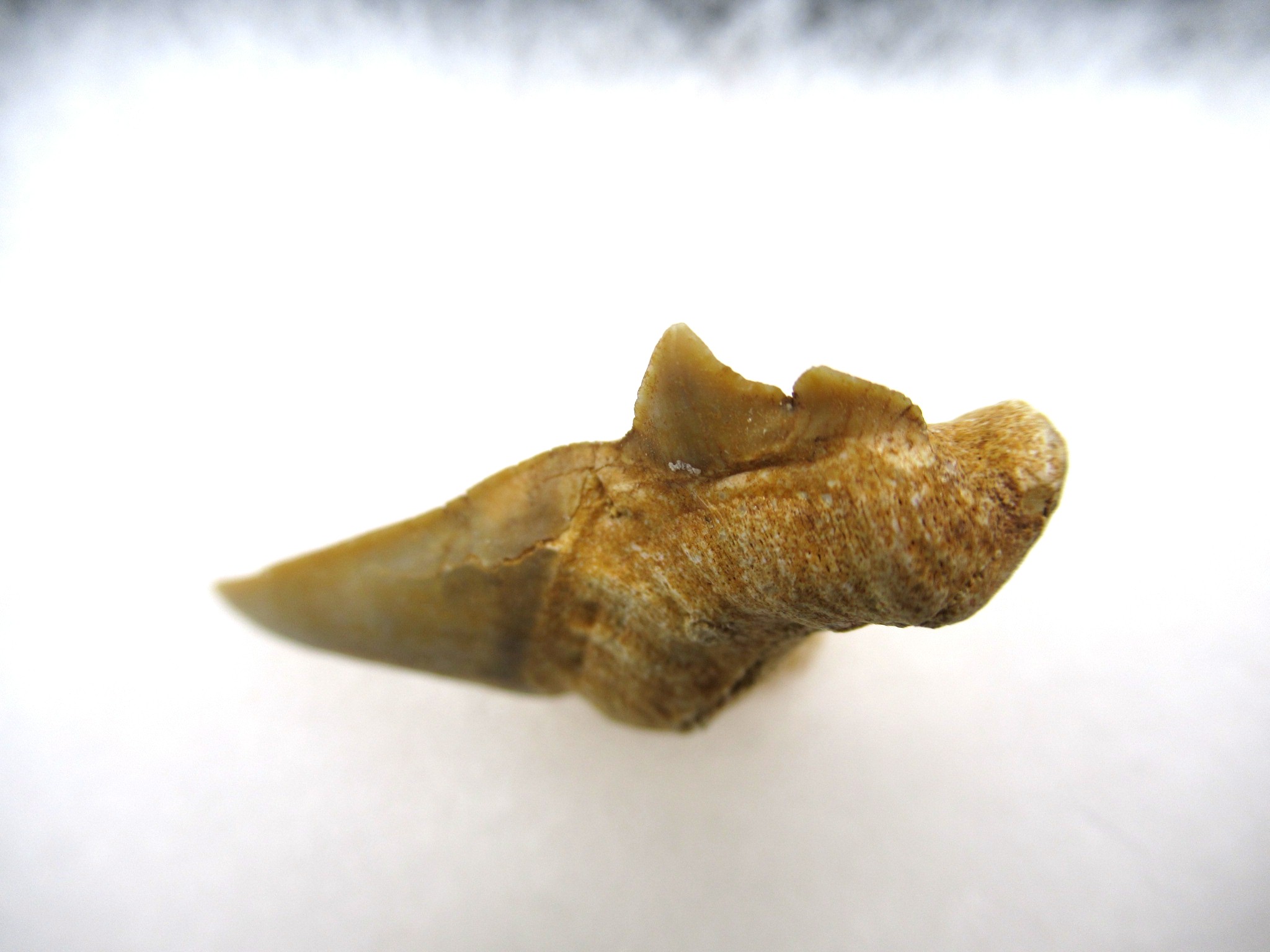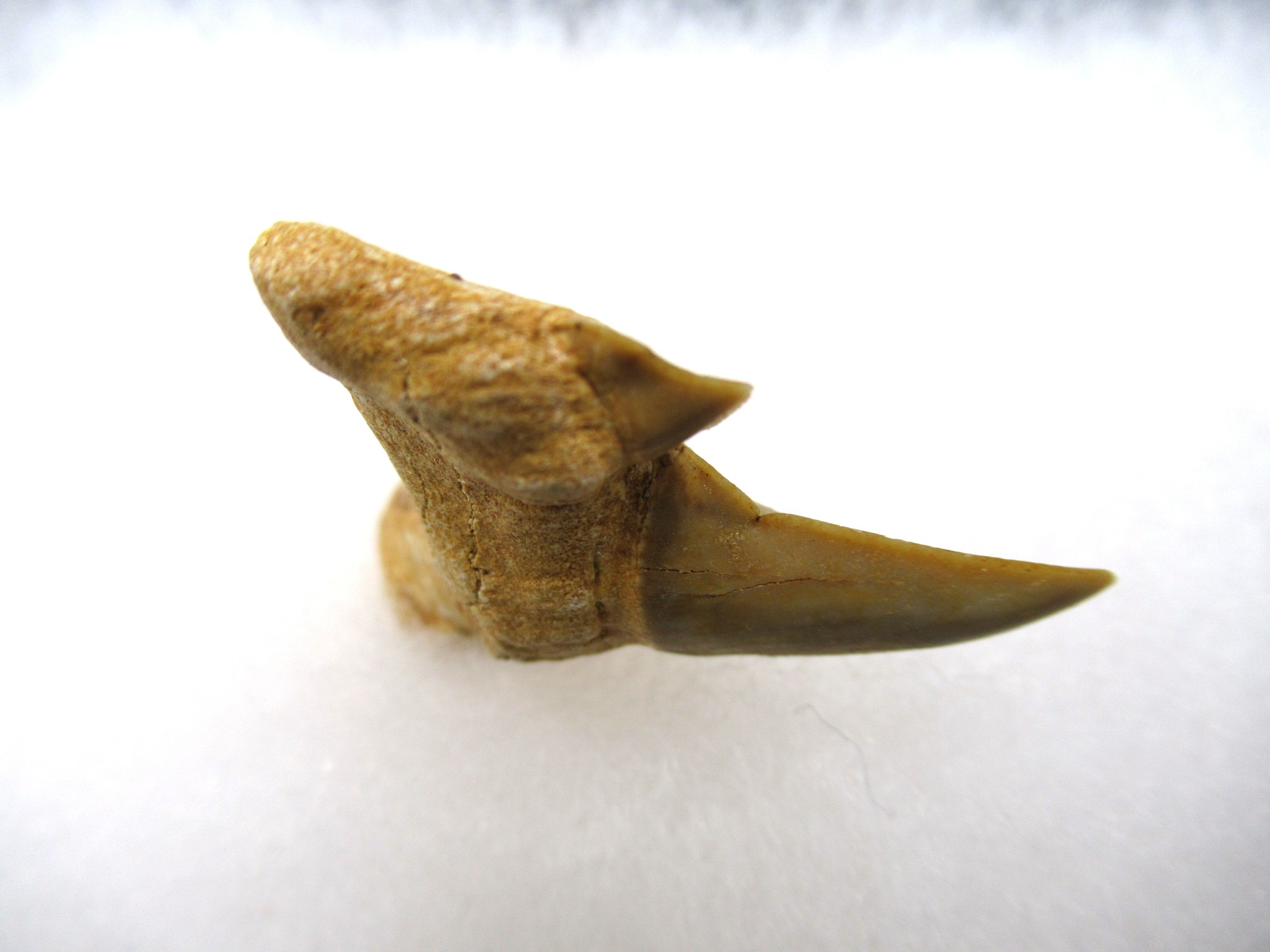 Pathological shark teeth are developmental abnormalities commonly found in the shark tooth fossil record that may be caused by a variety of reasons: genetic mutation, damaged or immature teeth. Pathological teeth develop with distorted or disfigured crowns,