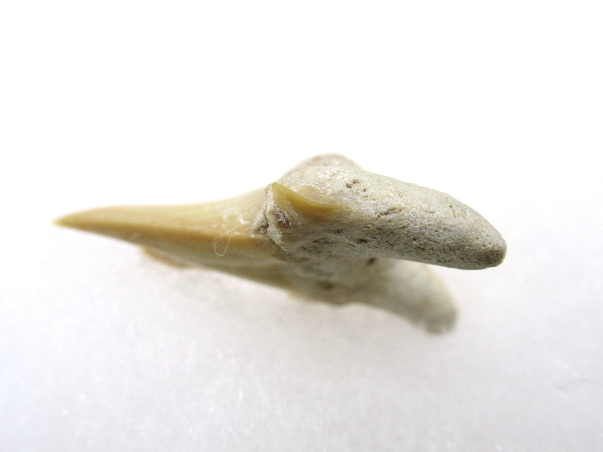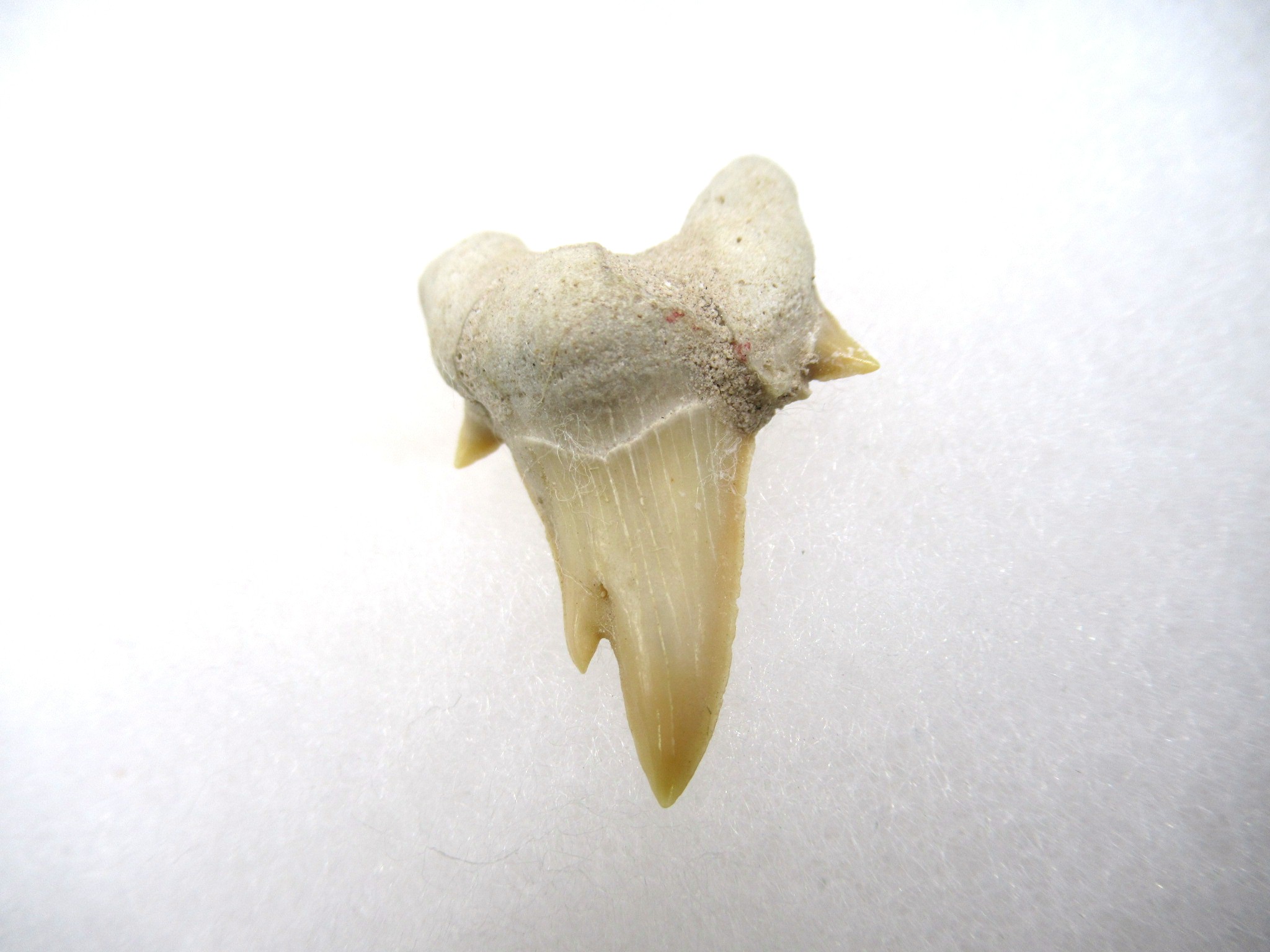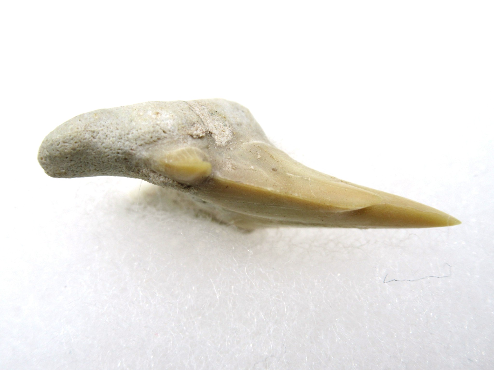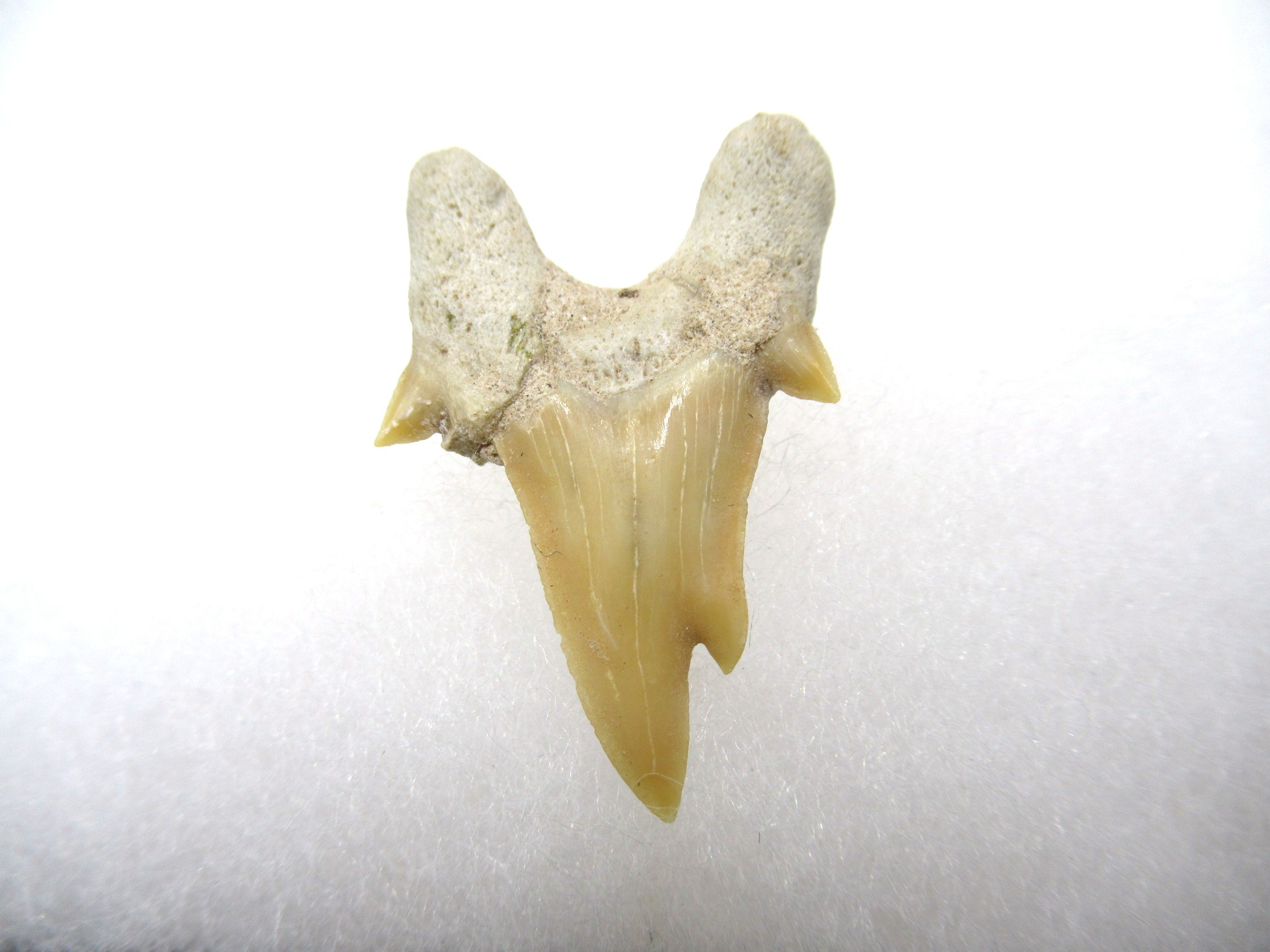 Pathological shark teeth are developmental abnormalities commonly found in the shark tooth fossil record that may be caused by a variety of reasons: genetic mutation, damaged or immature teeth. Pathological teeth develop with distorted or disfigured crowns,