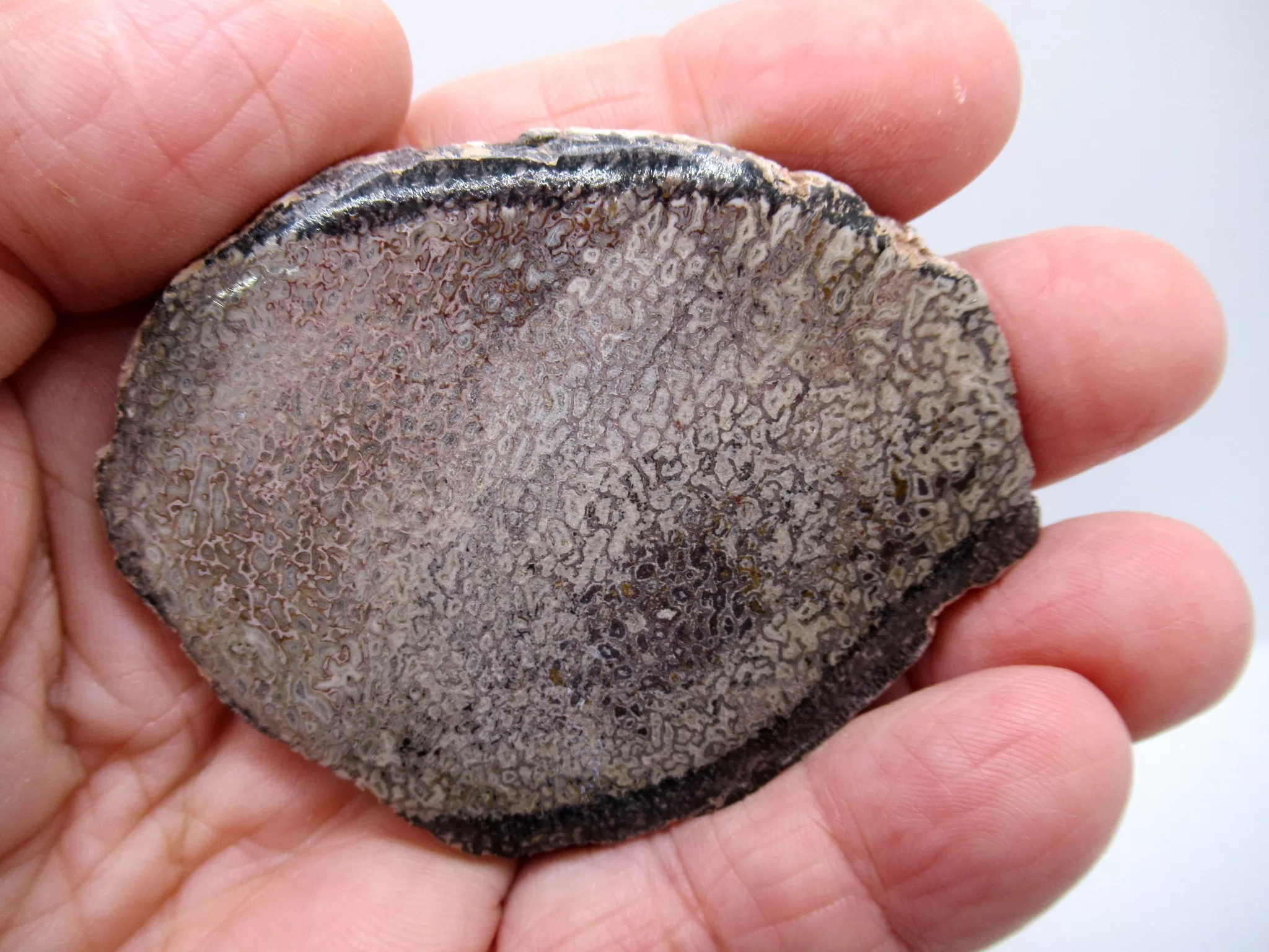 - This very nice, highly detailed cross-section of dinosaur bone measures 2.7″ wide. This specimen shows nice cell structures. The slab is predominantly blacks, whites, grays and browns with some hints of greens. Very pretty!