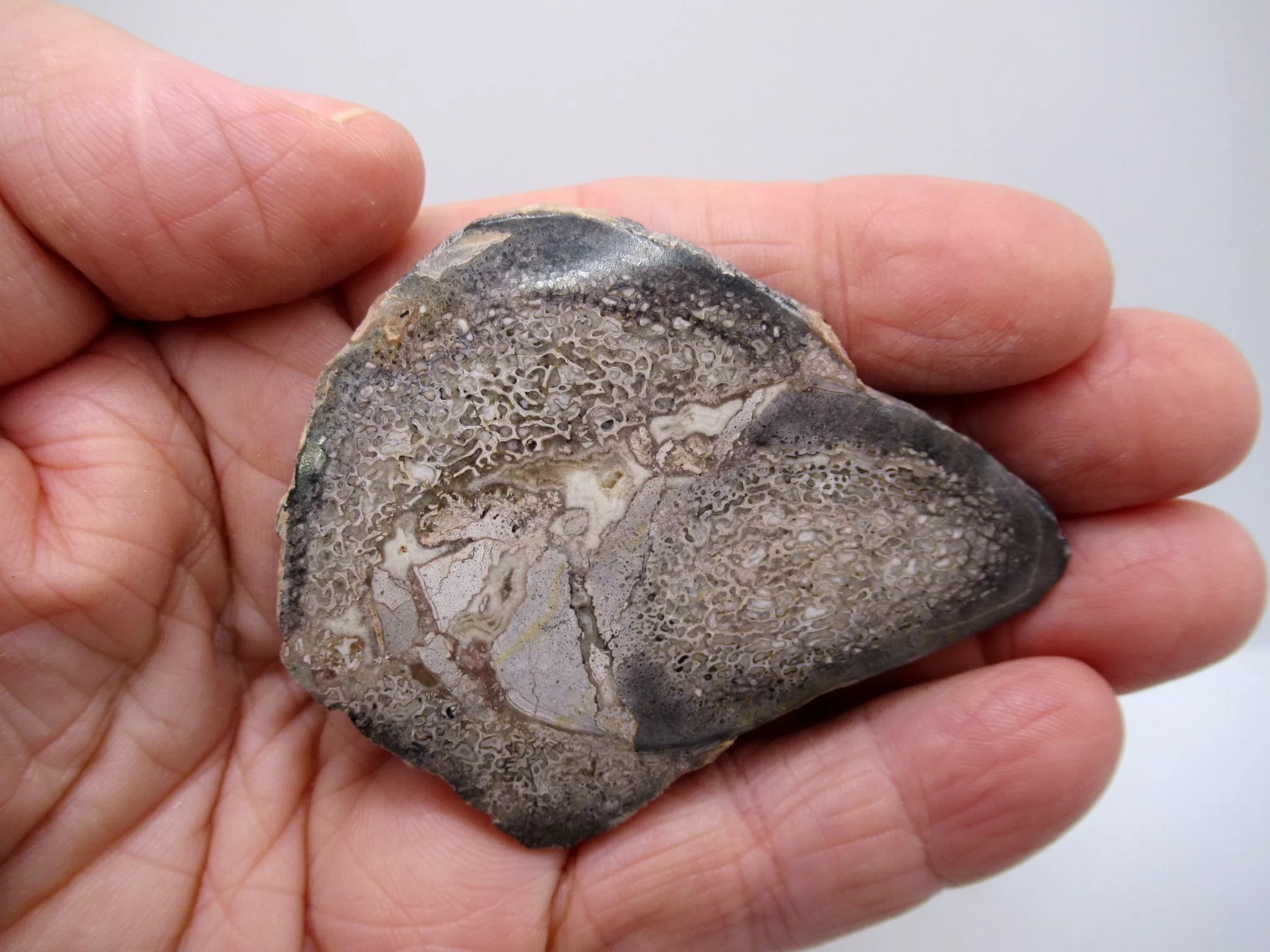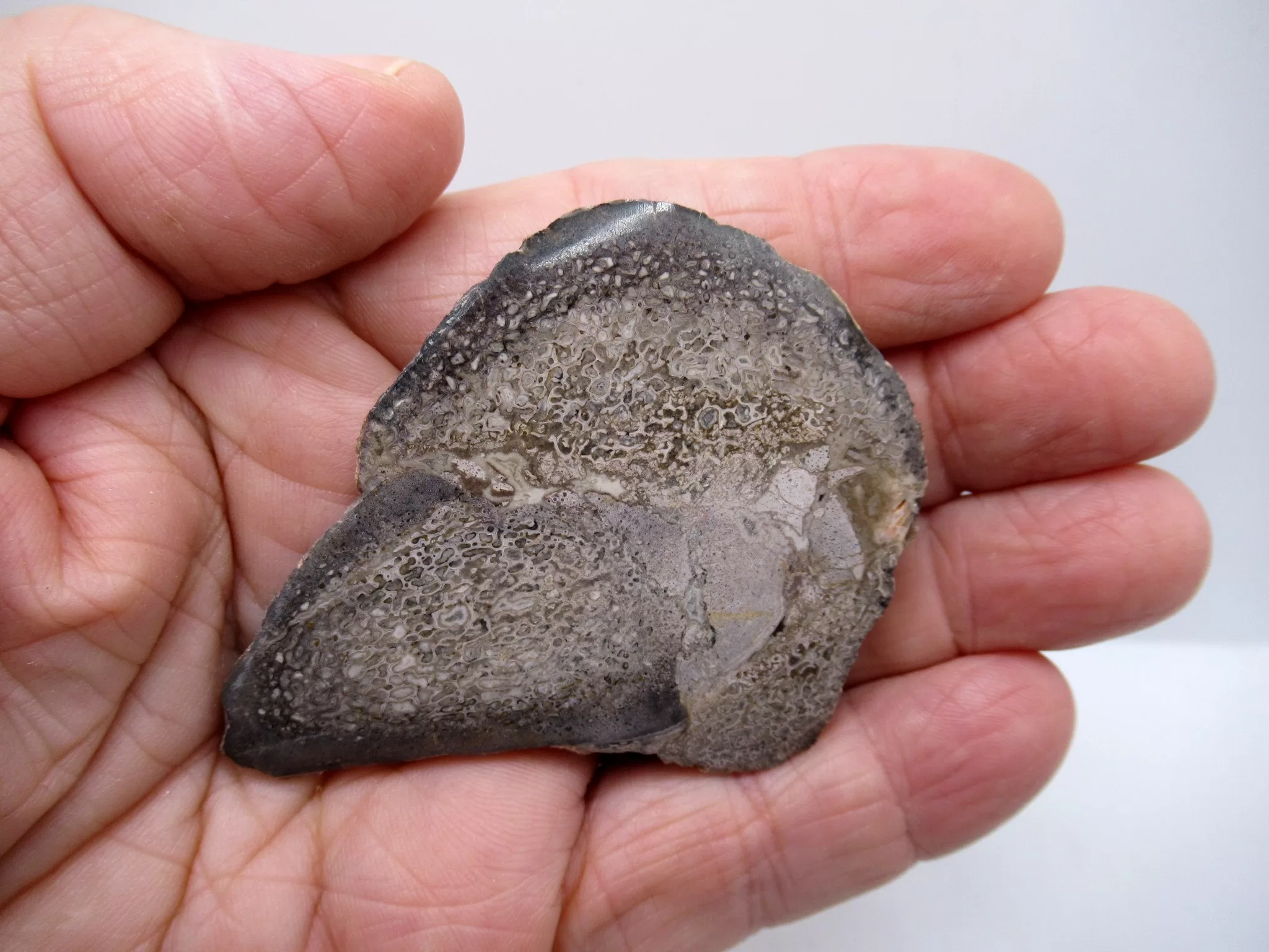 • This very nice, highly detailed cross-section of dinosaur bone measures  2.71″ wide. This specimen shows nice cell structures. The slab is predominantly blacks, whites, grays and browns with some hints of greens. Very pretty!